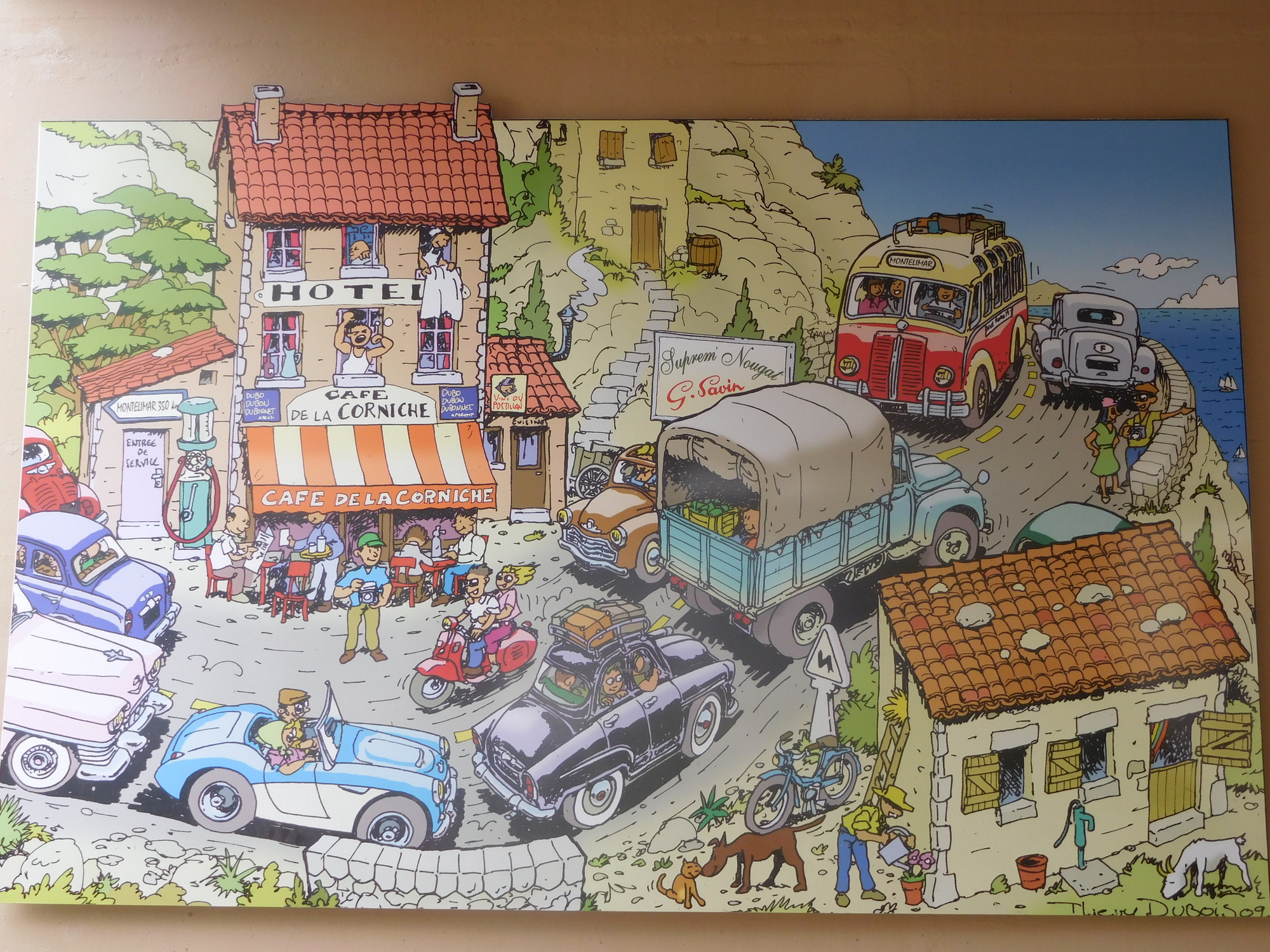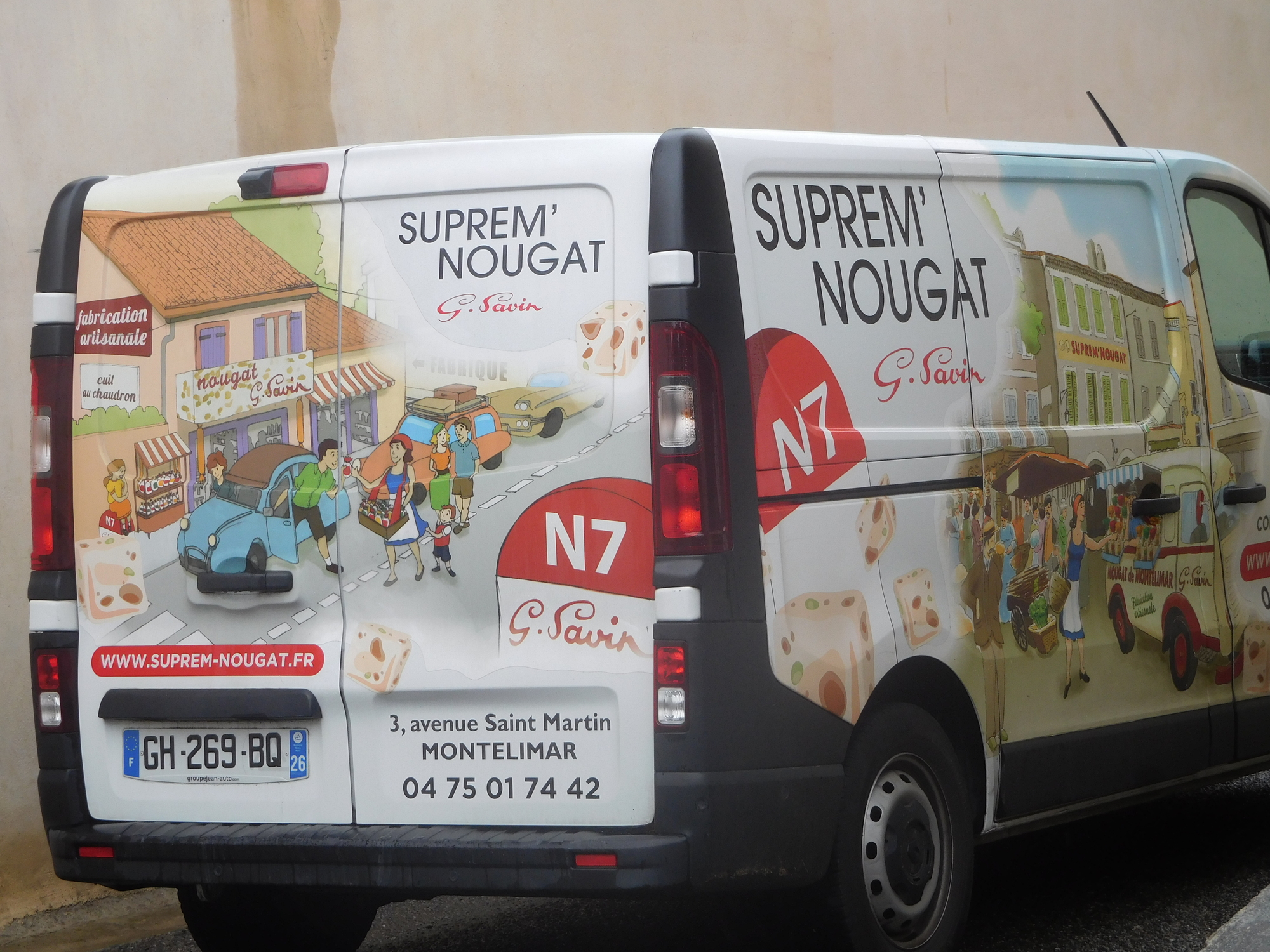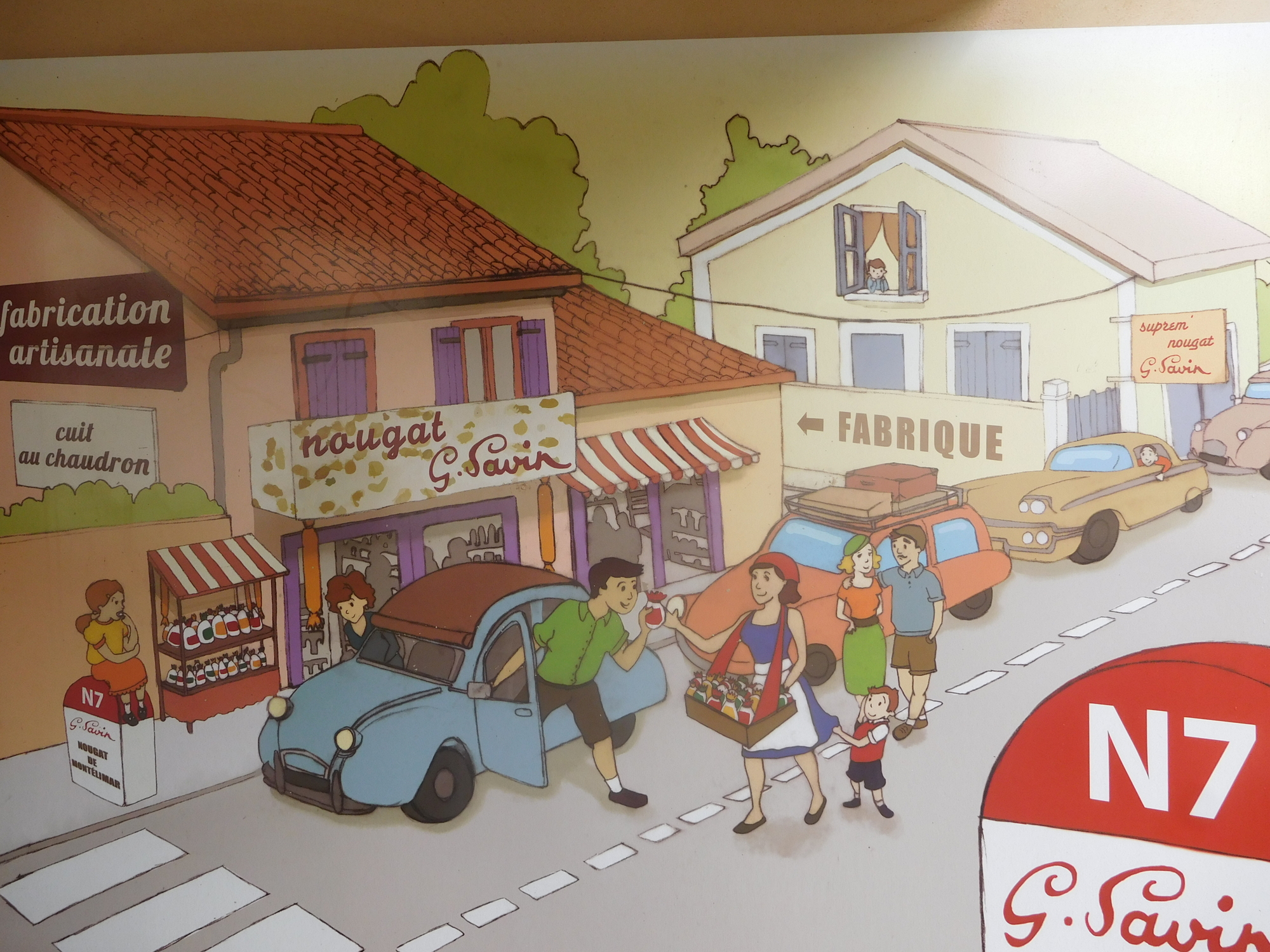 Suprem' is located on the National 7, which used to be the main drag from Paris to Marseille. It was a summer holiday thing, and the nougat shop thrived from the traffic. Times have changed, but the nougat is now even more famous and exported to many countries. Suprem' however still harkens to the National 7 days, and has a series of iconic trademark paintings (from 2009) highlighting those days. We find them charming.