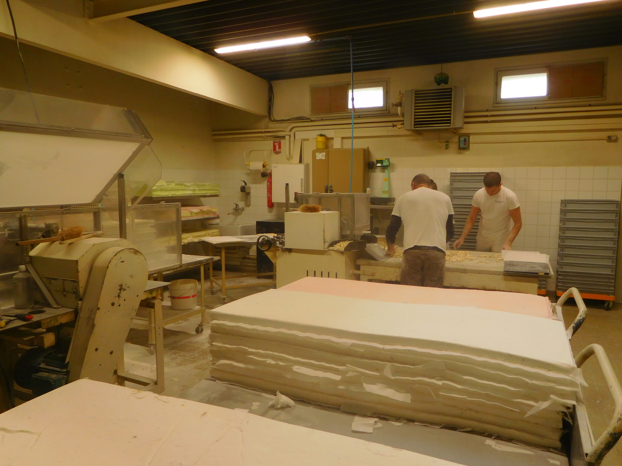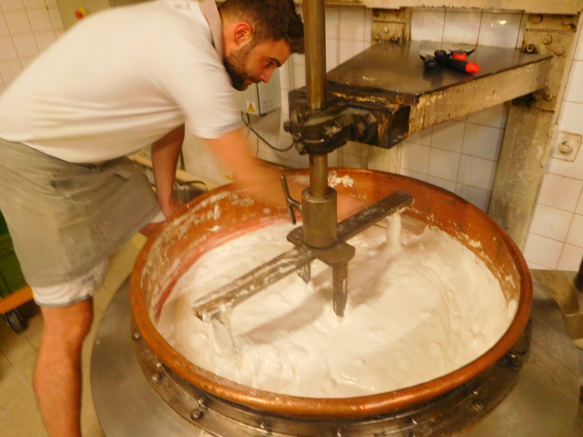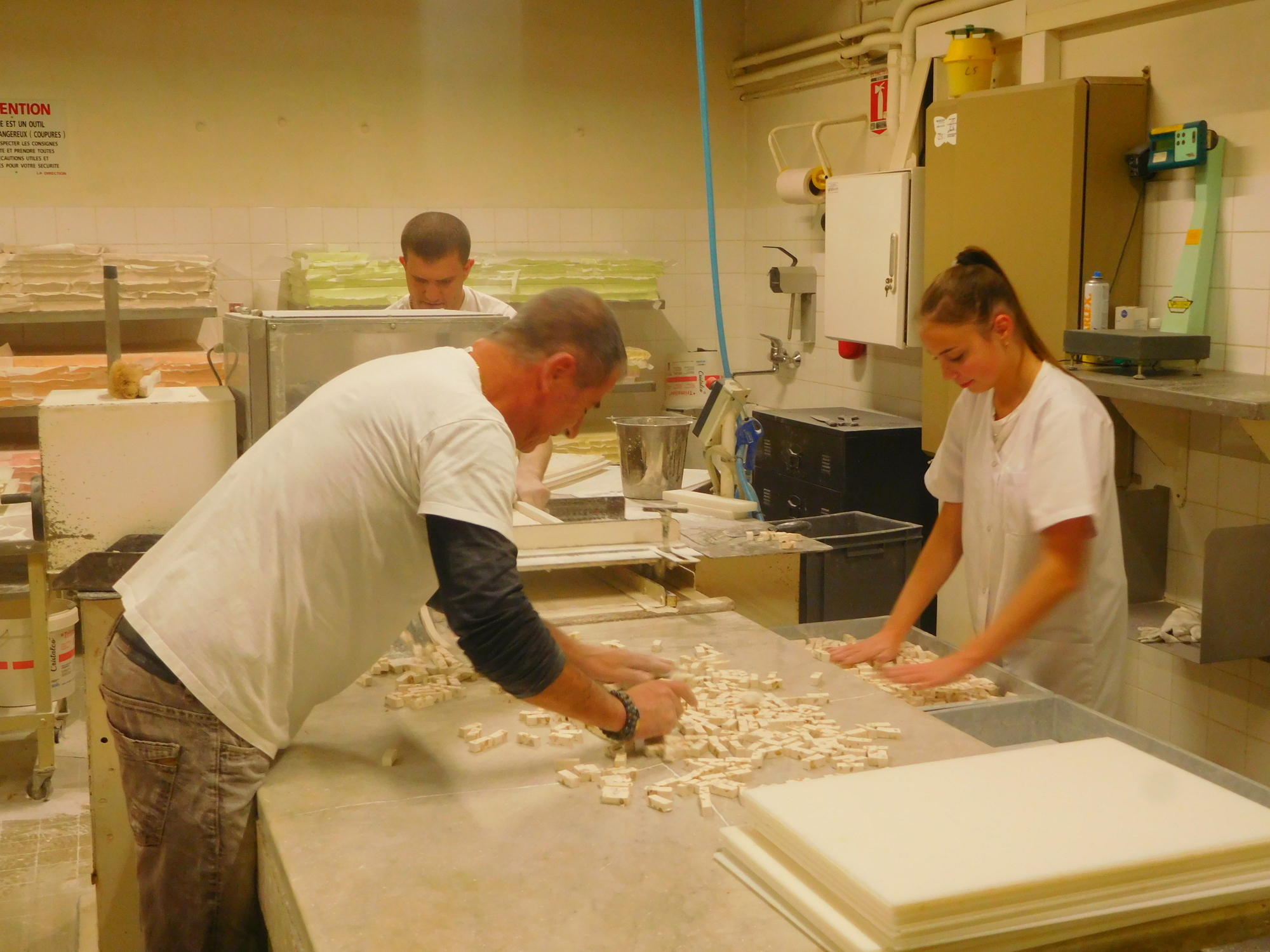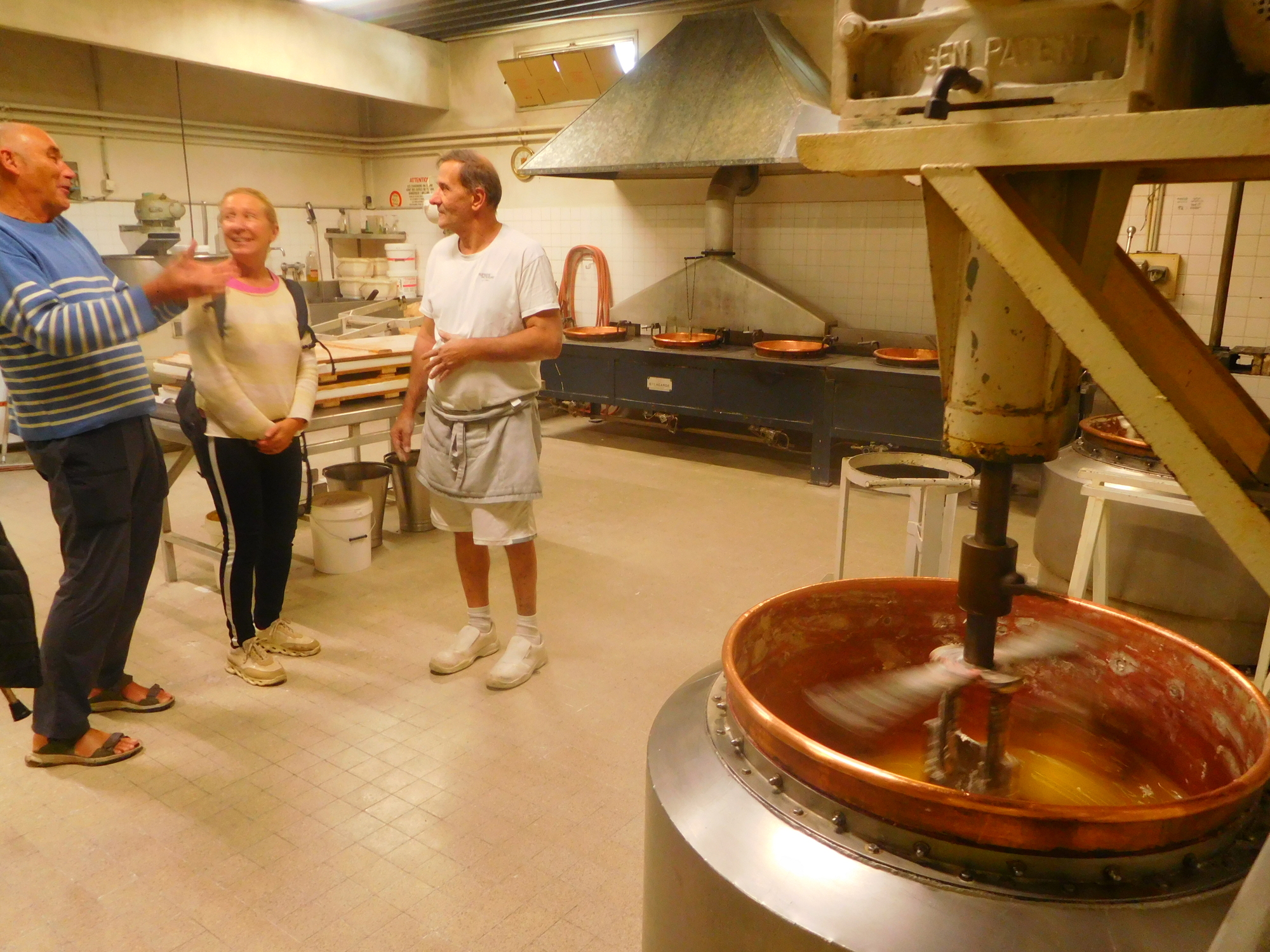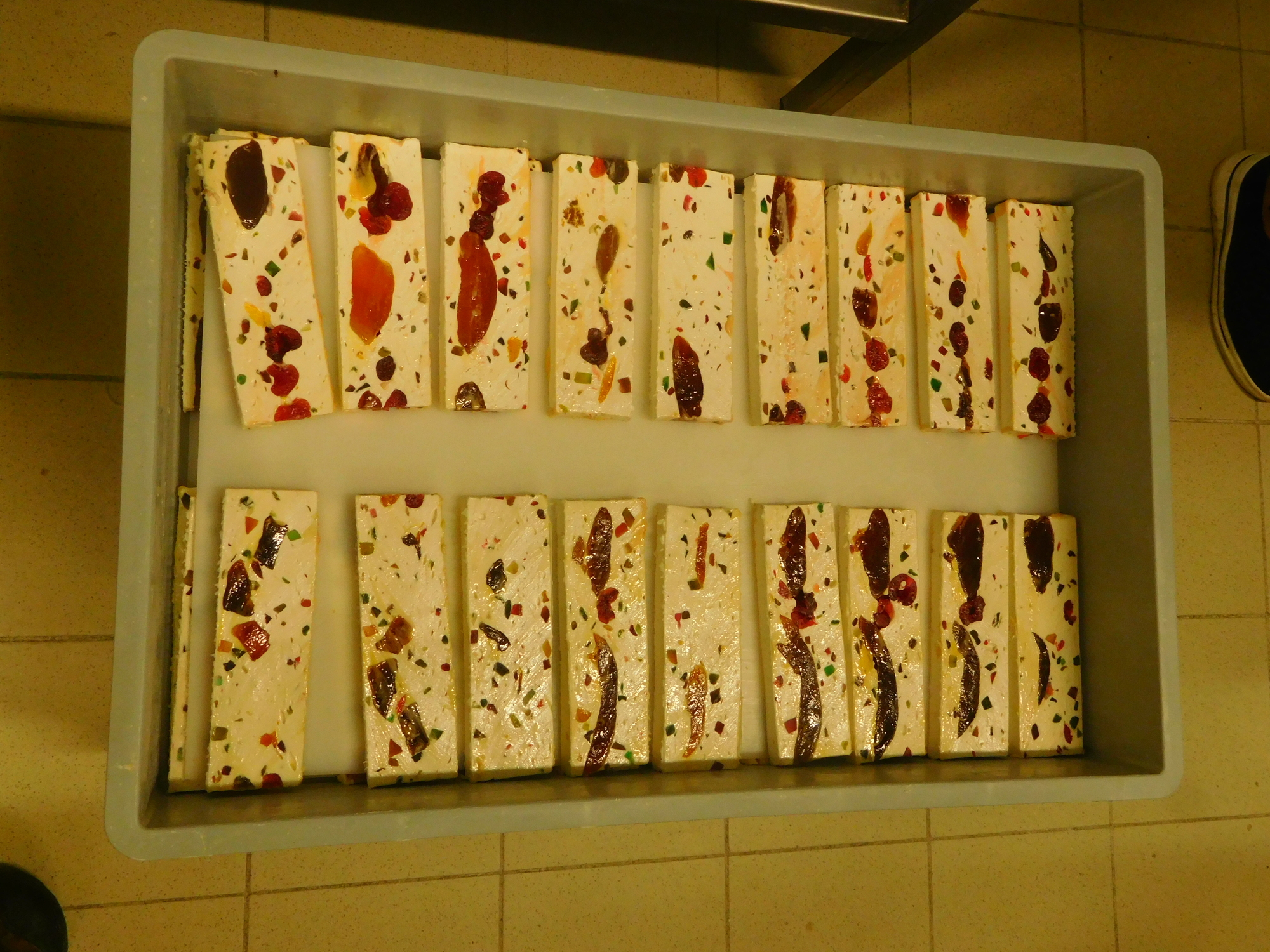 When we first saw nougat production at this shop I was surprised that is seemed similar in scale to a bakery. But I think now the equipment is more sophisticated than for a bakery. Even so, it remains a typical French "artisanal" operation. The man from Munich, and I, were amazed that we were allowed right up beside the machinery, and to mix in and interfere with the workers. In Germany and in Canada, health and safety officials would have had a fit. On this we say "Vive la France"!