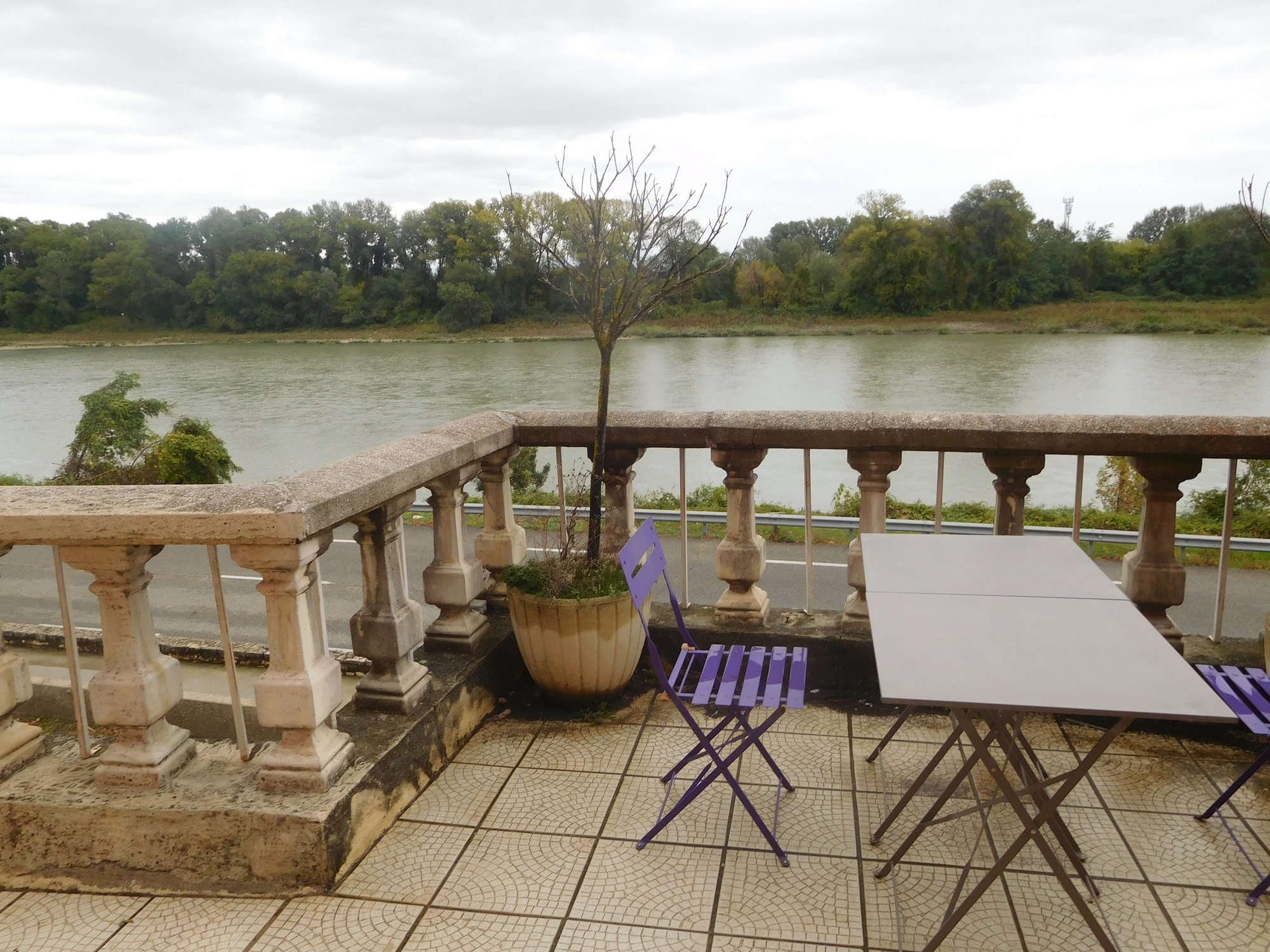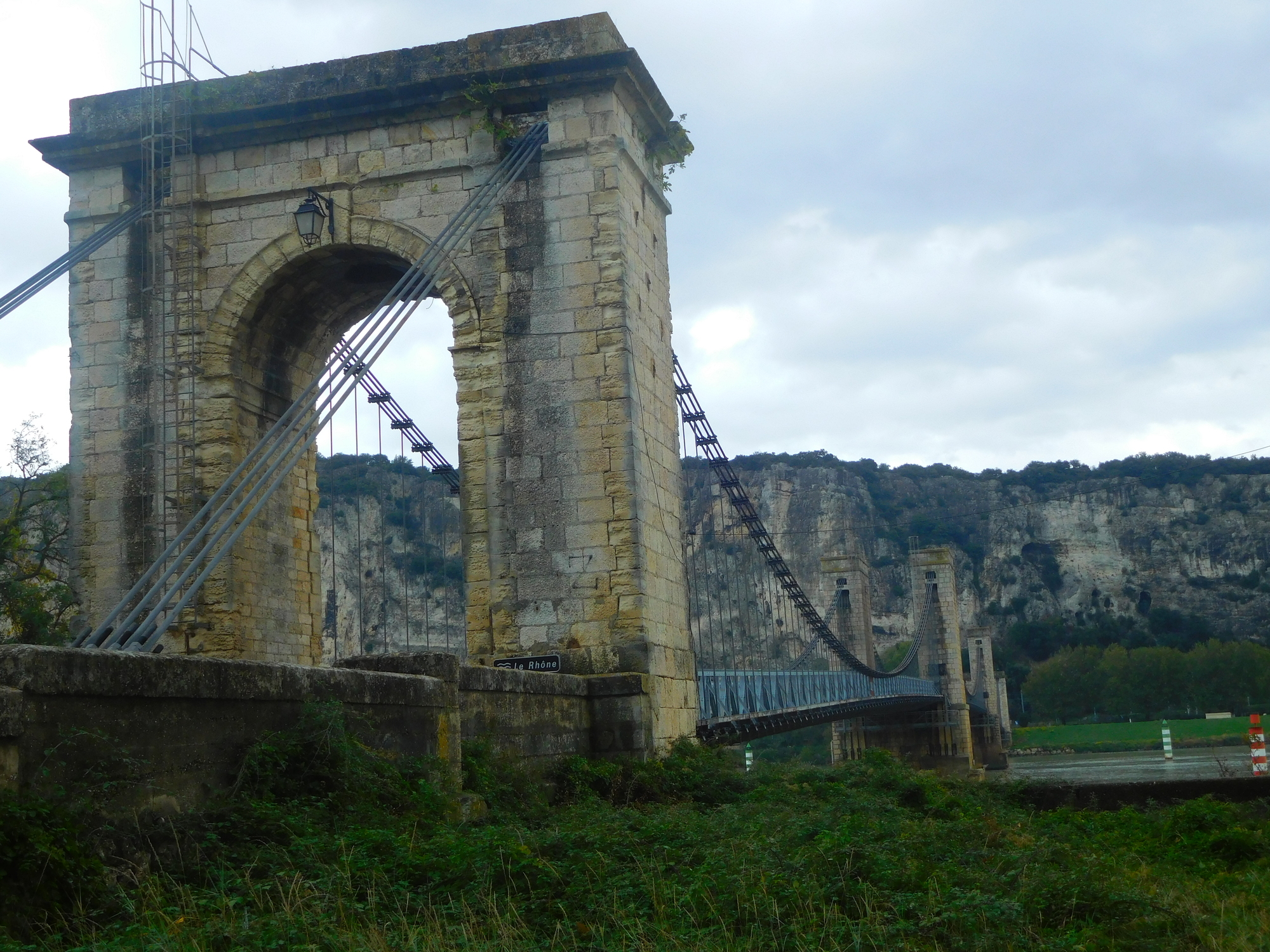 From Ibis we crossed the river to once again be on the right bank, the Ardeche side. This is the side which generally has the cliffs and the almost mountains, no so far back from the river. You can see it behind the houses, in the next two shots.Near Baix there is a small passerelle in the form of a suspension bridge. Dodie, who is so good with heights, nevertheless hates bouncy suspension bridges. But this is just the warmup. Rochemaure, further down, had a doozy. Weak hotel internet keeps me from showing it just now.