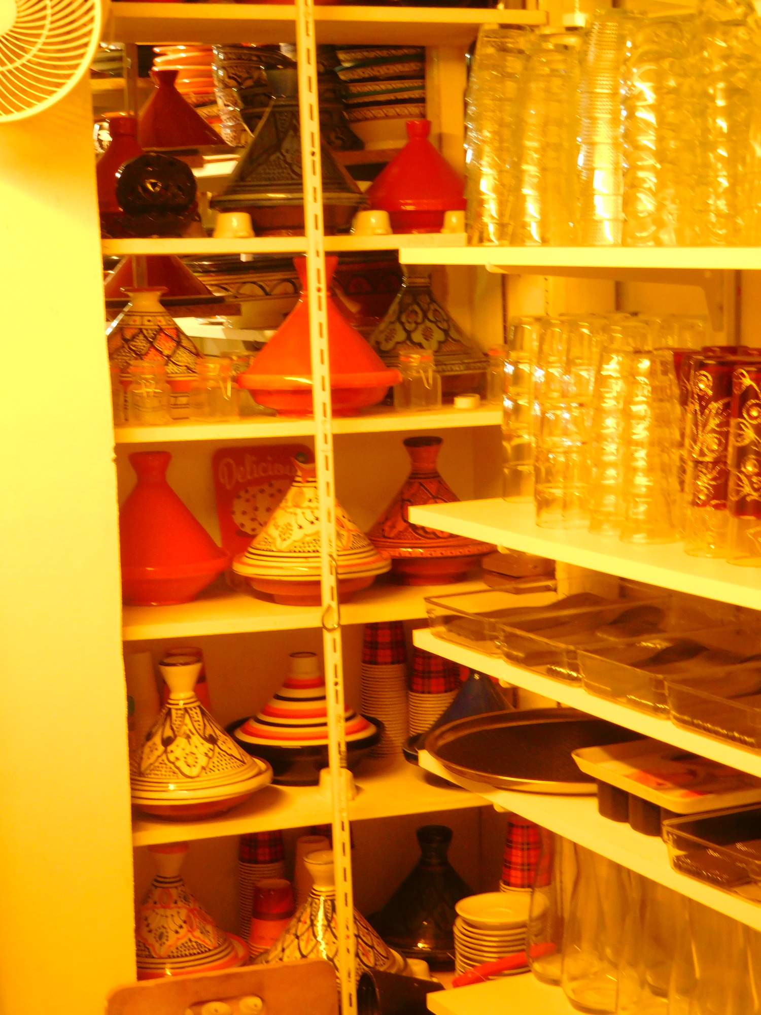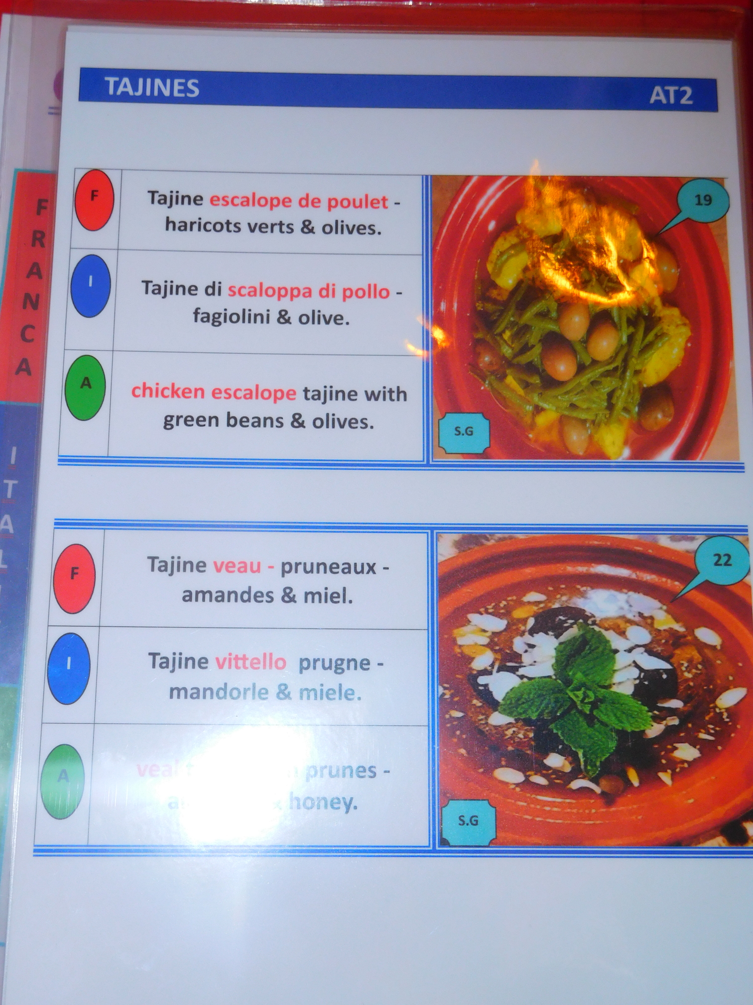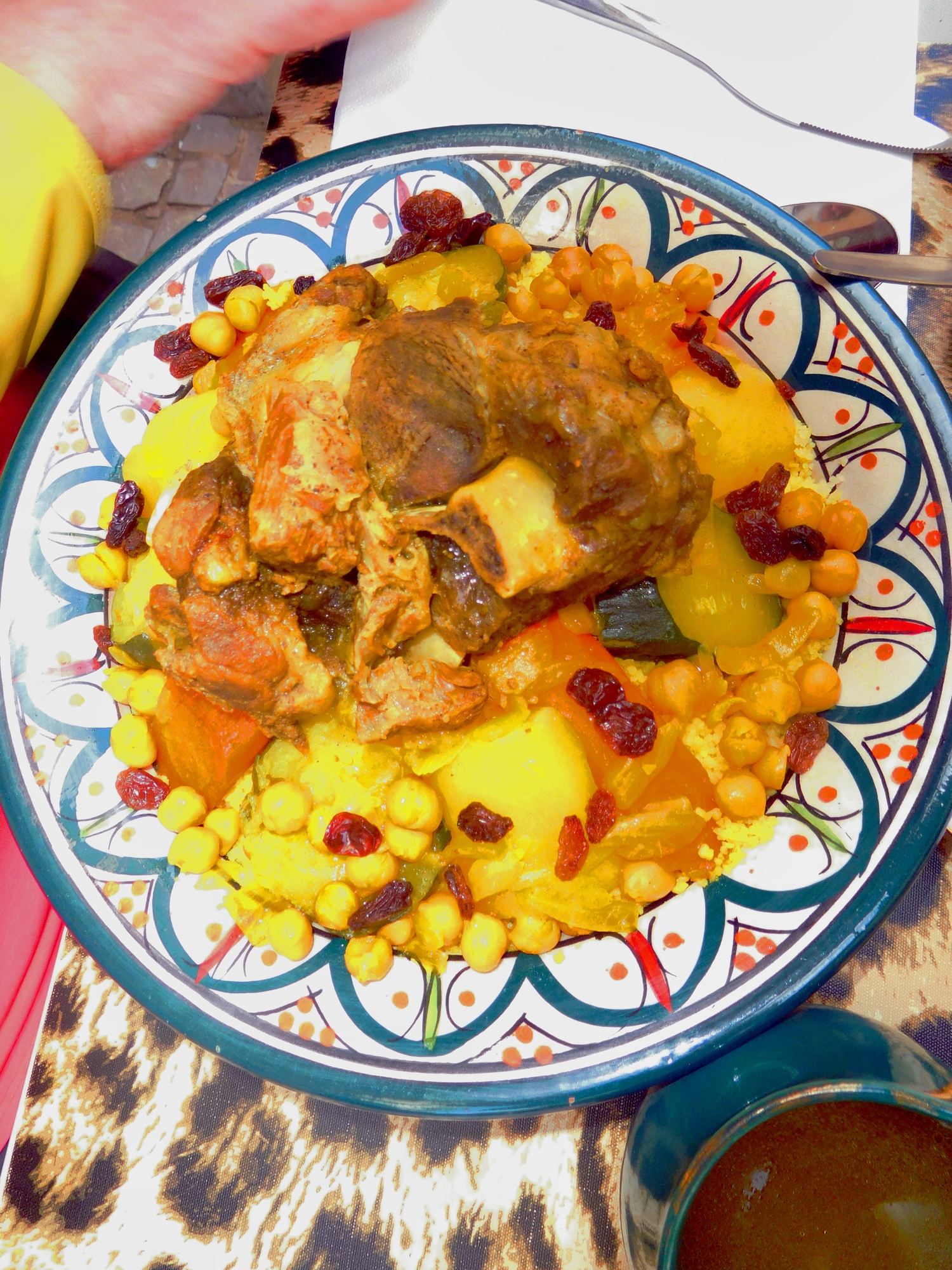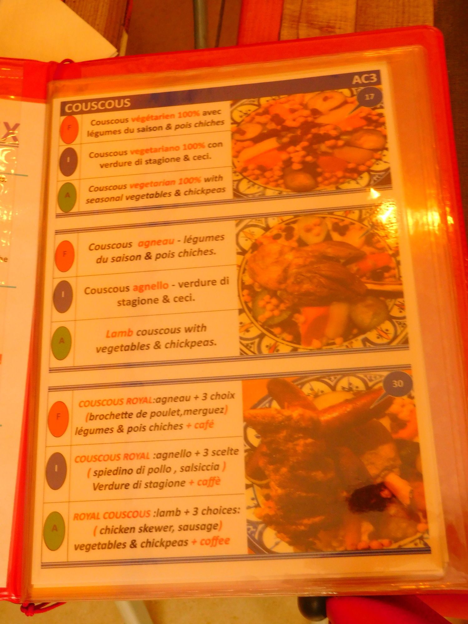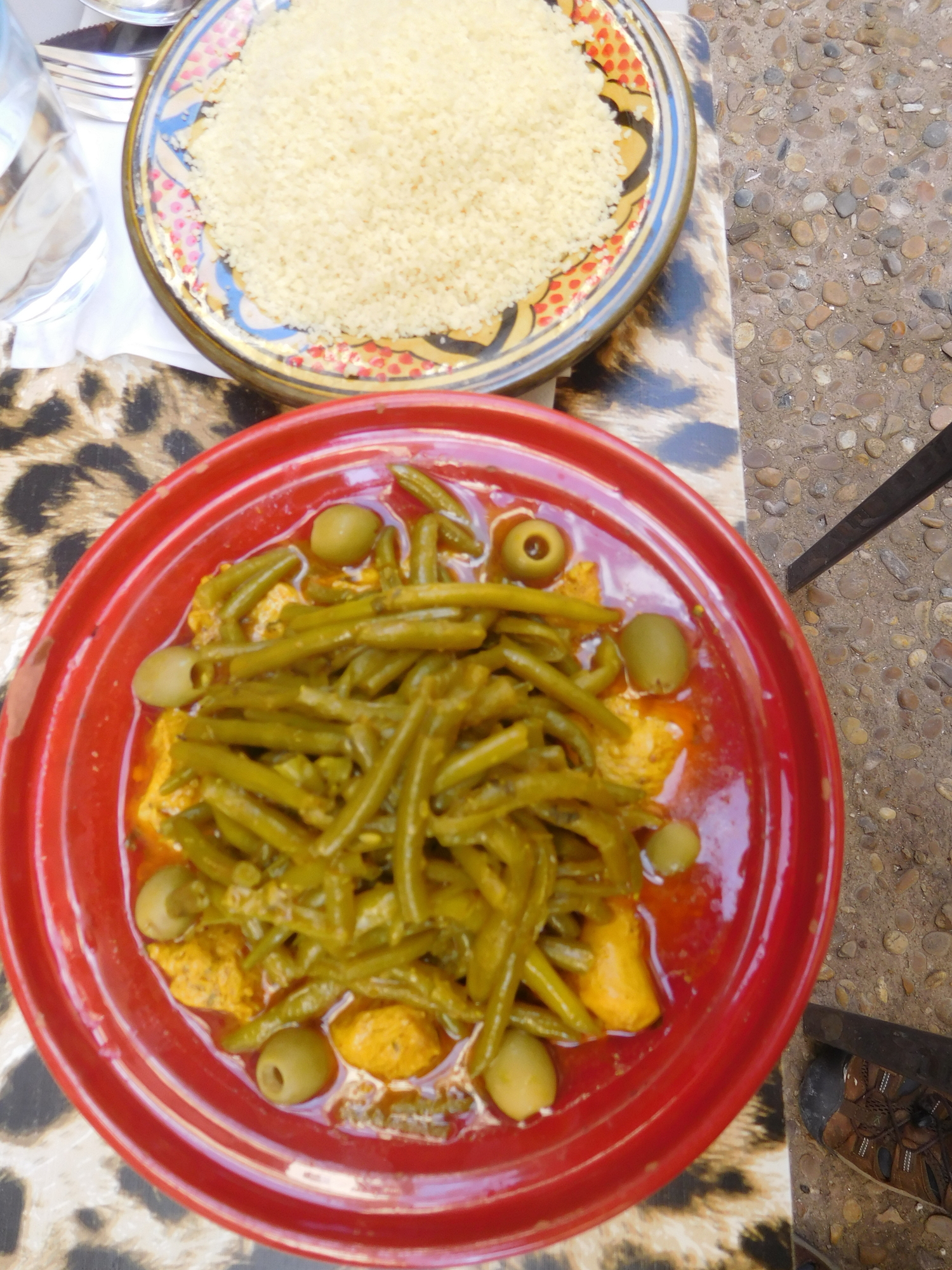 I did not bother to ask for a menu, but just talked to the waiter about what we might like. He found the closest on his actual menu: Couccous with lamb and chickpeas for Dodie and chicken tagine with green beans and olives for me.