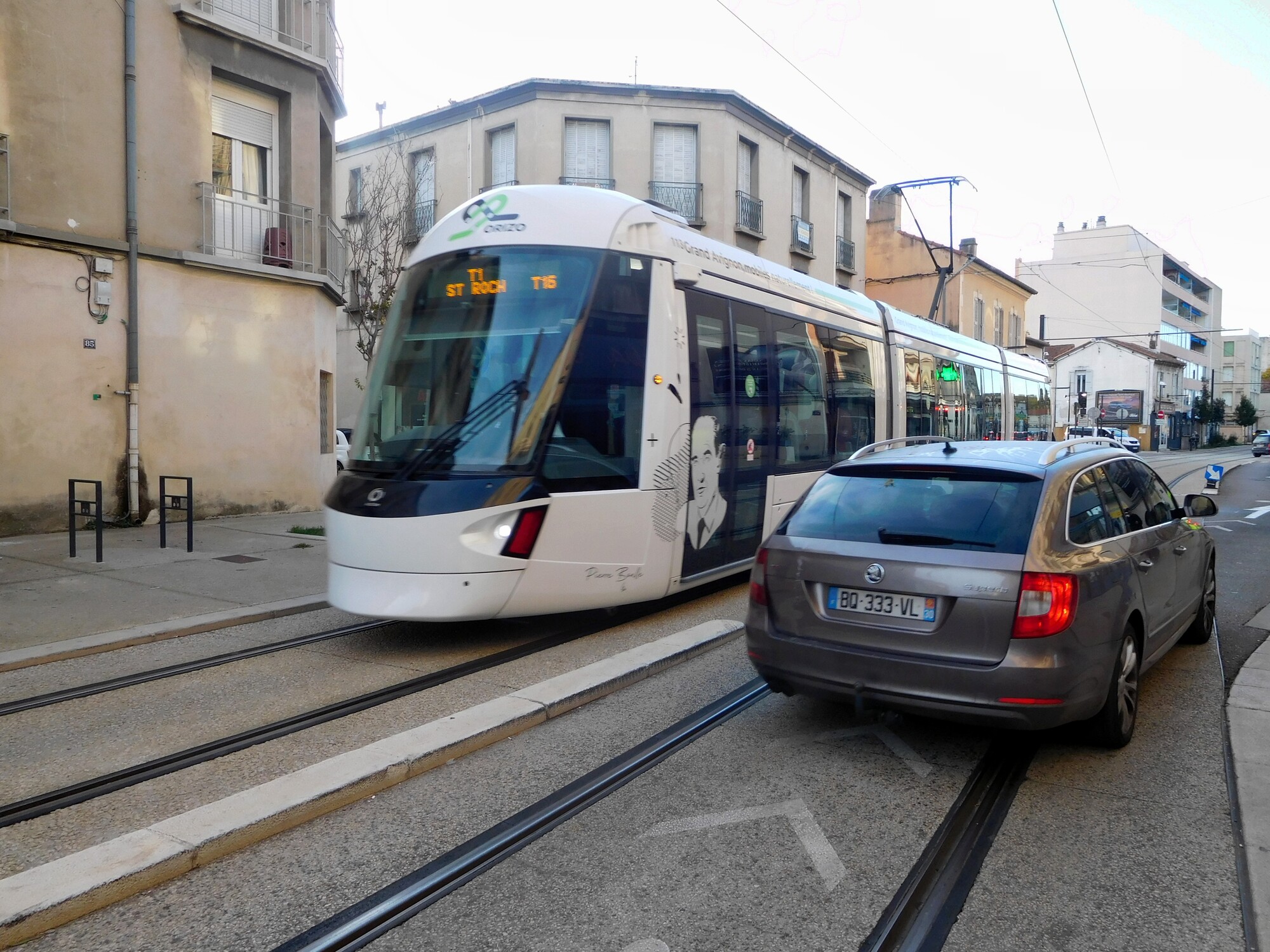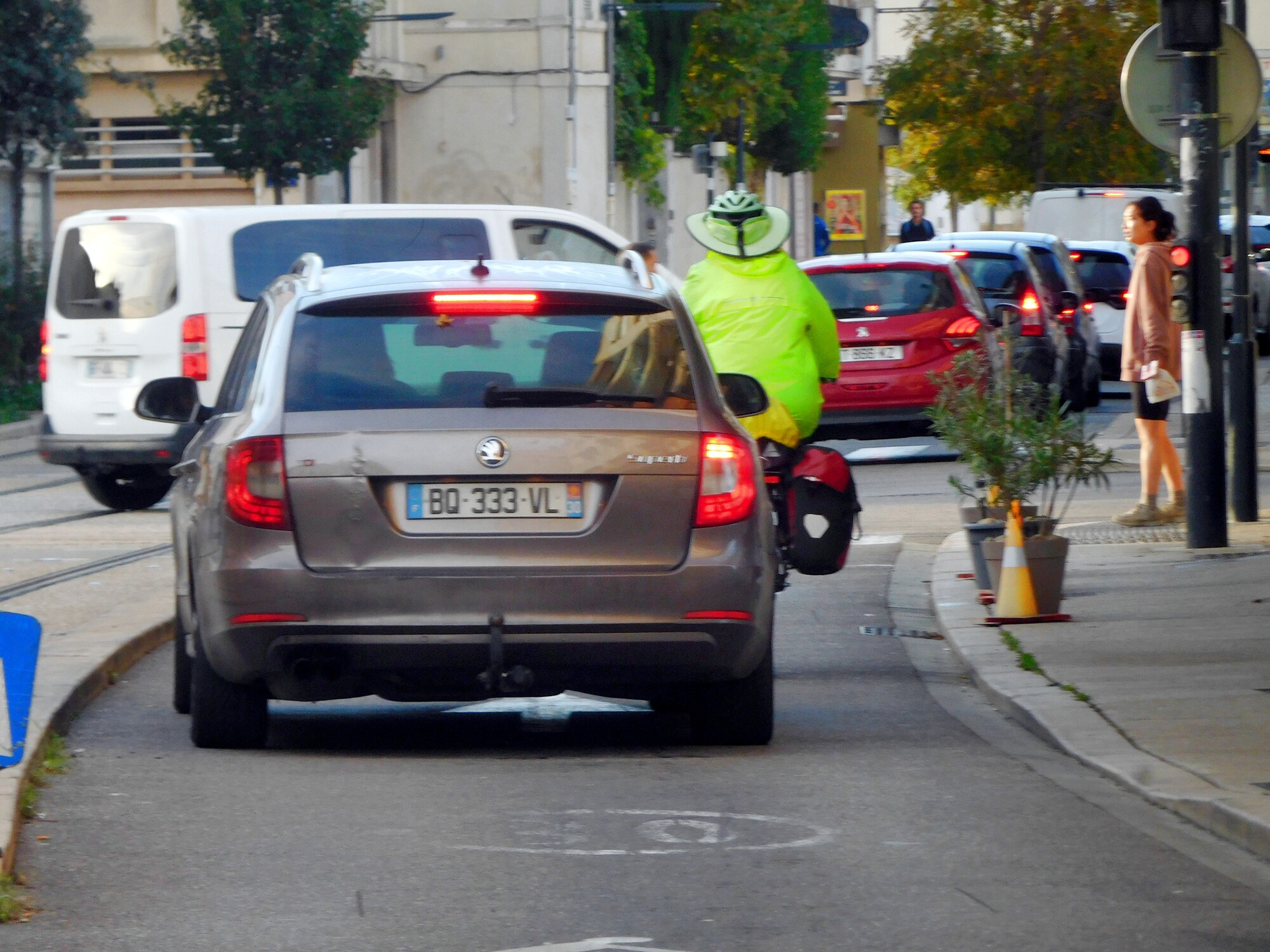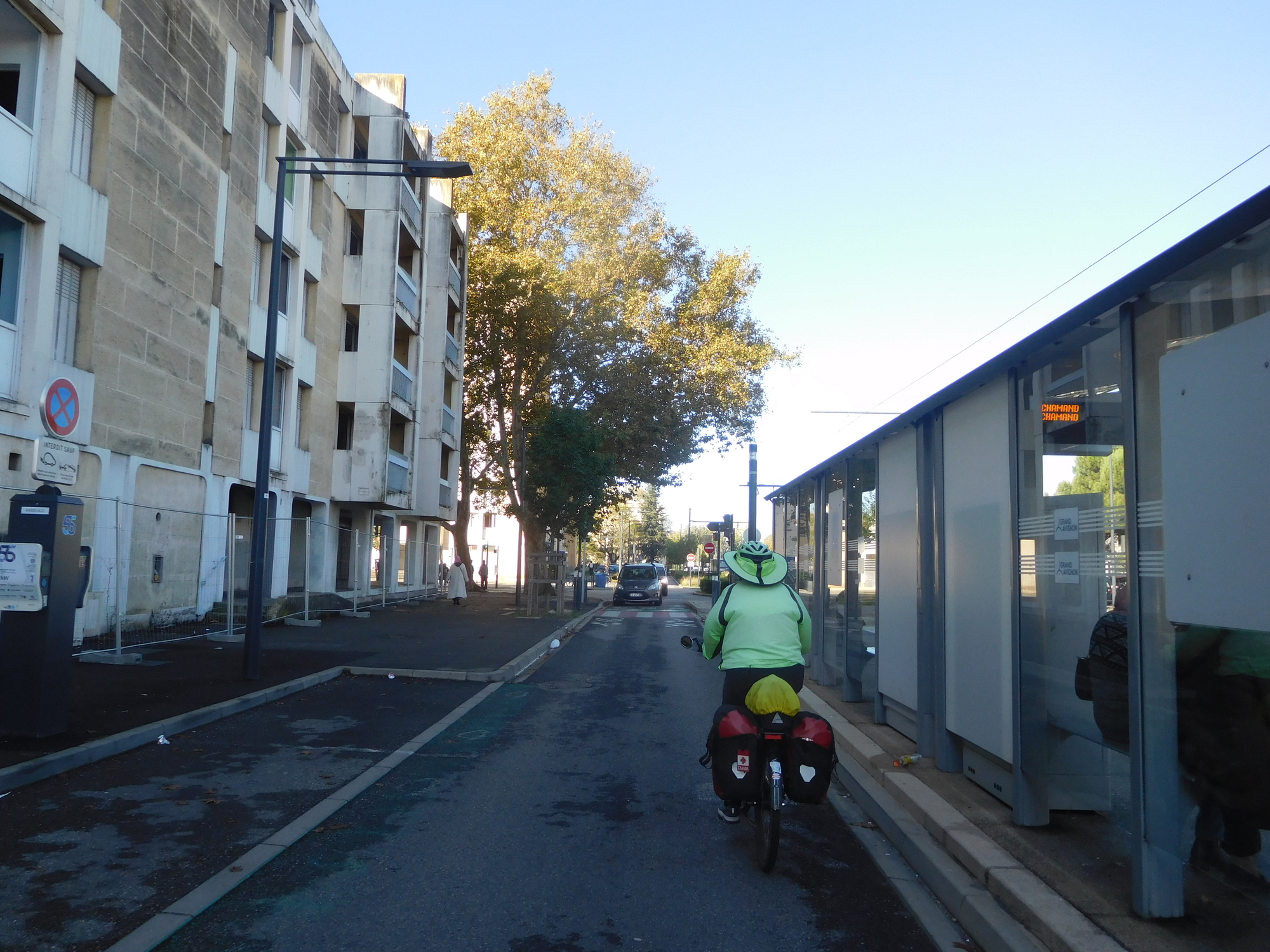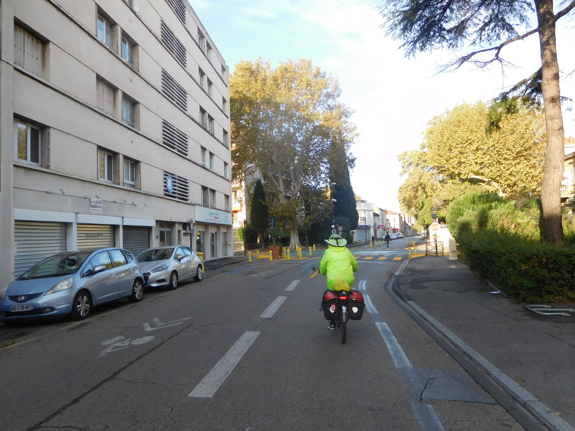 In each and every old city we visit, there is a dramatic difference between the old core and the surrounding doughnut of urban development. In Avignon it's striking, because the wall clearly defines the old core. As you see from the photo below, once out we were immediately fighting with trams and car traffic. The car is driving over a bit that is supposed to be for bikes, when there is no tram there. Ha!