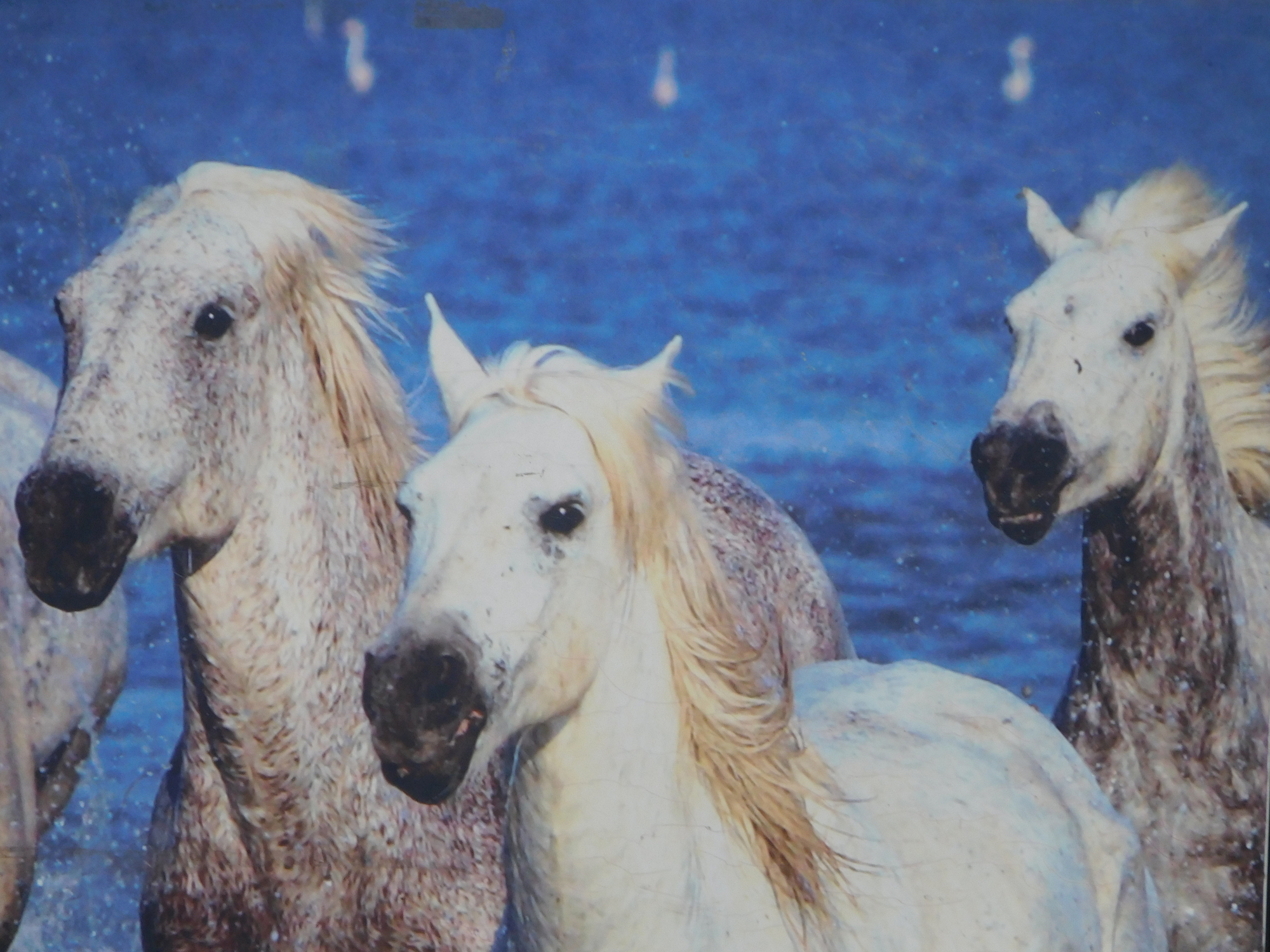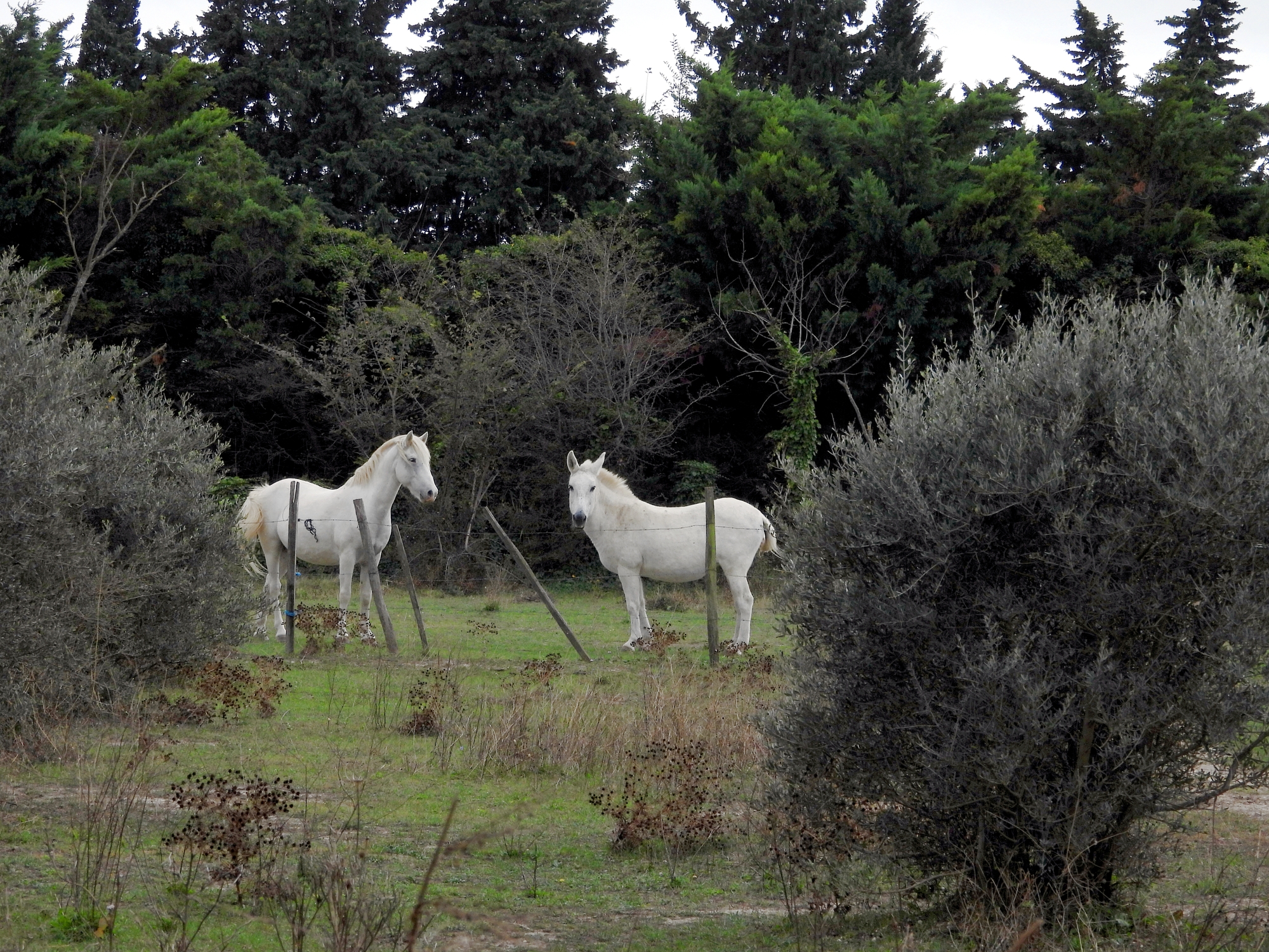 Over a bridge, and we were out of Arles and on our way to the Camargue! A poster, at a bank or something, showed the Camargue horses that we are convinced are Unicorns in disguise.