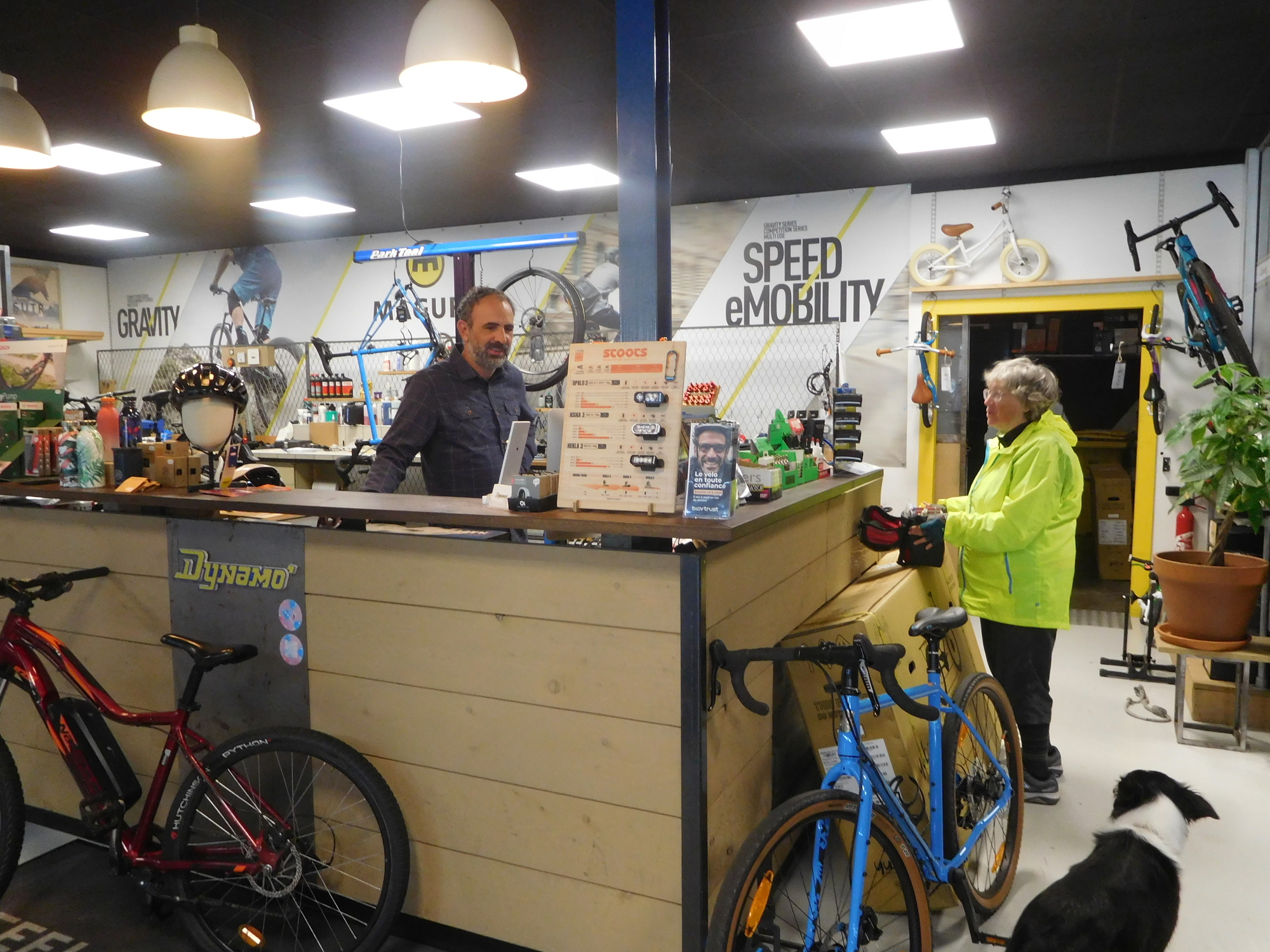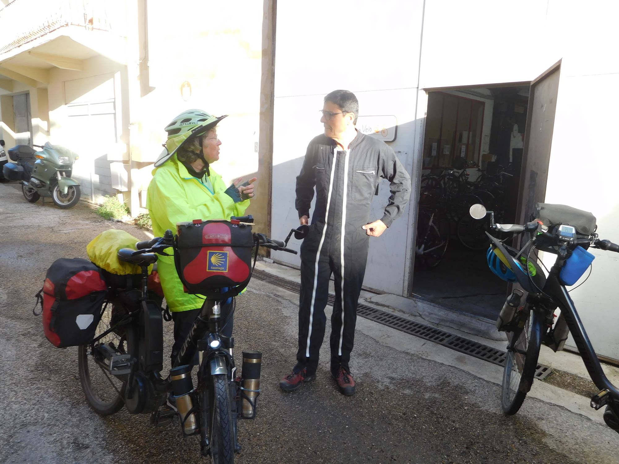 We arrived at the third shop at 9:30 opening time. This indicates that we had already squandered an hour and a half since leaving the hotel. But we seemed to be in luck. See where it says "Magura" behind the man's head i the photo? That's our brand! And yes, they had our pads! But two glitches. First, in terms of getting another bleed of the brake line, they said leave the bike and come back in some days or a week! Next, those Magura pads do come at various price points, depending who is selling them. 10 euros a pair would be a really top price. I already had two pairs in my Amazon.fr cart, for a total price of 9 euros, if I had had a place to send them to. But here, they wanted 22 euros a pair! I was sure the man was making an error looking up the price, because that was truly ridiculous. I dragged out my phone, and showed him the 9 euros for four, as a typical price. His response was that as a local bike shop he could not be expected to compete with Amazon. The discussion did not go any further, as Dodie dragged out 44 euros, arguing that we did not have time to argue.