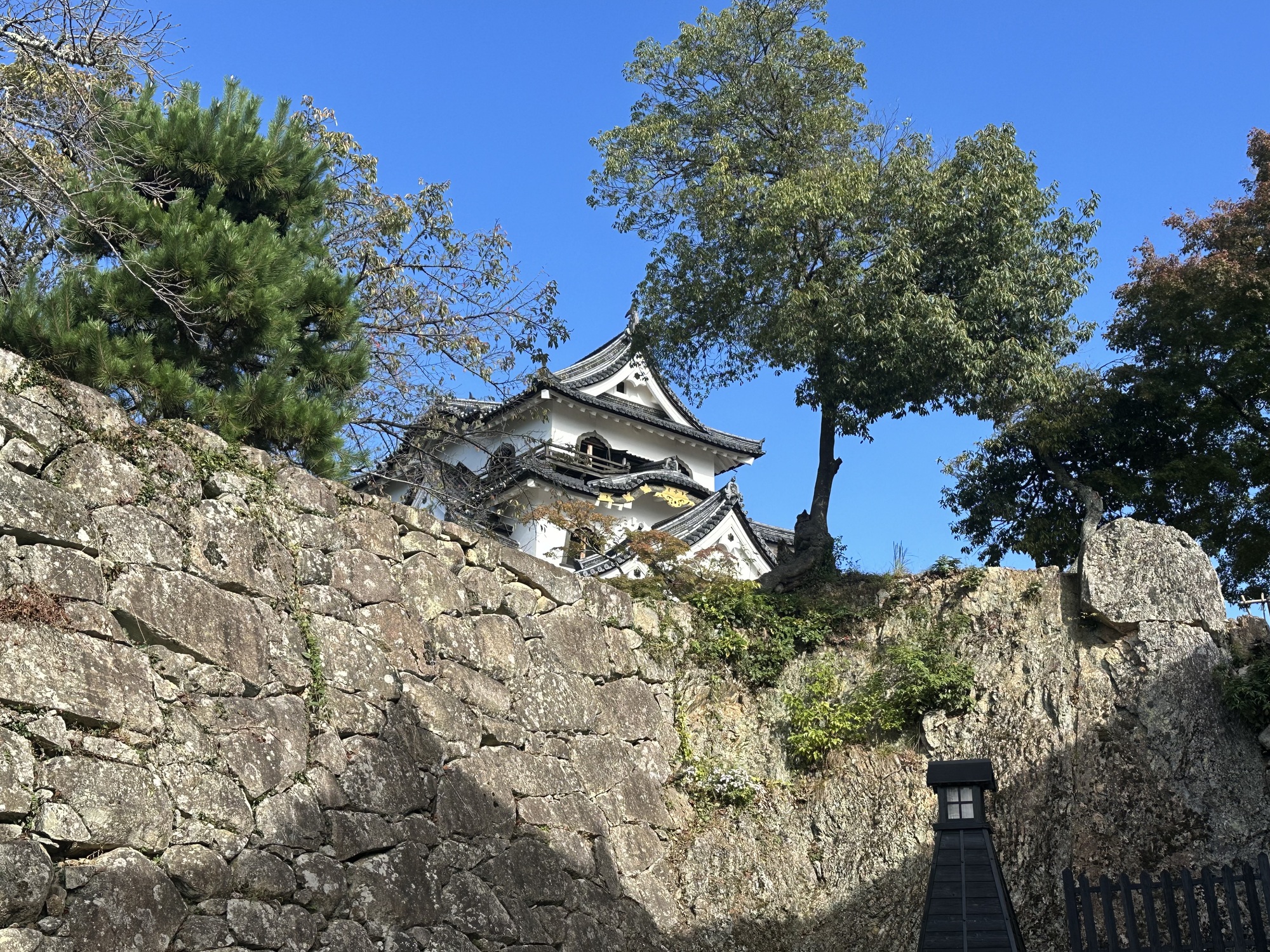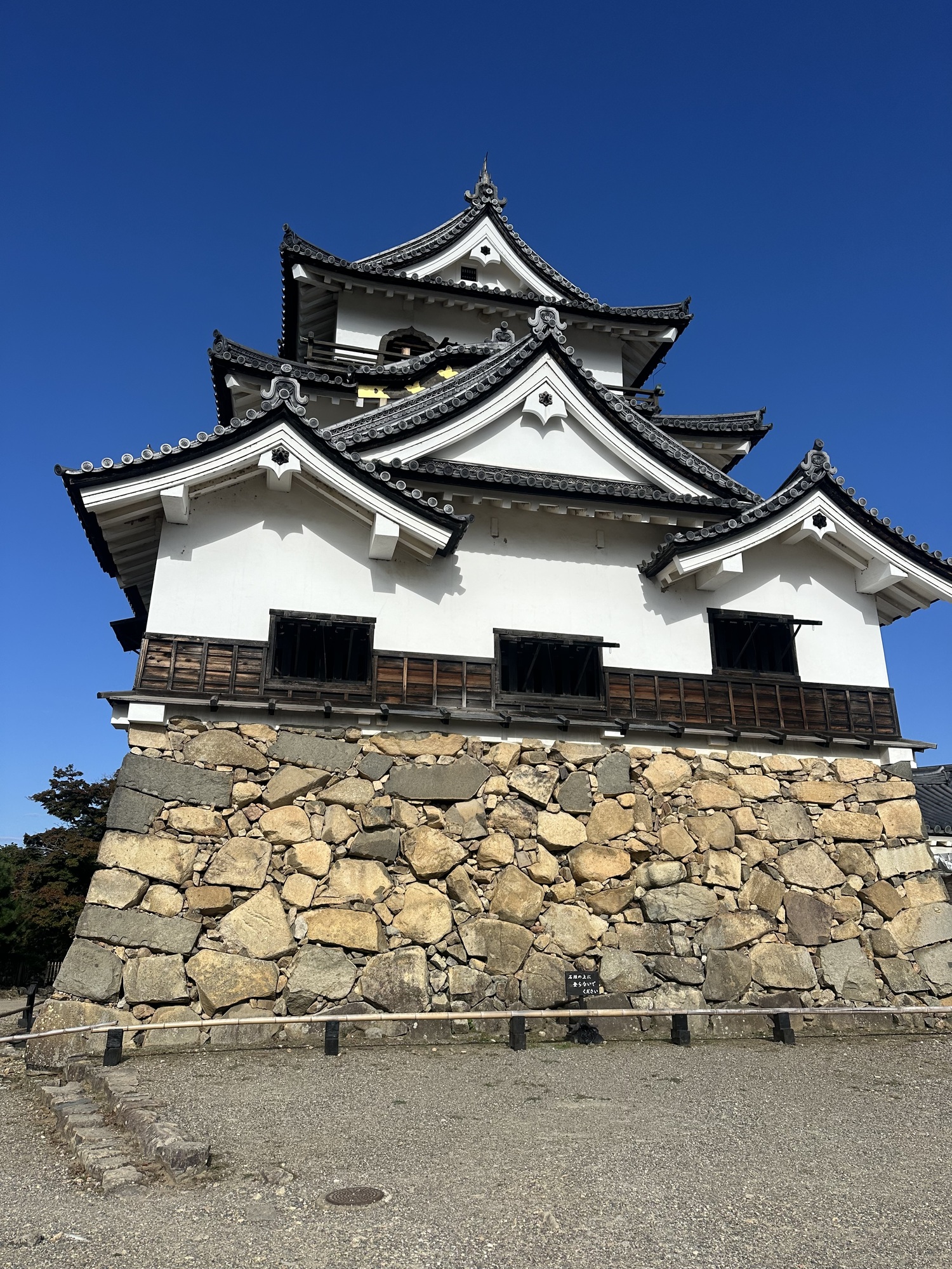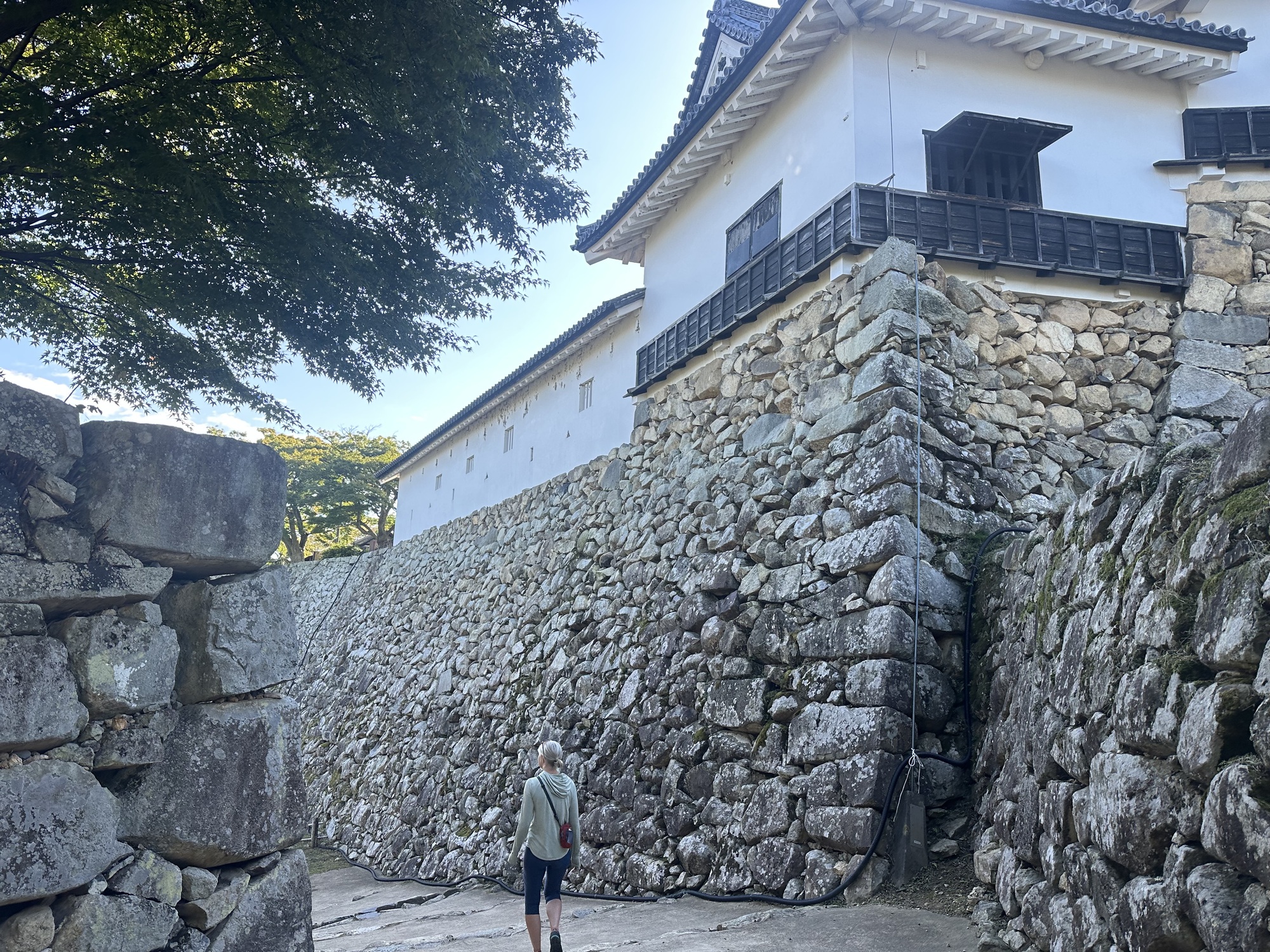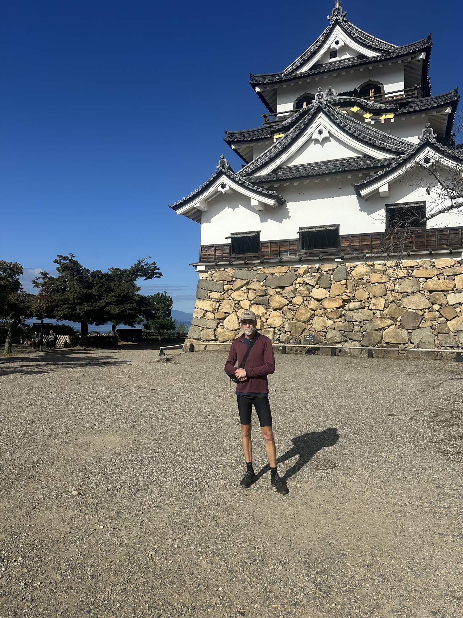 It was a lovely morning, sunny and warm, and the ride quickly brought us to the moat and walls of Hikone Castle — in fact we rode across the bridge across the moat and right up to the gate. As it turns out, like Matsumoto, this is one of the 12 remaining castles that are not reconstructions.