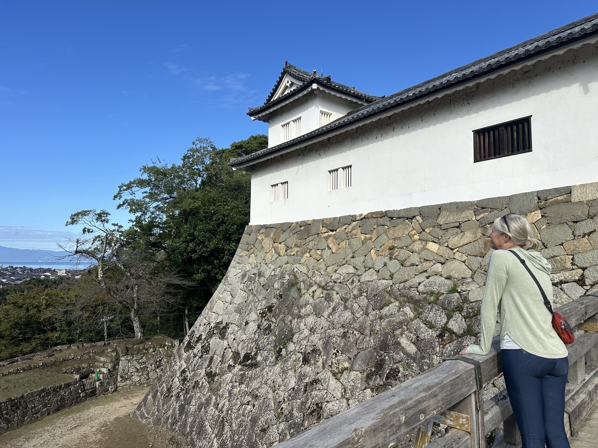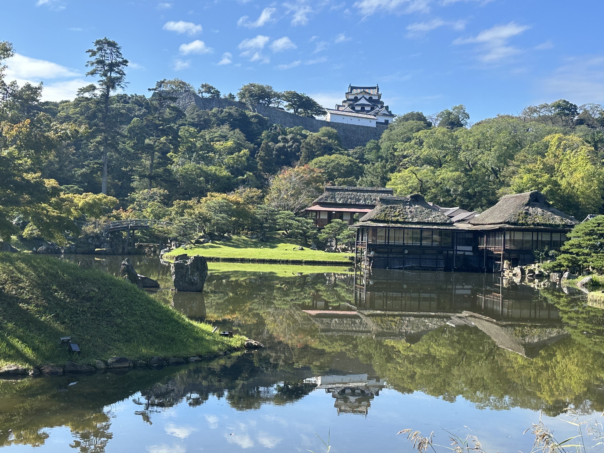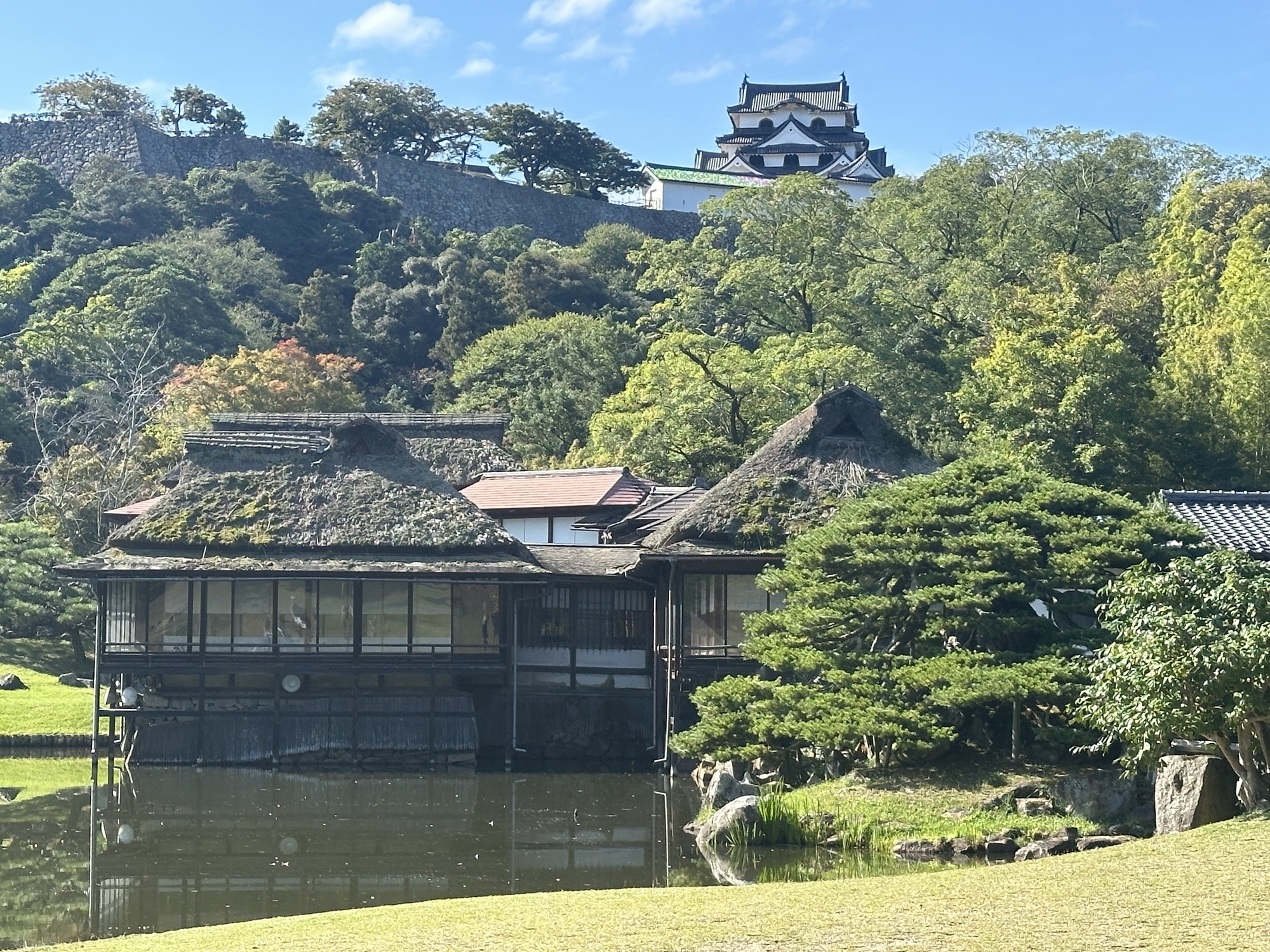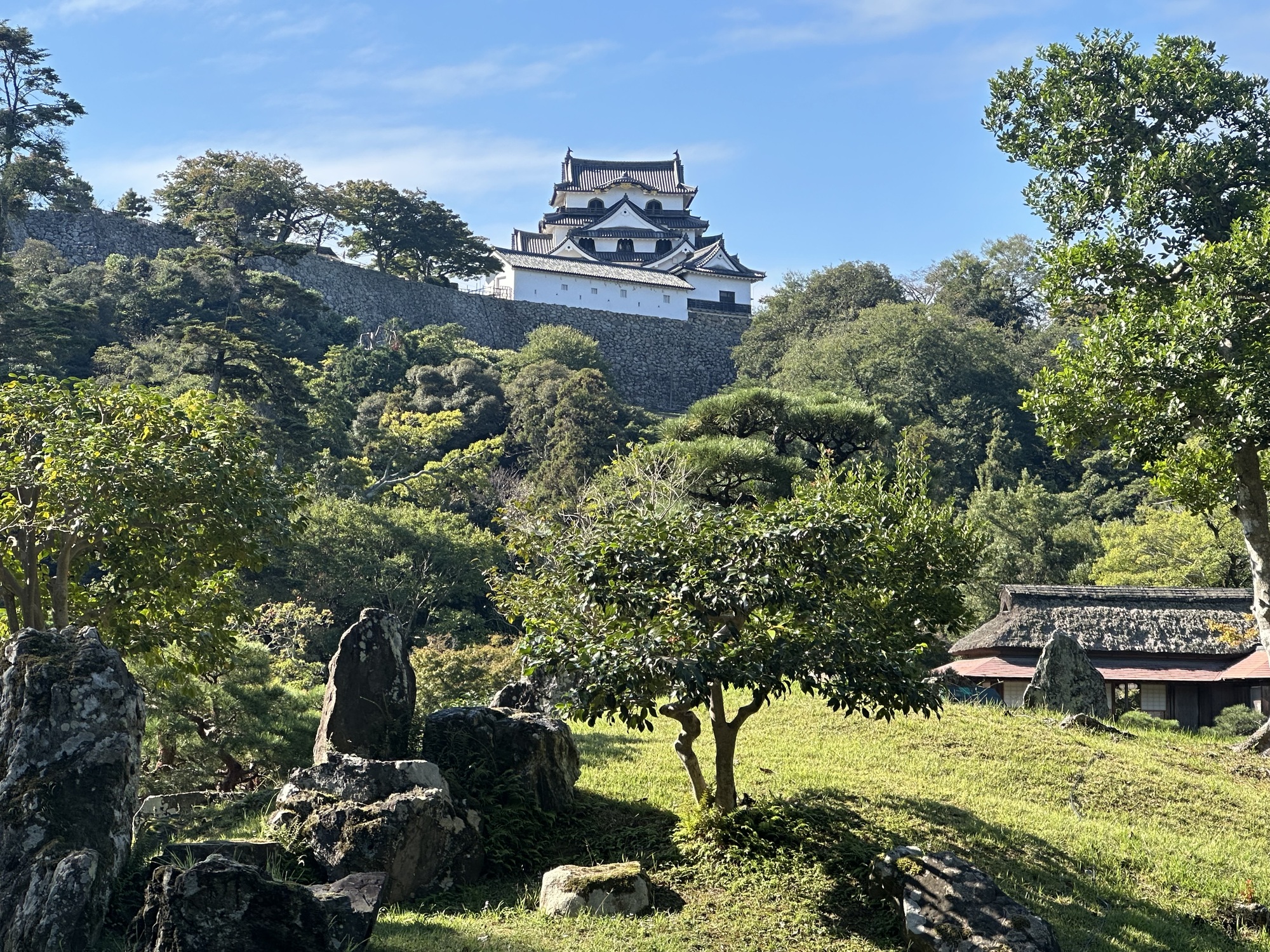 It was a lovely morning, sunny and warm, and the ride quickly brought us to the moat and walls of Hikone Castle — in fact we rode across the bridge across the moat and right up to the gate. As it turns out, like Matsumoto, this is one of the 12 remaining castles that are not reconstructions.