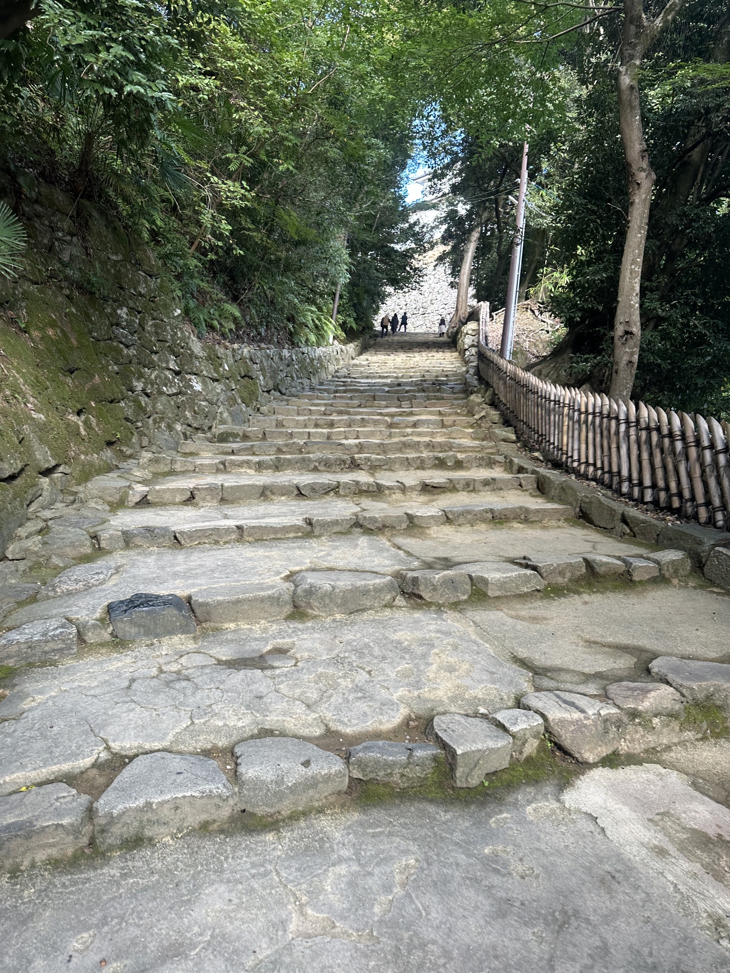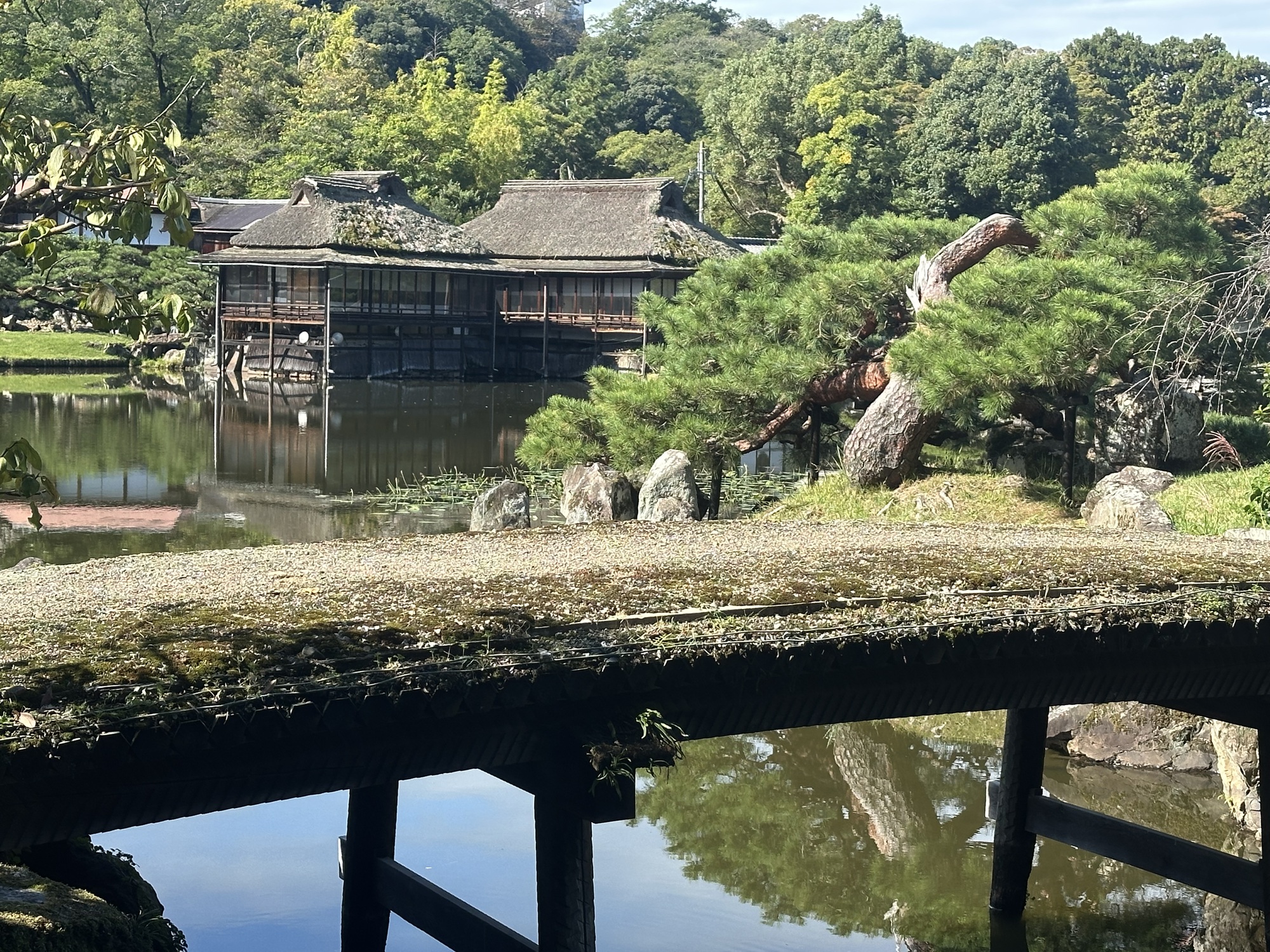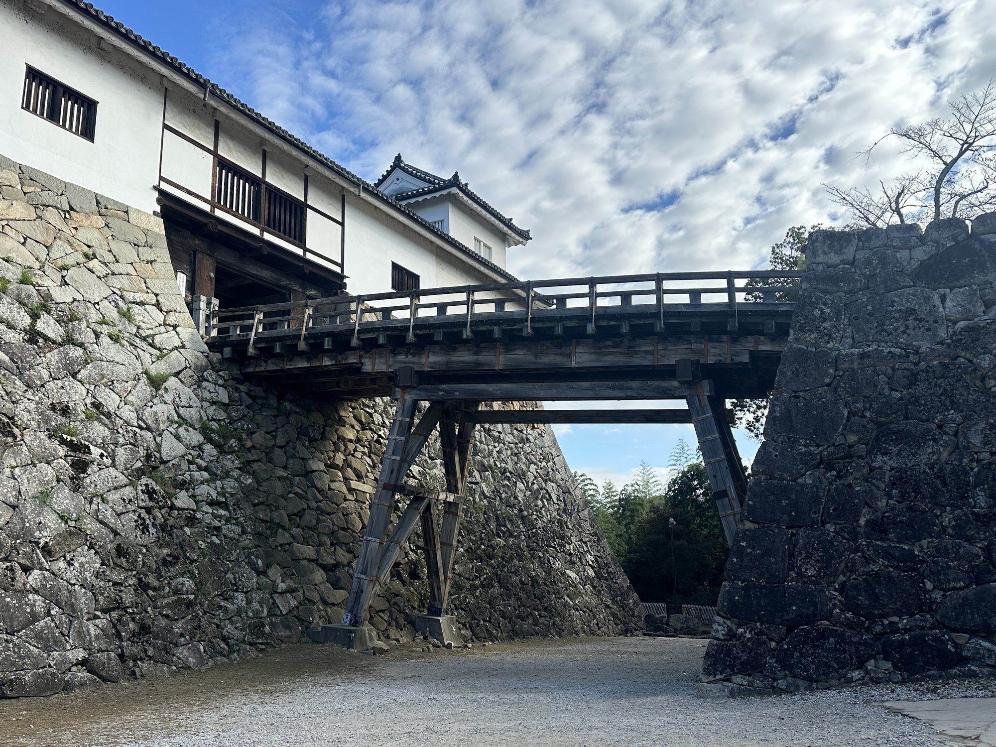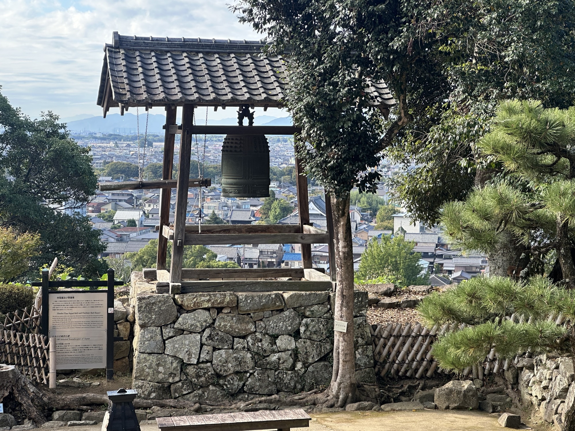 It was a lovely morning, sunny and warm, and the ride quickly brought us to the moat and walls of Hikone Castle — in fact we rode across the bridge across the moat and right up to the gate. As it turns out, like Matsumoto, this is one of the 12 remaining castles that are not reconstructions.