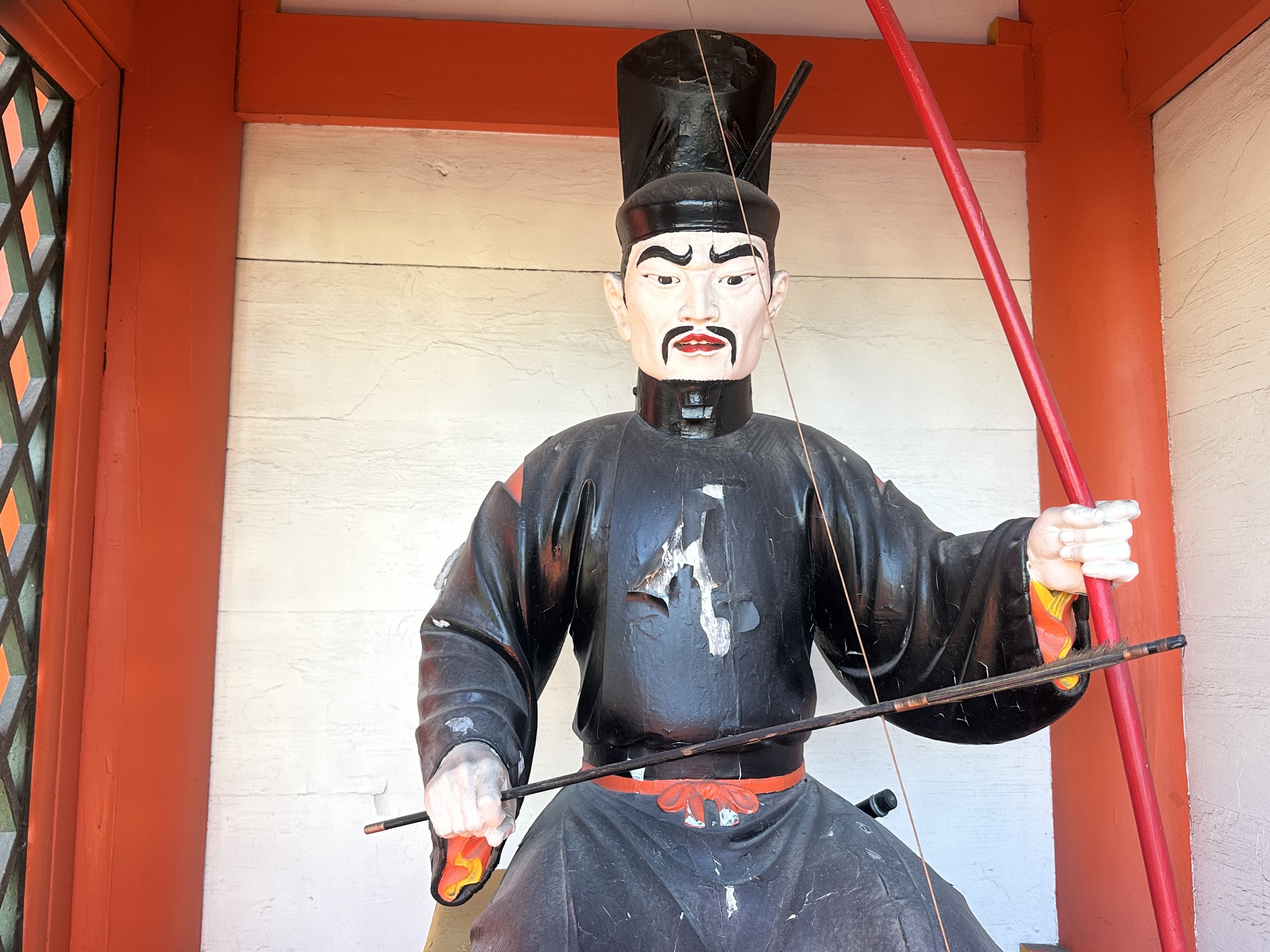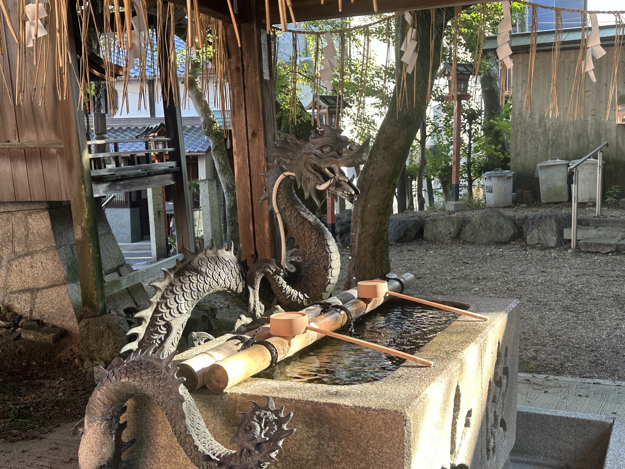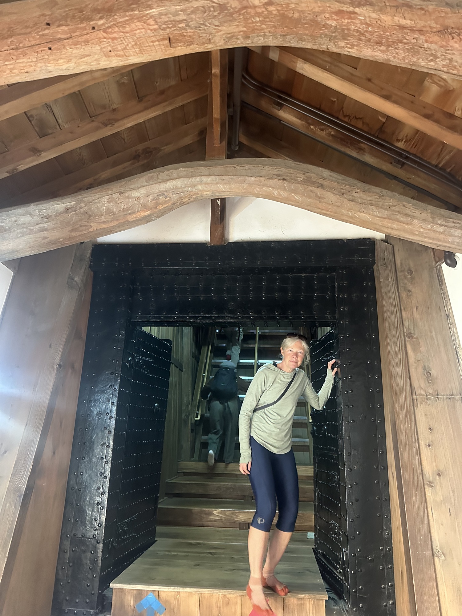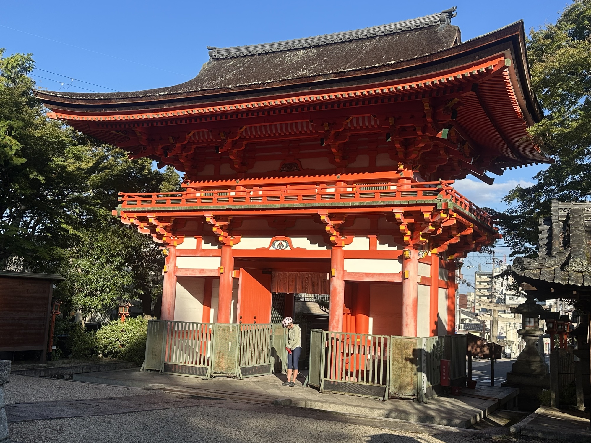 And once again Komoot was eager to oblige, putting us on back alleys barely a car width wide — at one point we had to back up to get out of the way of a garbage truck — there was no room for both of us. It popped us out at a lovely Shinto temple, which we quickly perused as it was late in the day and we had a ways to go still. It then led us to a steep climb out of town up into the forest which was nervous-making. It was past 3:30, and we still had to make 20 km which included downtown Kyoto, so didn’t have time to muck around with dead ends. At that point a road biker passed us and I asked if it was the way to Kyoto, and he confirmed it was as he effortlessly blew past us up the hill. Phew.
