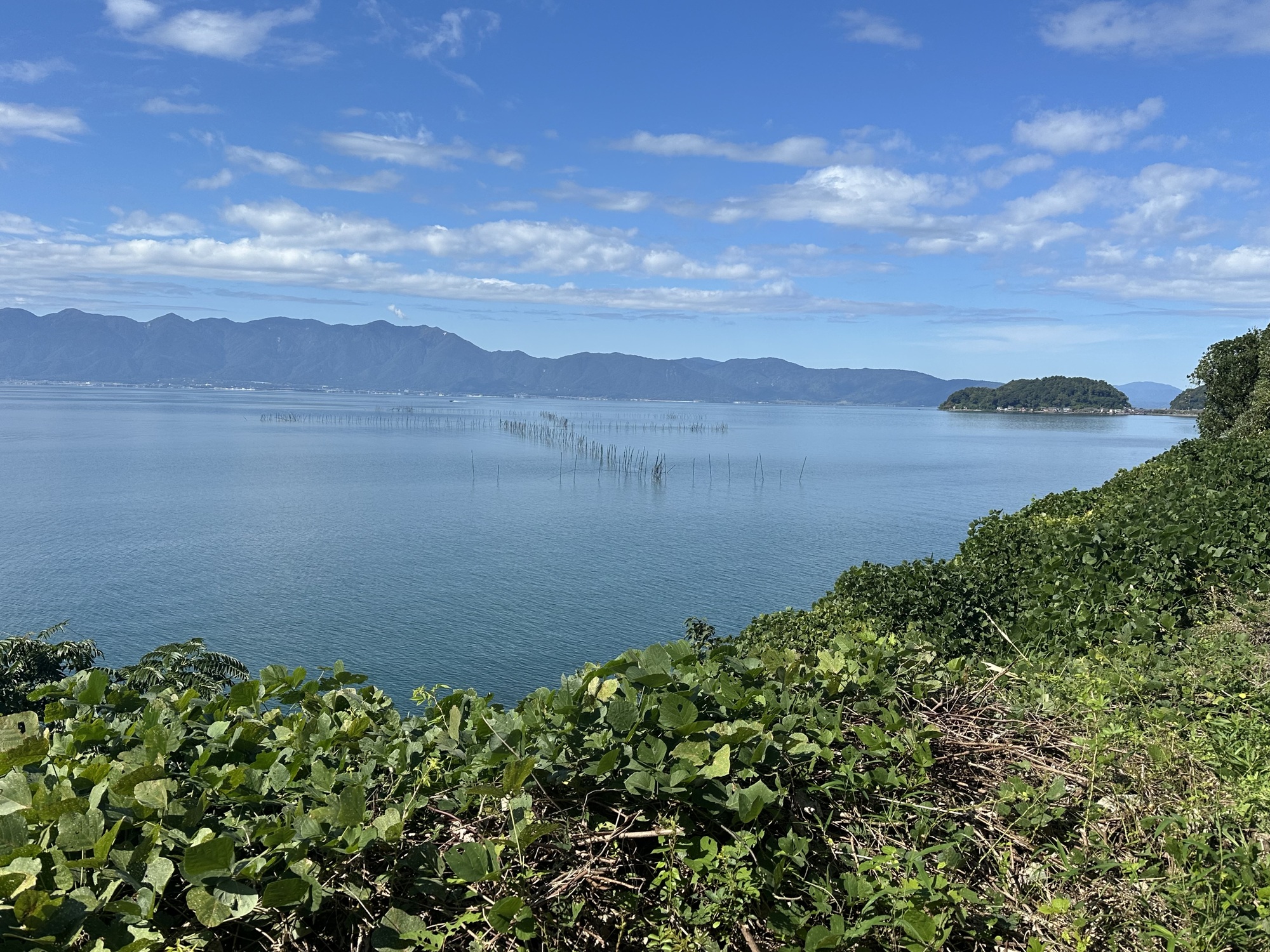 The ride west from Hikone was all bike lane alongside the highway which paralleled the shore. Super flat, no stoplights, so we put our heads down and made some distance. We did find a brief detour around a headland which got us away from the highway noise for a while and into some more appealing riding, but it was short lived.