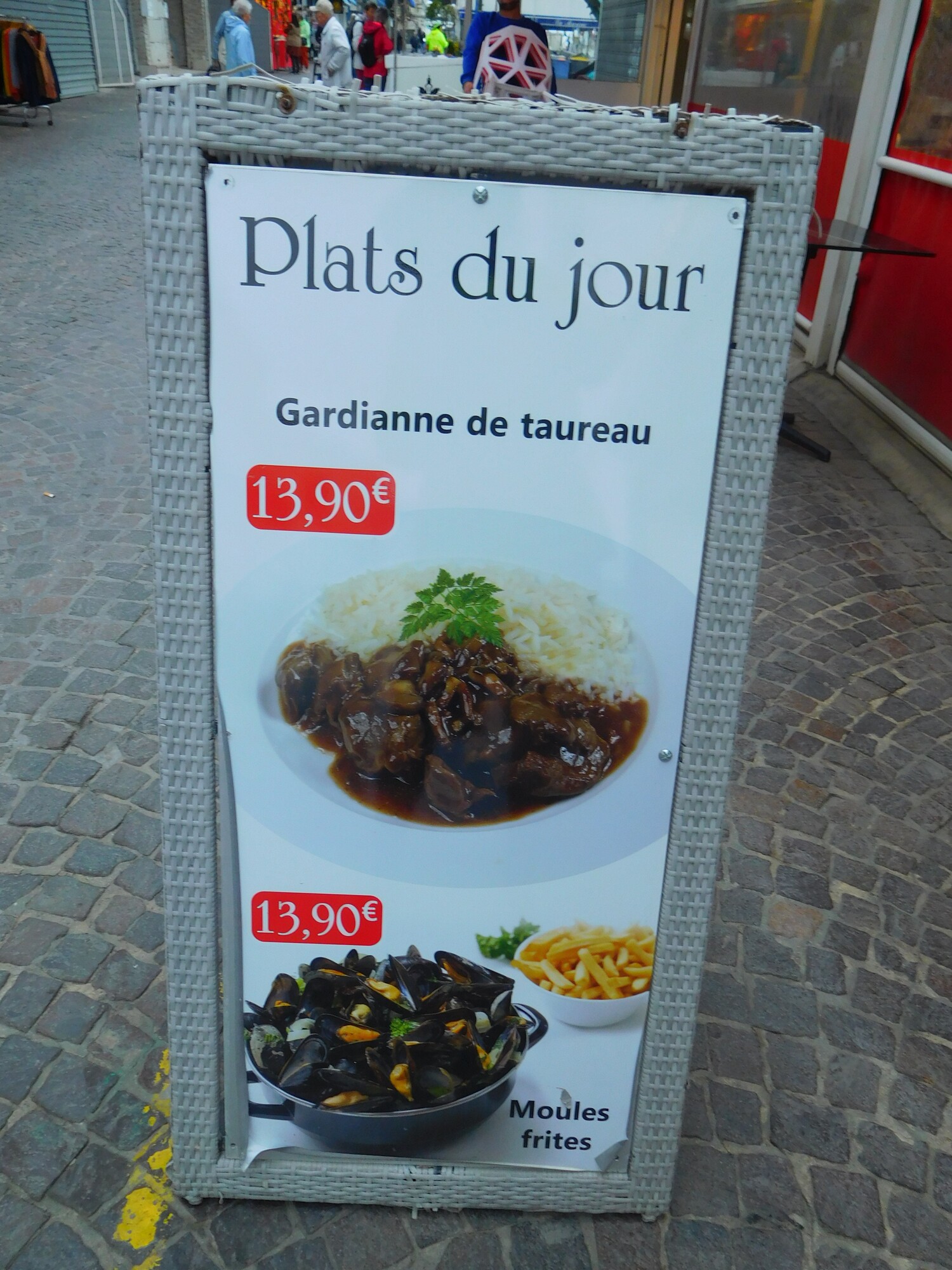There were lots of restaurants in Aigues Mortes, allowing me to check the price of Gardianne stew. Here below its €17.90 - more than in Saintes Maries. But a higher price is yet to come in the next town. (This is just stew, eh. But I should be happy - look, a veggie burger is €25.90. That's almost 40 Canadian dollars!)