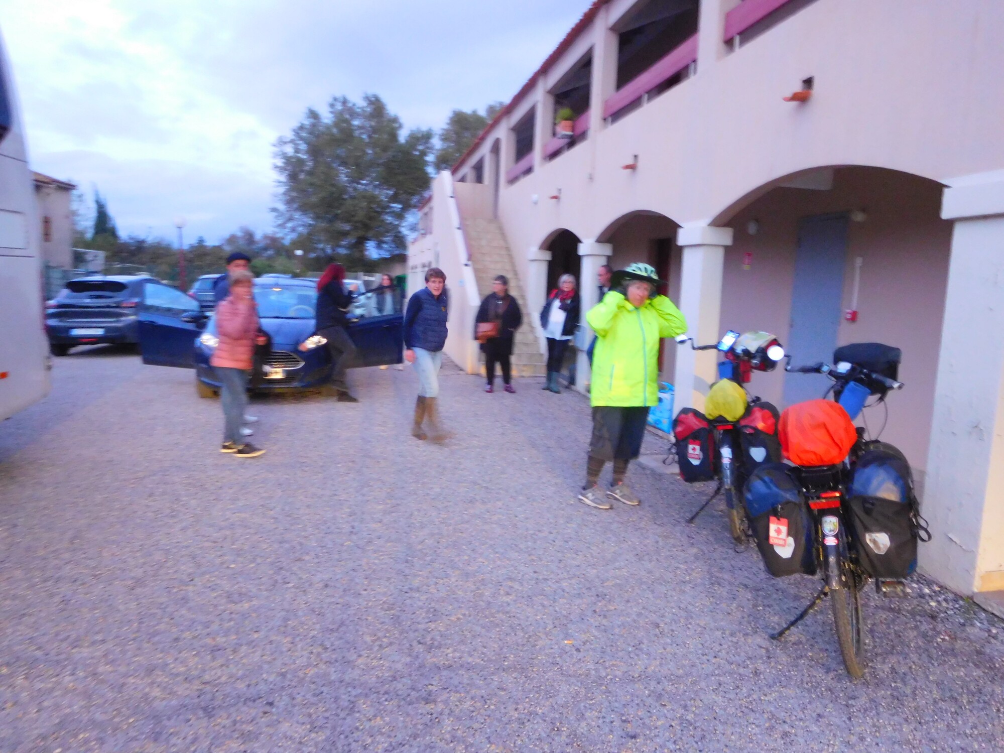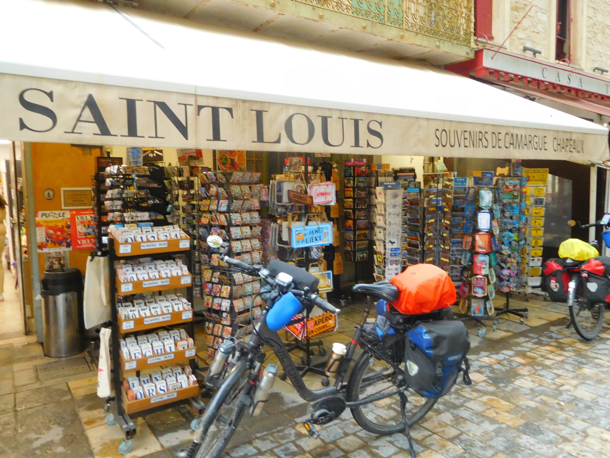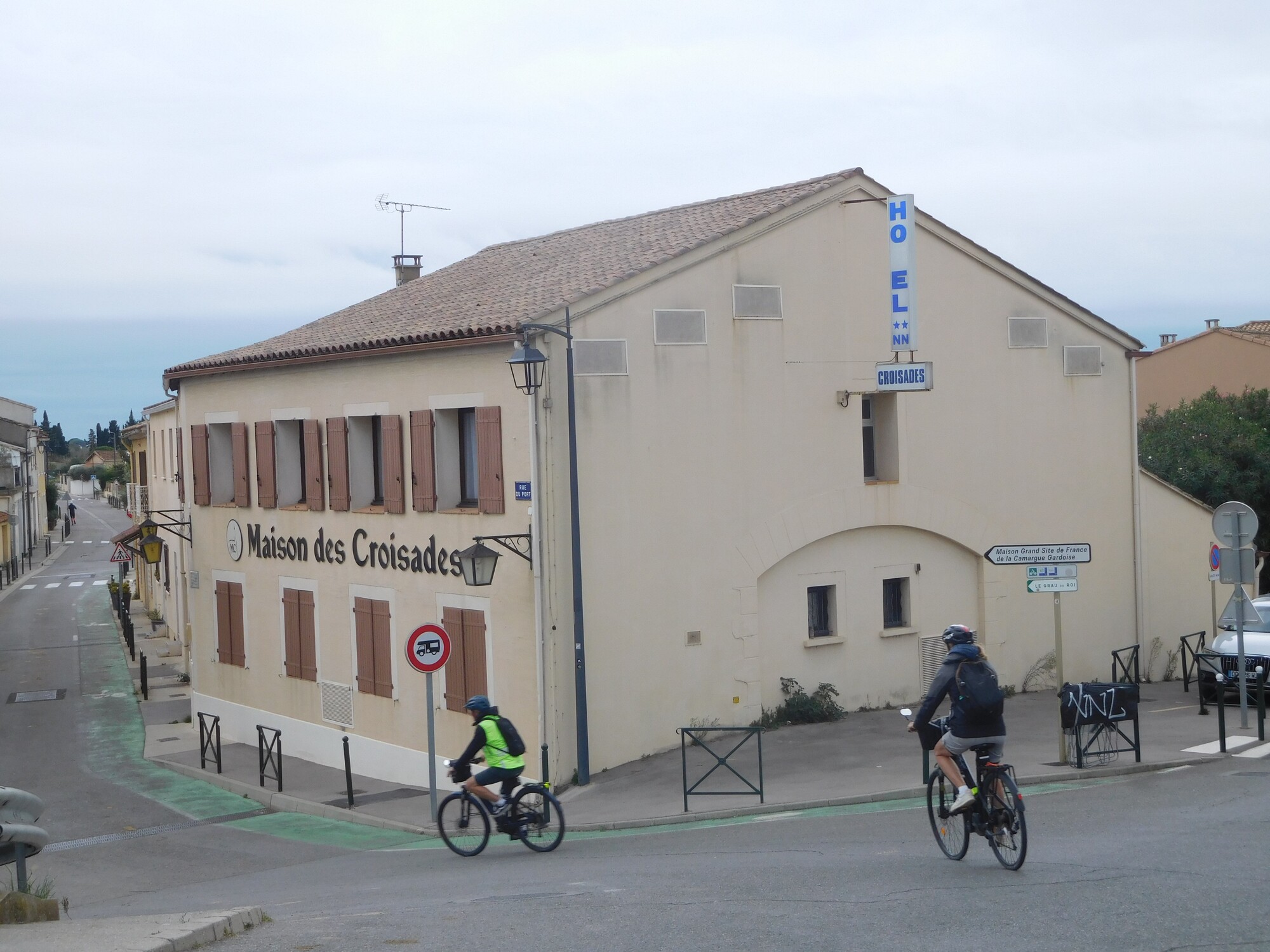 We were really happy with our spot outside Aigues Mortes, which again offered a ground floor entrance , so the bikes could be unloaded and loaded right there, plus power at both sides of the bed. These are almost all our rather humble requirements to be happy in a room. But oh, a first, this had a bathtub of full North American length and almost the right width. That meant I could get in and out without 15 minutes of planning and gymnastics. The only glitch was the lack of a plug. This was remedied by consulting reception, who said they confiscated all the plugs because so many get stolen. So anyway, I signed one out!