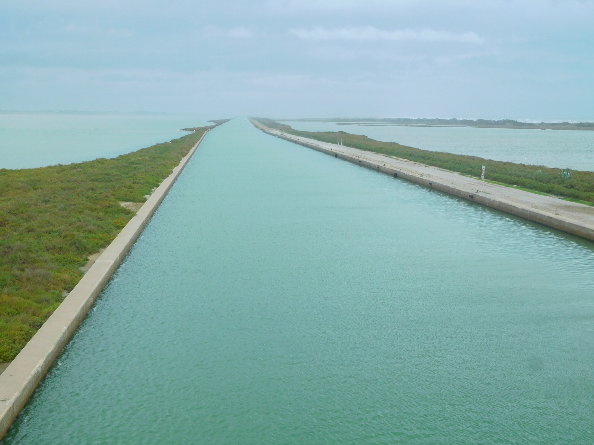 Around this point we had a decision to make. Accessed from the Maguelonne cathedral, there is a rather strange continuation of the canal. It's strange, because the canal runs through water. There is water left and right, and water in the middle, but a strip of dry land you can cycle on. And this way is 20 km shorter than the "official" EV 8 alternative.