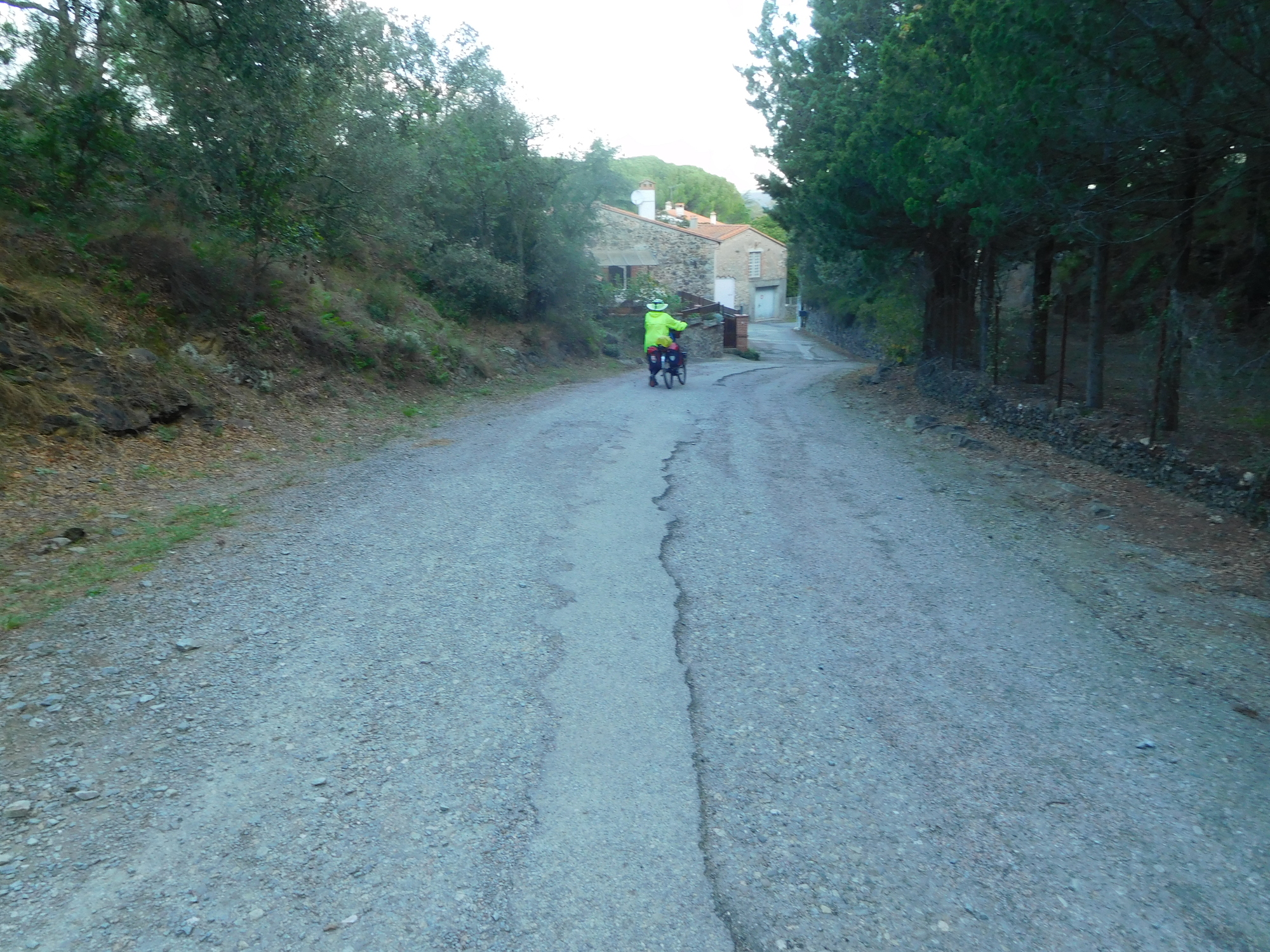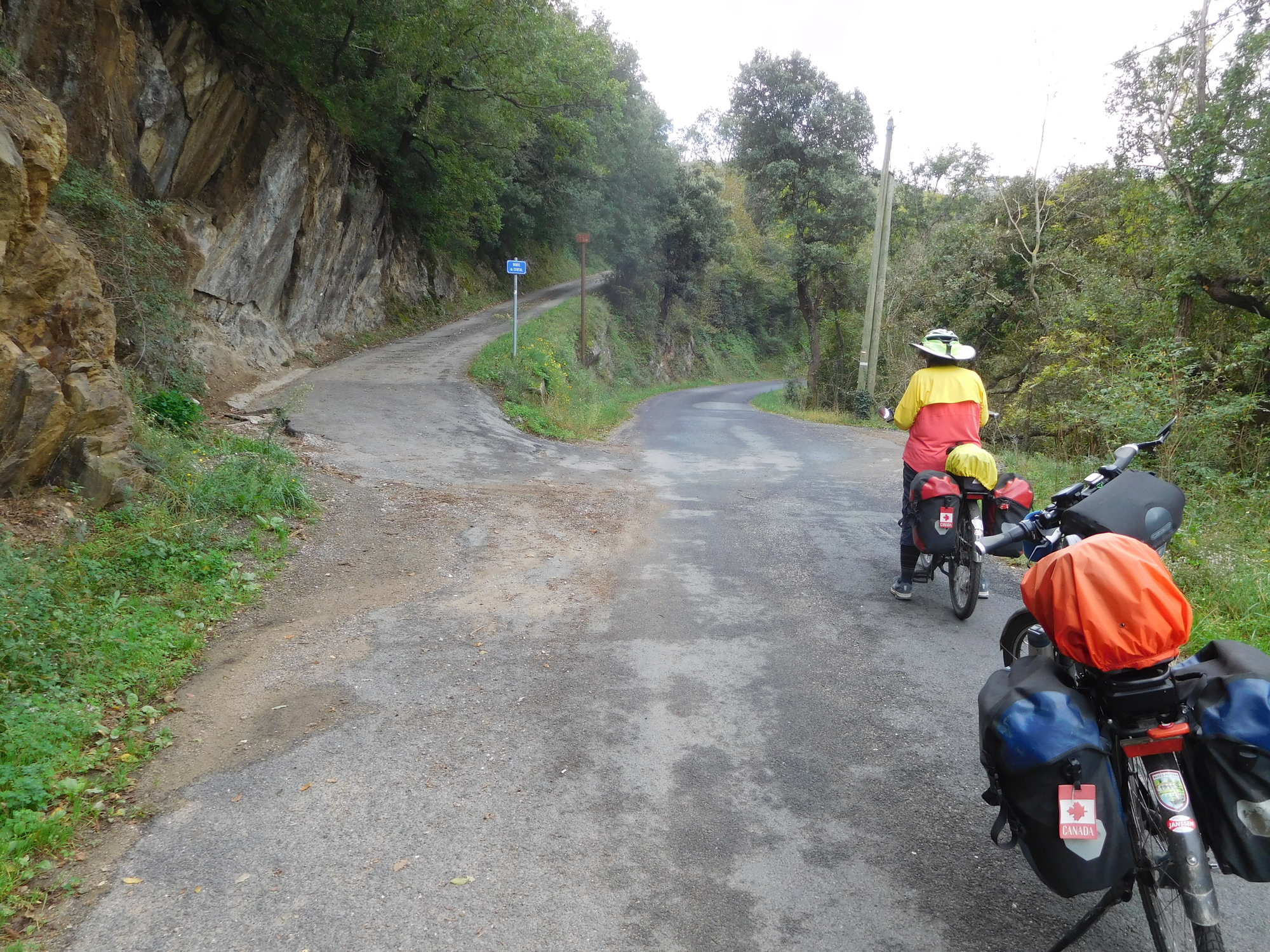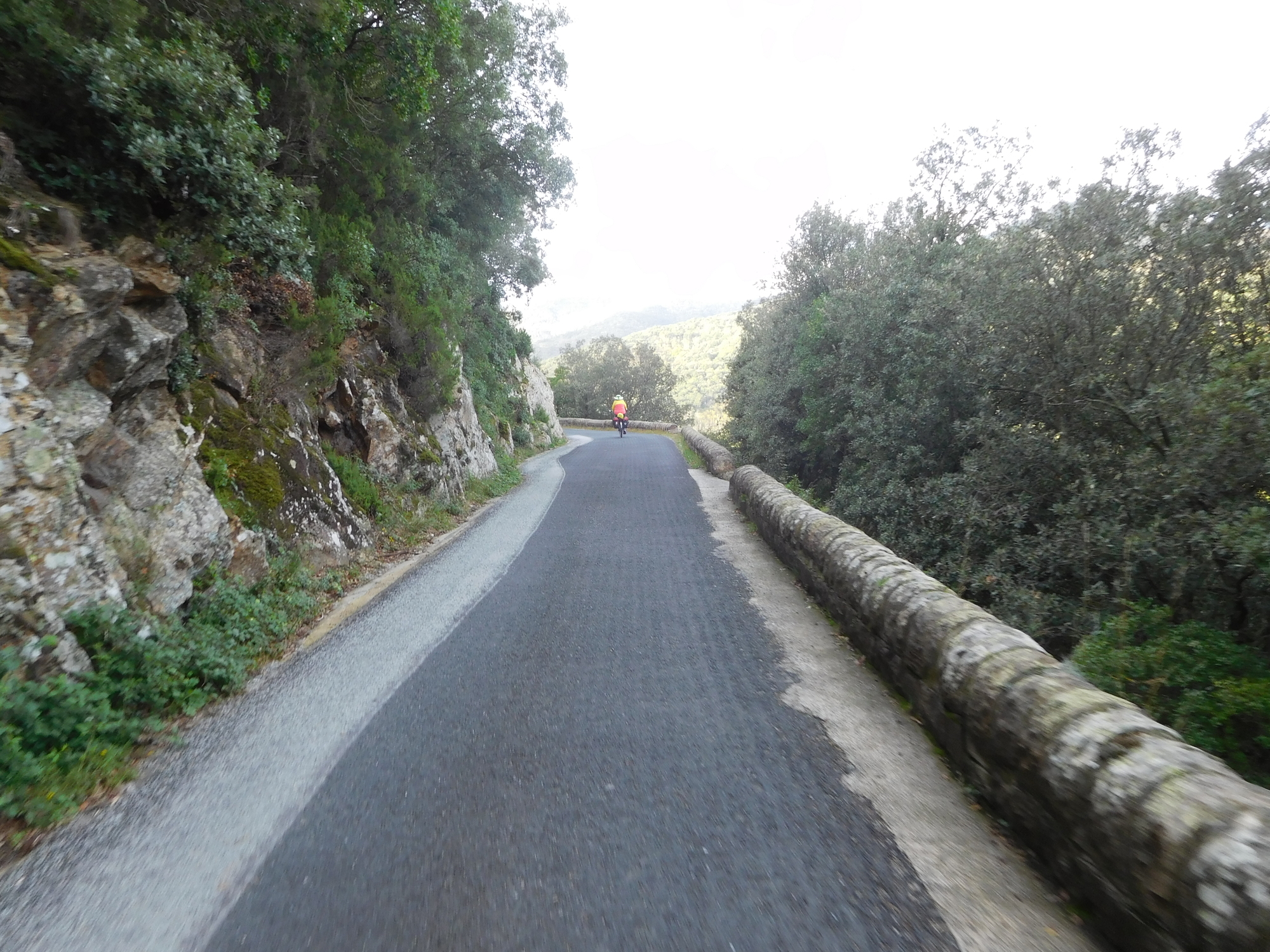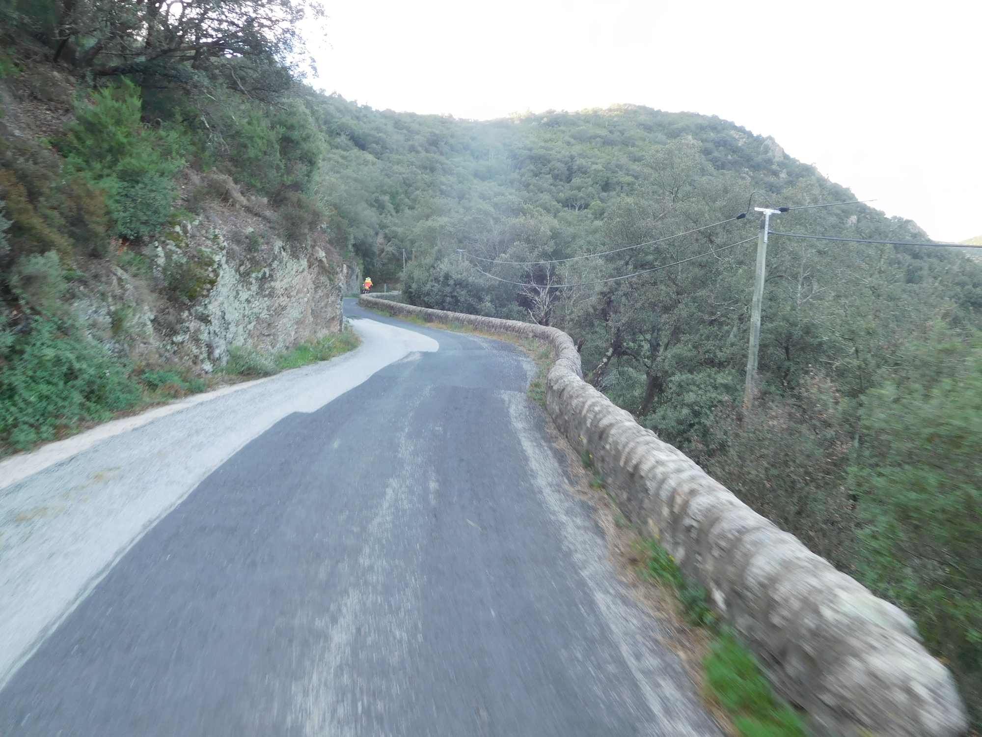 We set off down the Spanish side, where the road is very good, but steep and seemingly going on forever. There is no way we or anyone else would want to ride (push!) up this thing. On the other hand, it was only 8 km (straight) down to Agullana, so with patience it might be possible to climb it.