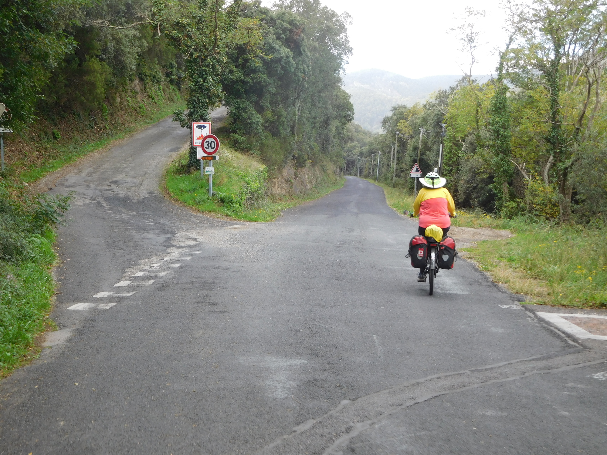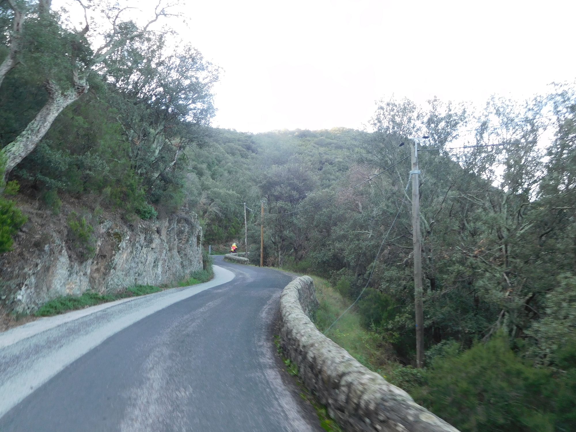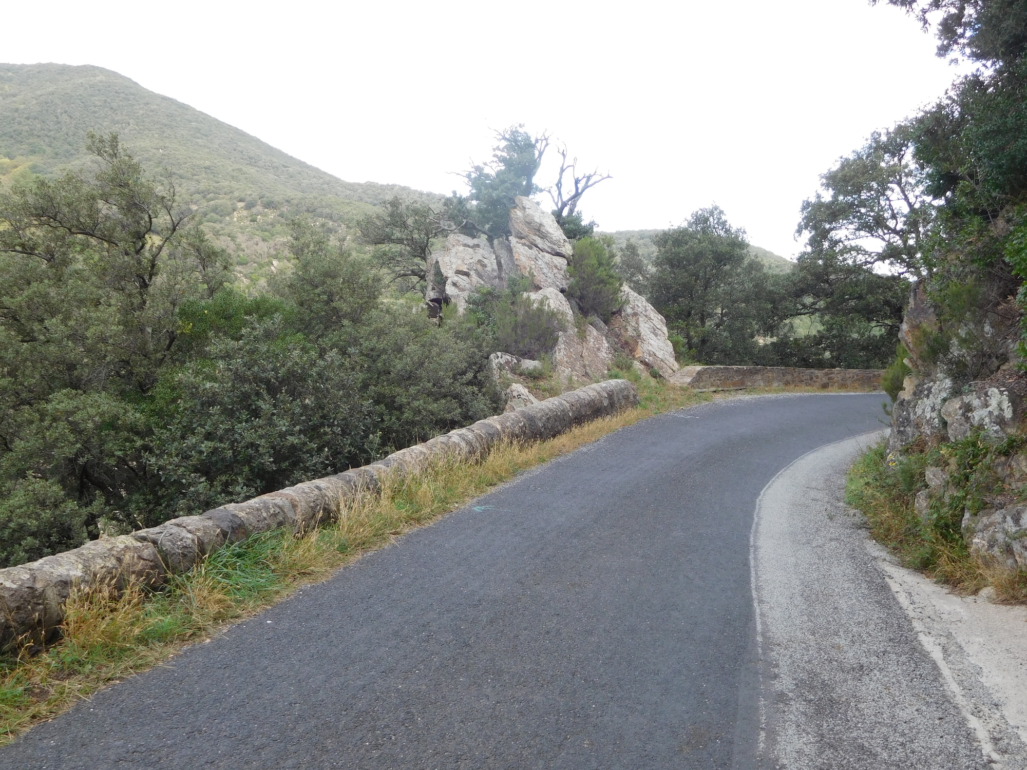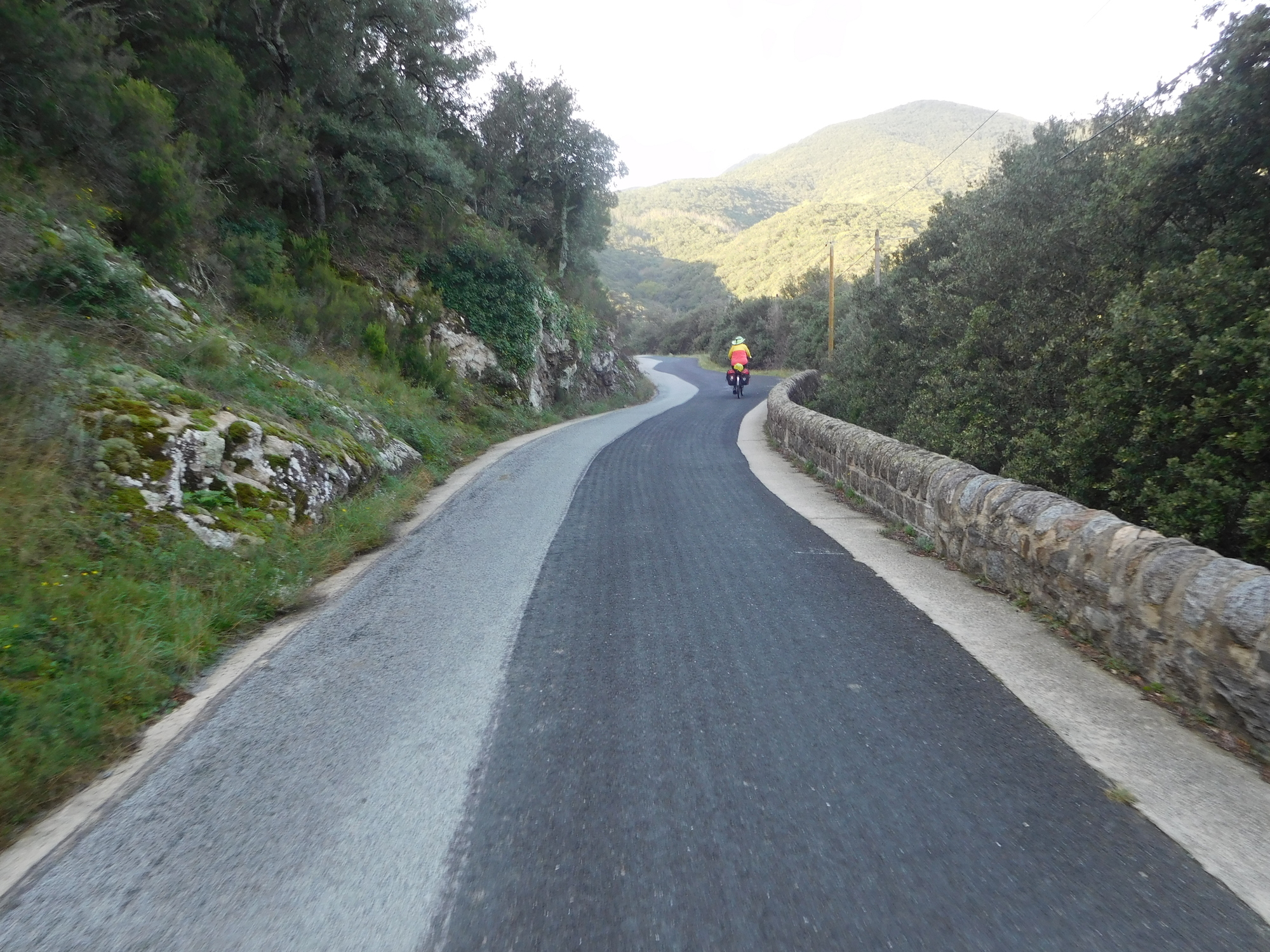 We set off down the Spanish side, where the road is very good, but steep and seemingly going on forever. There is no way we or anyone else would want to ride (push!) up this thing. On the other hand, it was only 8 km (straight) down to Agullana, so with patience it might be possible to climb it.
