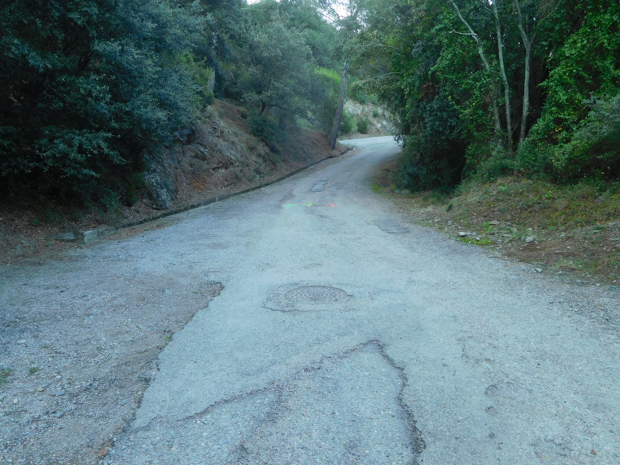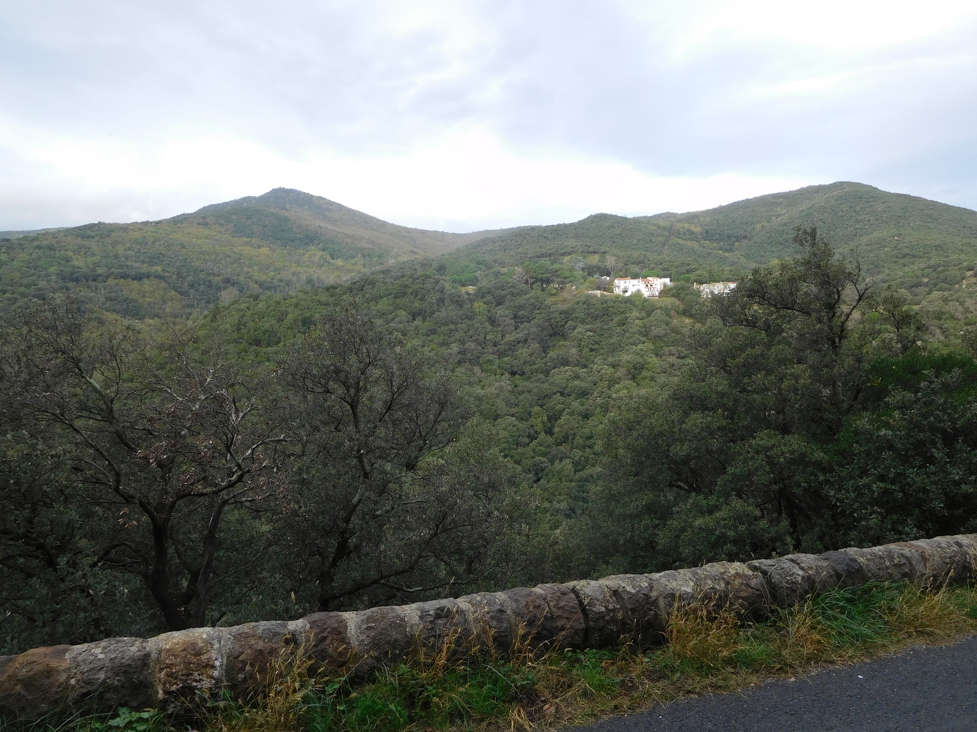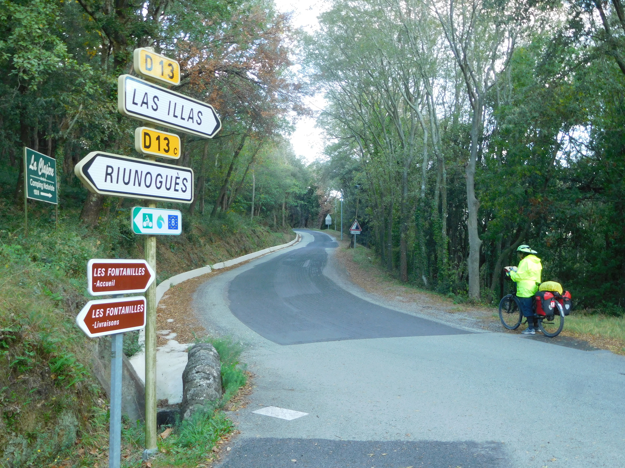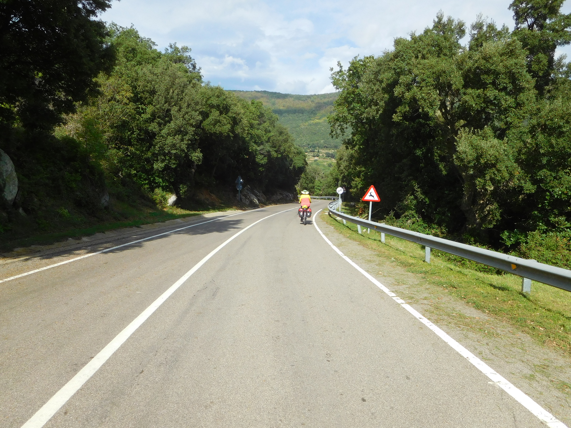 We set off down the Spanish side, where the road is very good, but steep and seemingly going on forever. There is no way we or anyone else would want to ride (push!) up this thing. On the other hand, it was only 8 km (straight) down to Agullana, so with patience it might be possible to climb it.