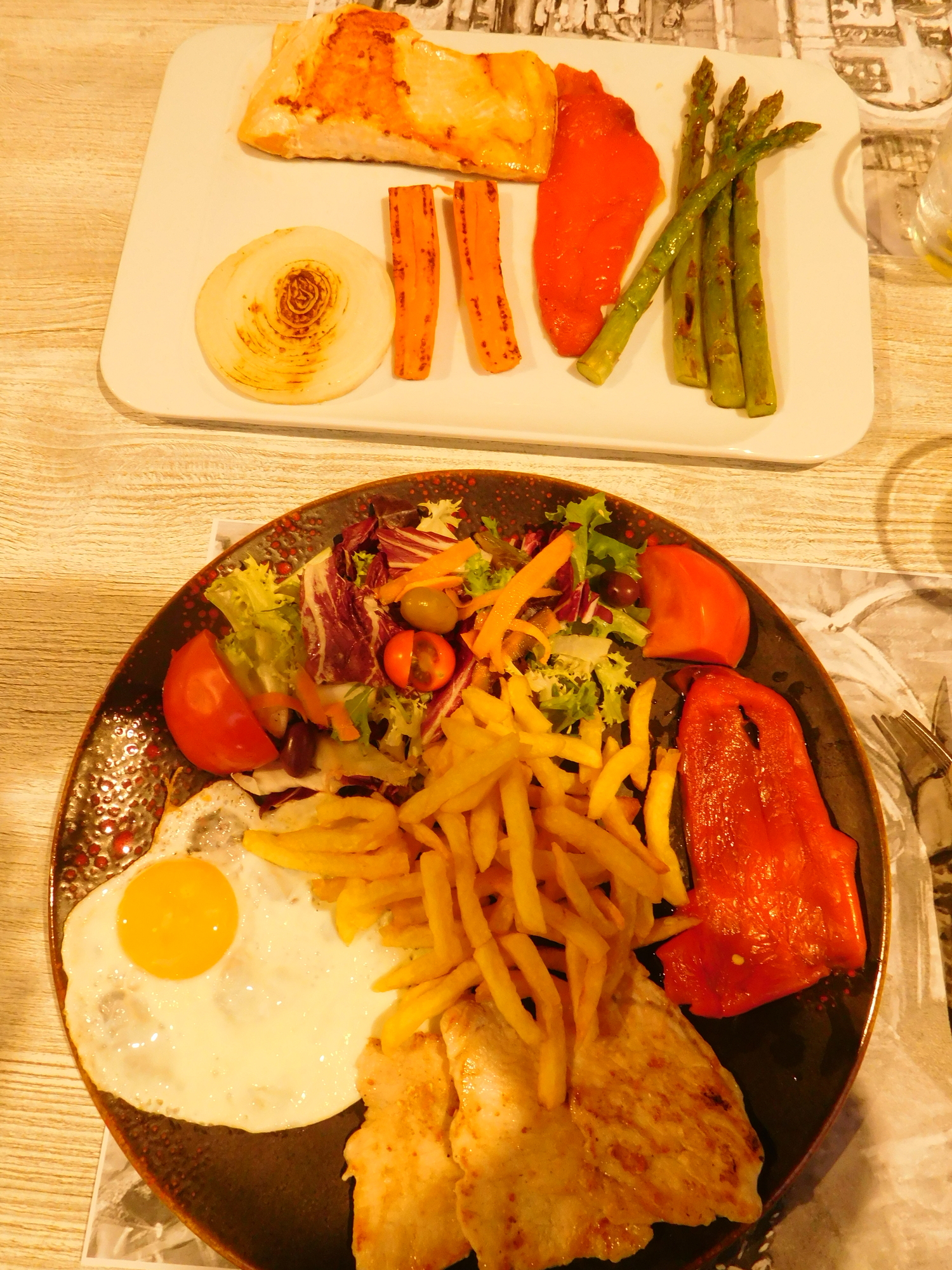 We chose a restaurant in the City Hall square, and feel we struck it lucky. What we got was not only what Dodie loves, but really just what our systems need at this point. On Dodie's plate (top) was not only the well prepared salmon, but also perfectly cooked asparagus, red pepper, carrot, and a very sweet onion. For me there was a fried egg, seldom seen when in France, a salad with very tasty olives and a good tomato, and "lomo" - pork filet. These dishes were in the 12 euro range - great!