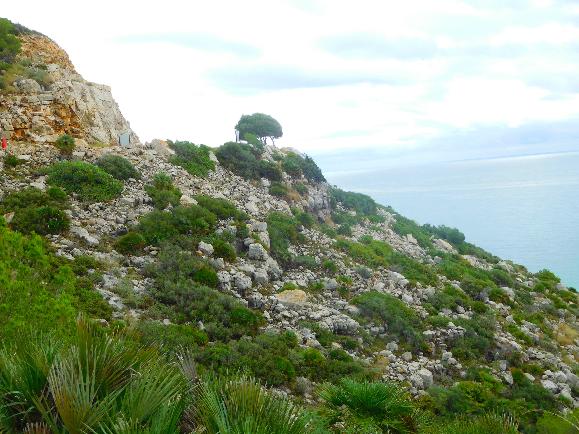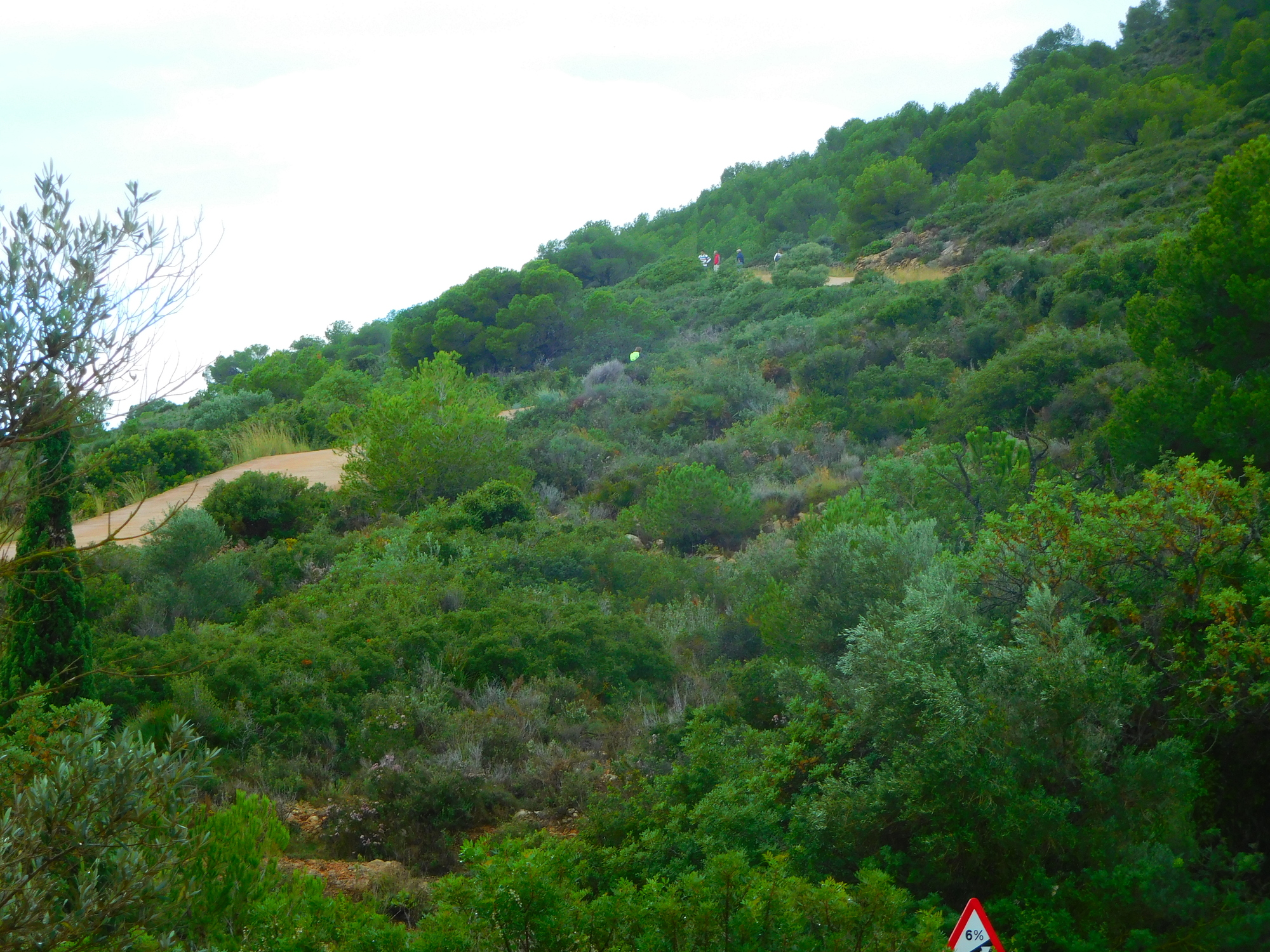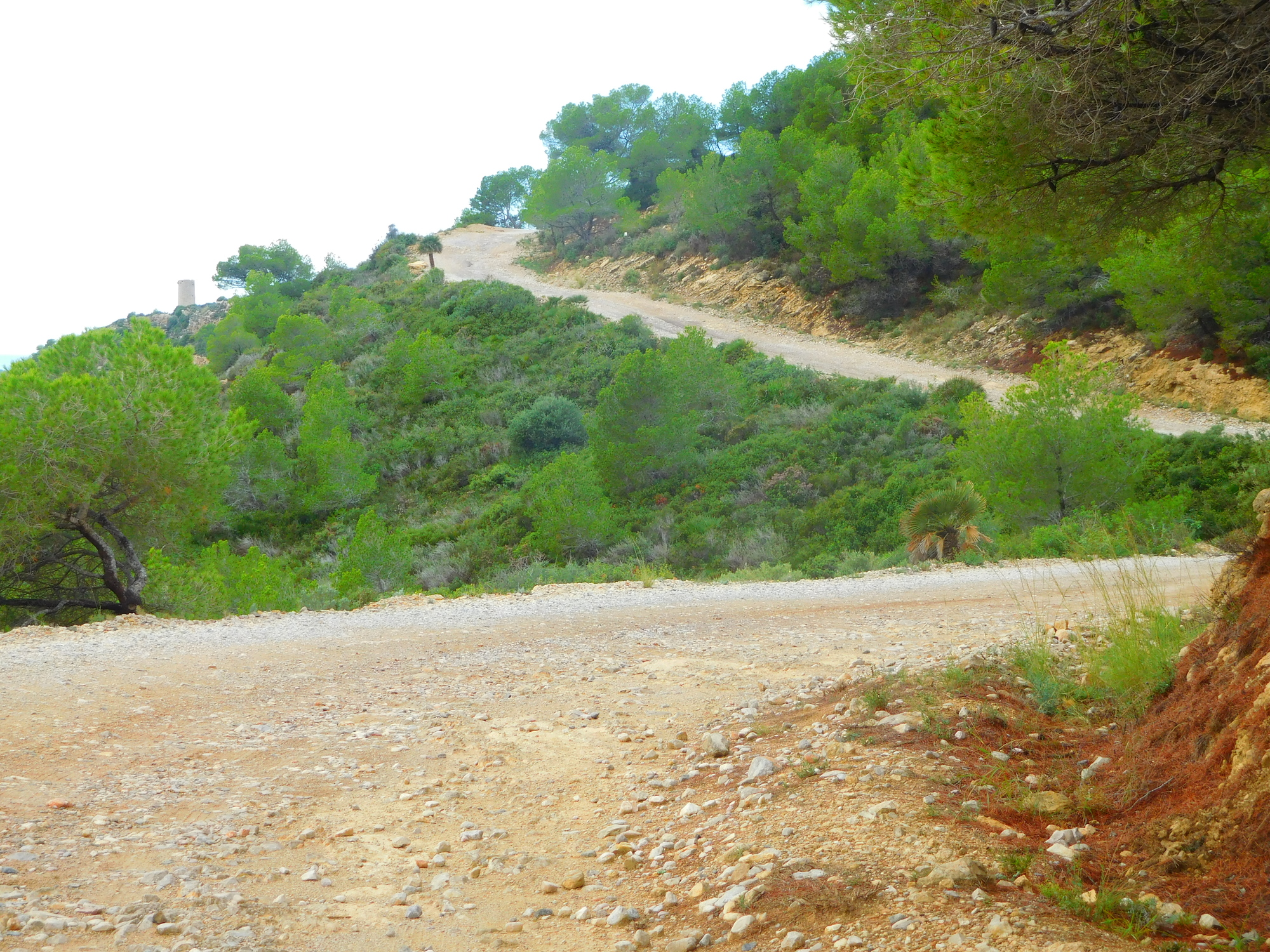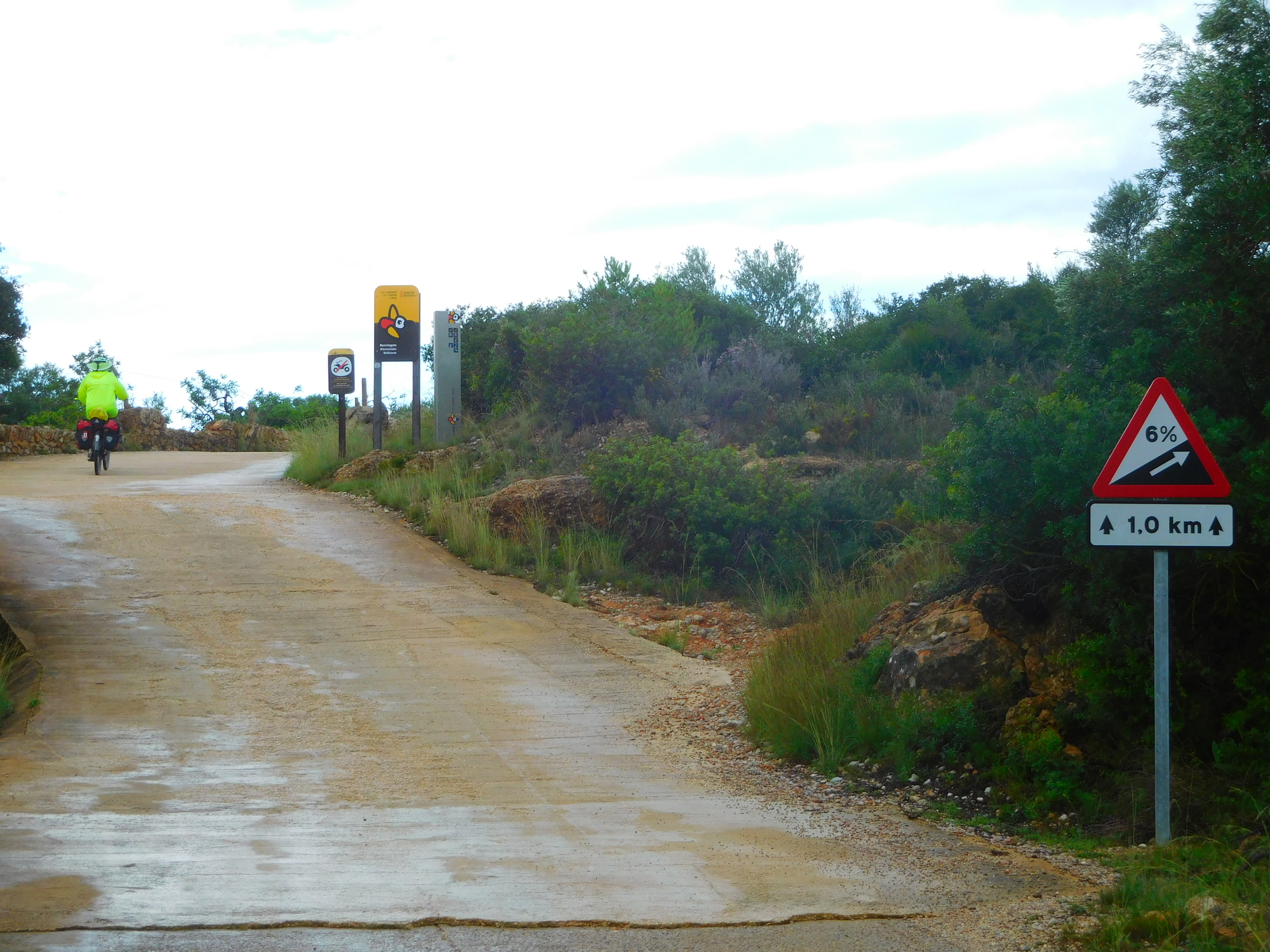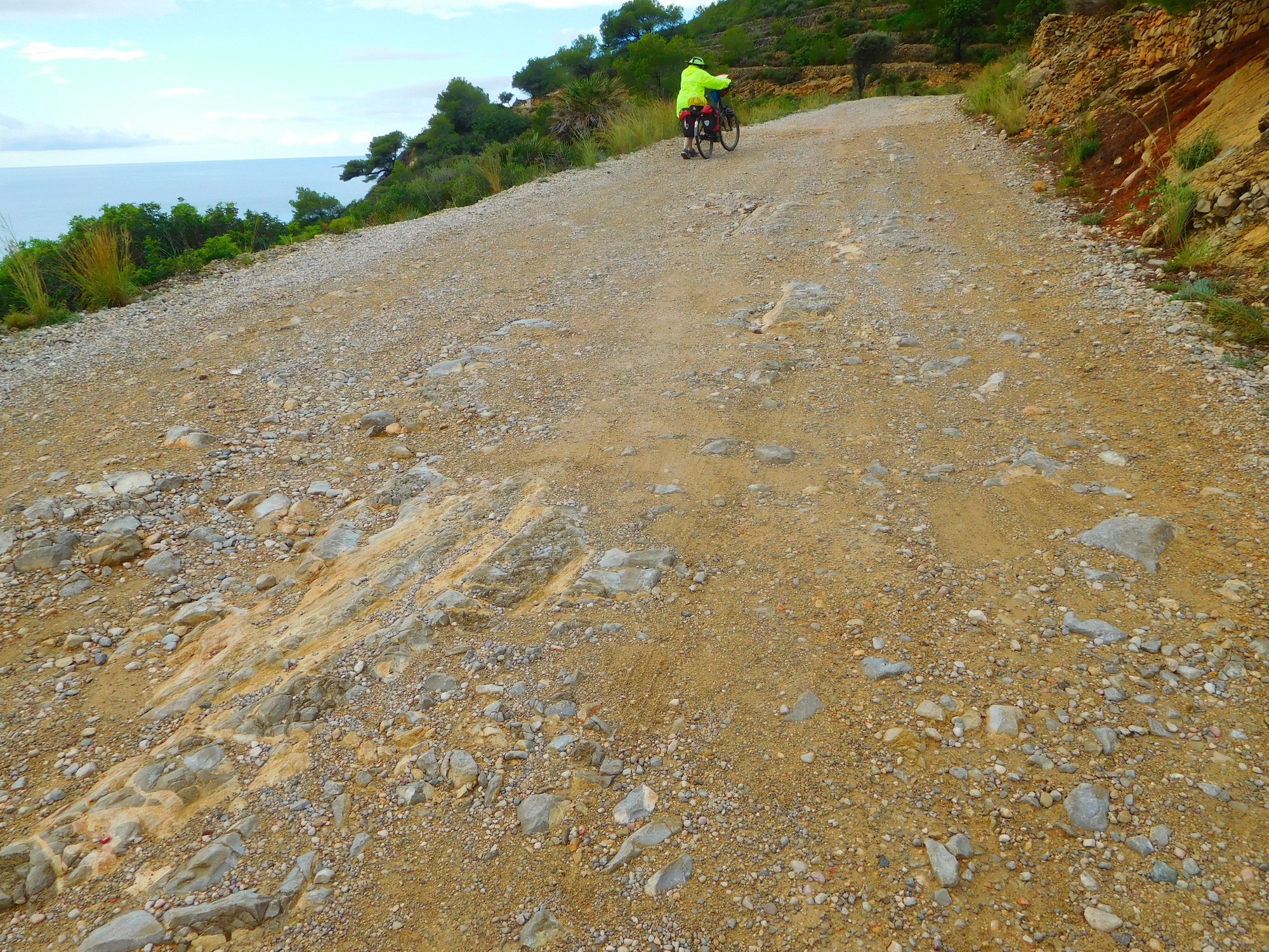 Coming down past the tower, we are on our way to the sea level, visible up ahead. The road is concreted here because of the slope, but that will not last at all long.