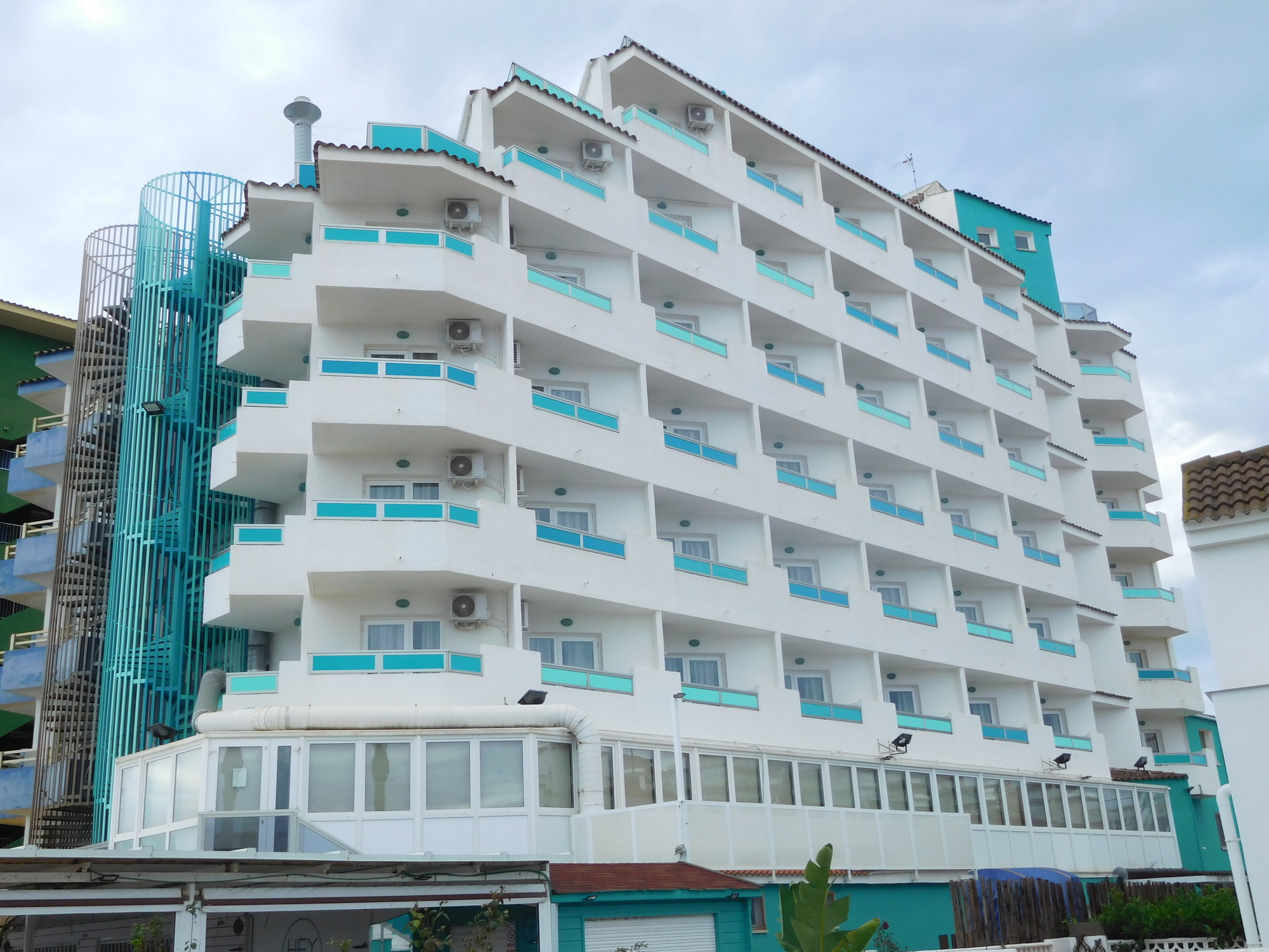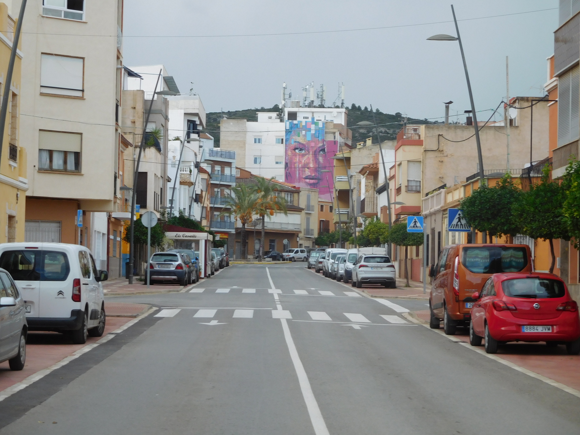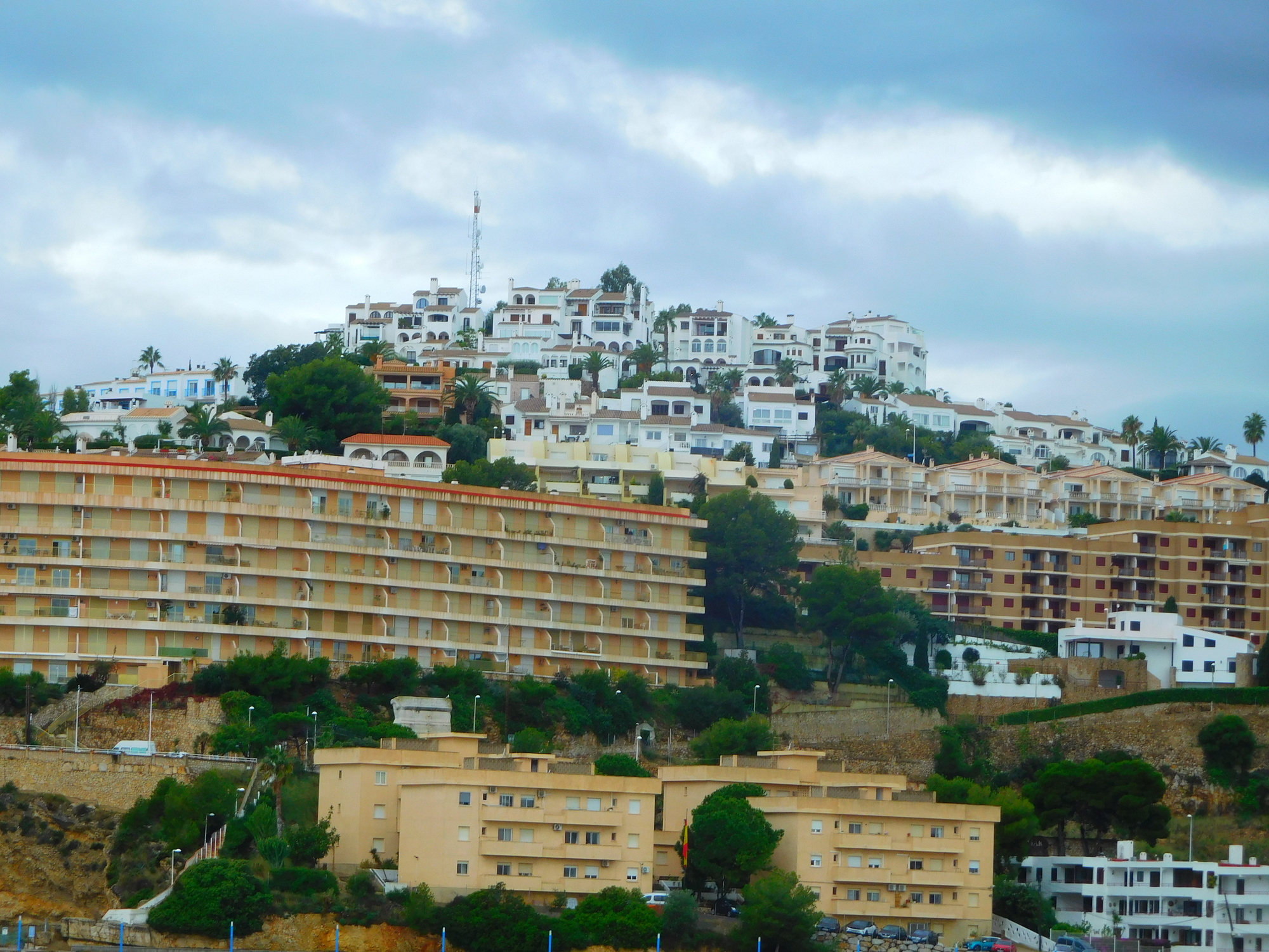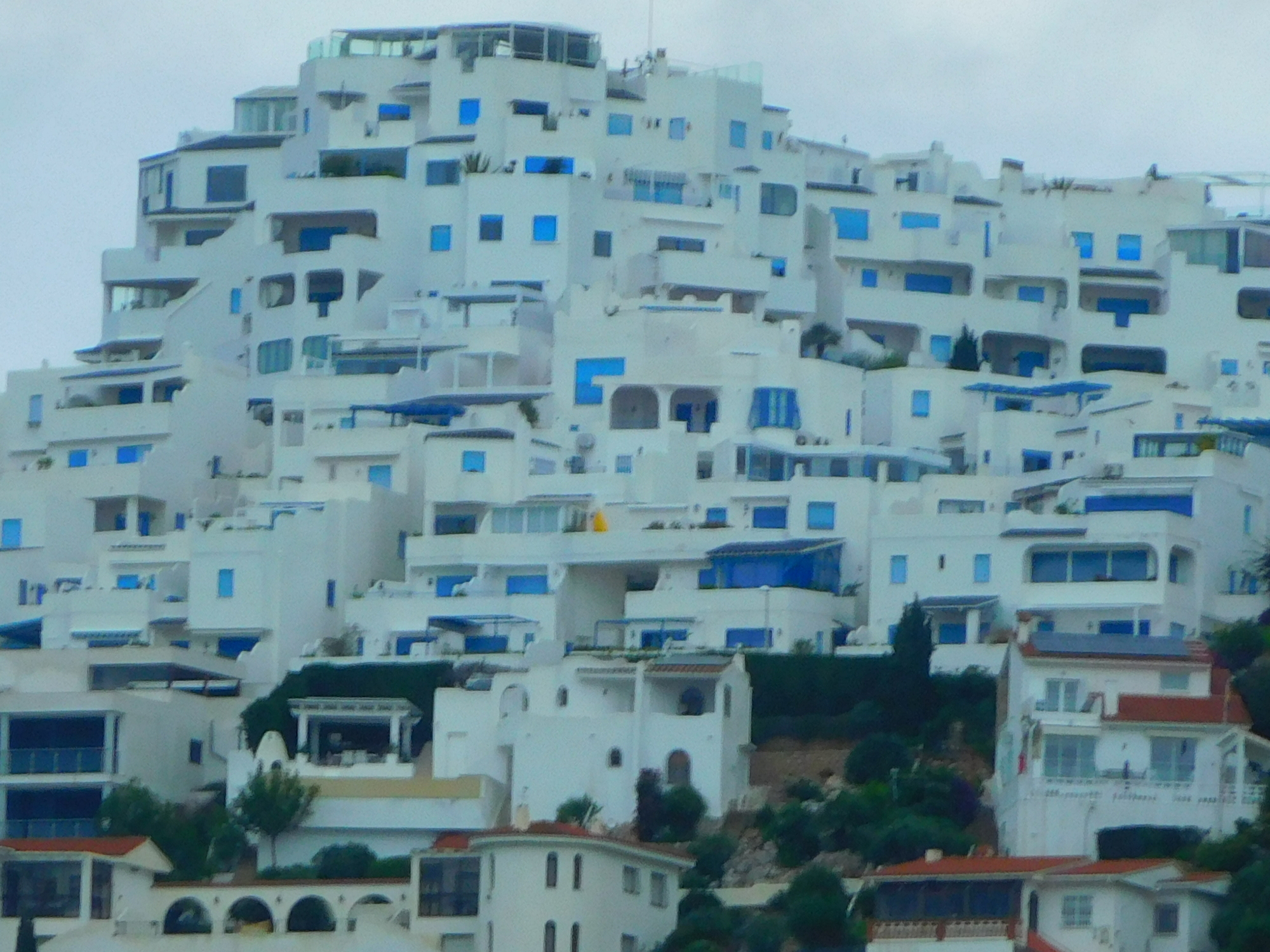Now in behind Benicarlo, we could see housing developments on nearby hills. These, and especially one, were quite dense and crazy and white. We know this type of thing from other travels in Spain, where we call them sugar cube houses, but this was our first encounter with them this trip.