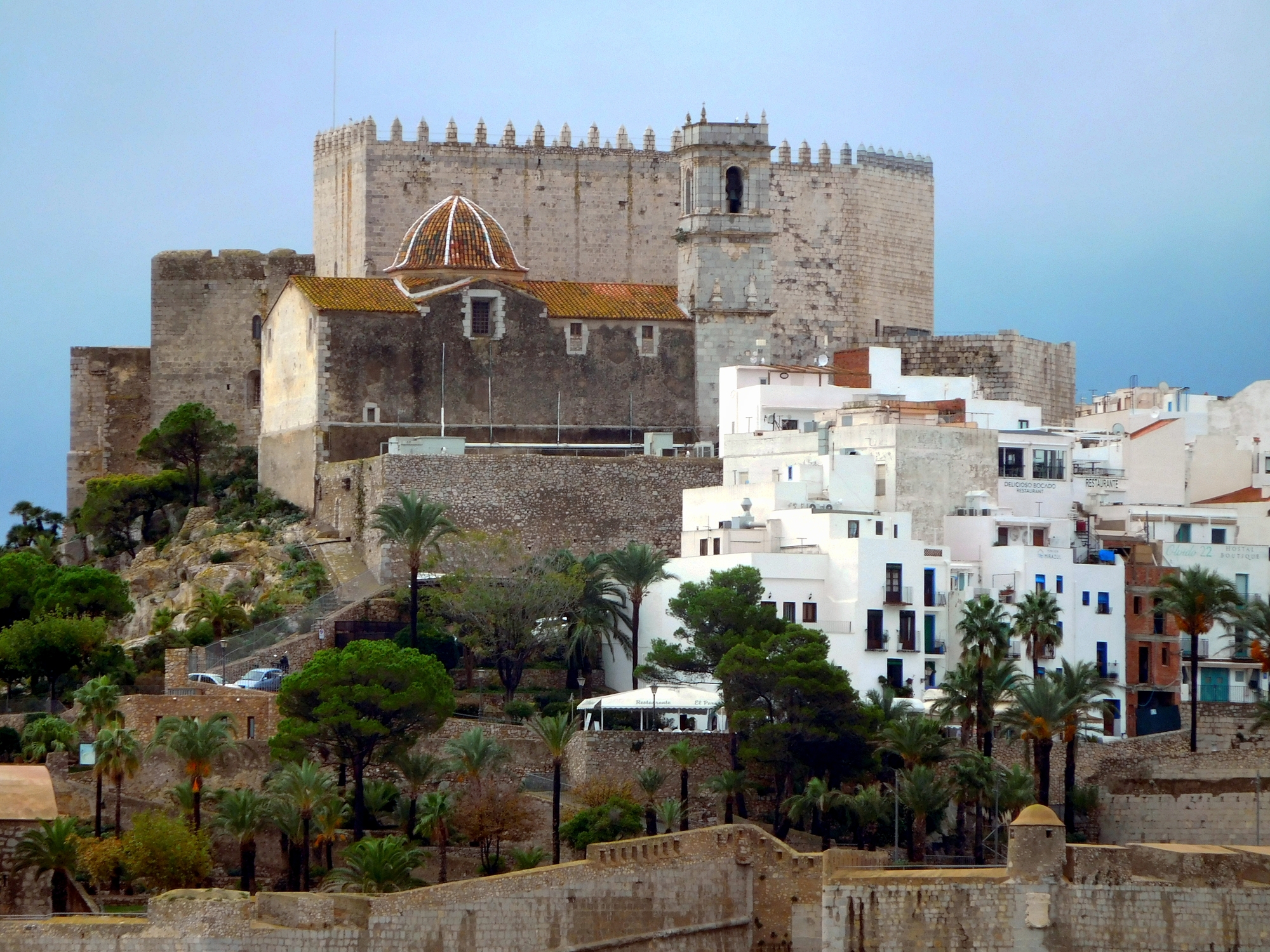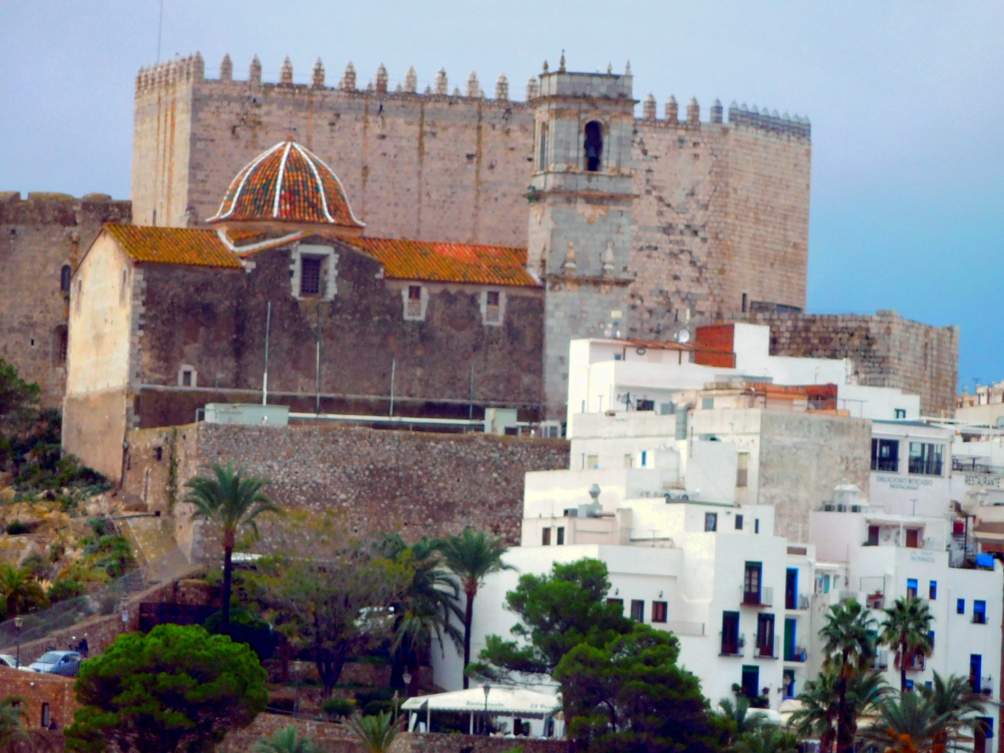 Now in the near distance appeared Peniscola, which is a peninsula jutting out over the sea, 12 km south of Benicarlo. Peniscola gives the same impression as Mont St Michel. It houses more of a castle or fort than a church. As as fort it started as a Moorish stronghold around the 11th century. But in 1229 it was transferred to the control of James I of Aragon, after he forced the Moors to cede several castles in the region. James II of Aragon then gave the place to the Knights Templar, in 1294. The Templars demolished what was there and rebuilt, completing work in 1307.