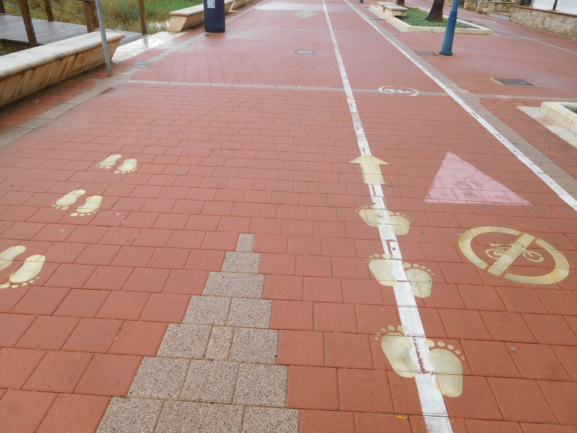 Benicarlo's bike lane now became the object of some consternation. The wide area of pavers included a painted bike width lane, but that lane seemed to be designated no bikes. And this is despite a 10 kph speed limit also painted in. Yet all the effort with the paint did include sets of footprints, some straddling the "bike" lane. What a set of mixed signals! Not to mention that the rather chubby footprints did not seem to represent anyone that could do a 10 k in an hour, especially not without runners! So many thoughts needed, just to pedal down the way!
