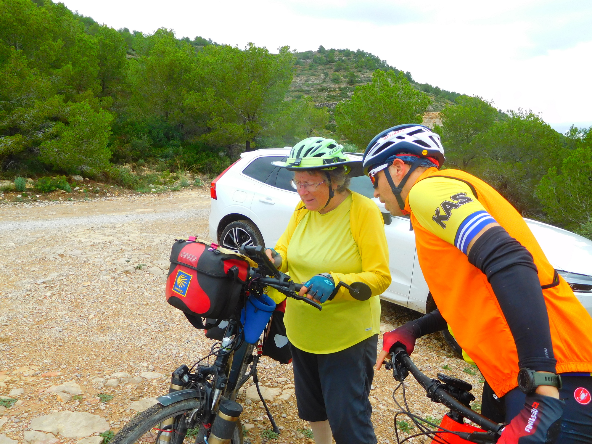 You can see in this photo that cars can make it up here. We ran into a local cyclist, with a mountain bike. He was unloaded and had big cushiony tires, and gearing with one tiny wheel in the front and 12 on a rear cluster, ranging up to seriously huge. He was interested in our trip, and could sympathize with how we might struggle on this road, though he comes out here just for entertainment. Can't quite see it in the photo but Dodie and this serious cyclist both had Giro helmets.