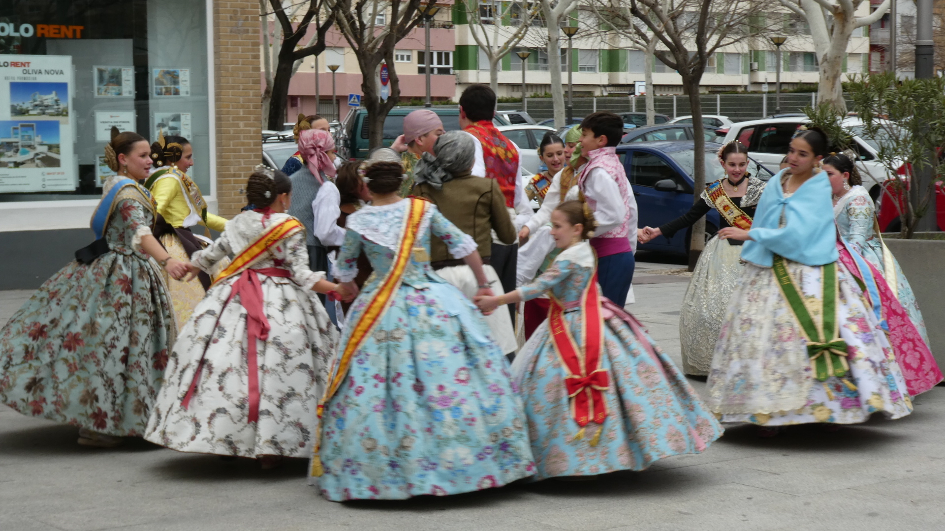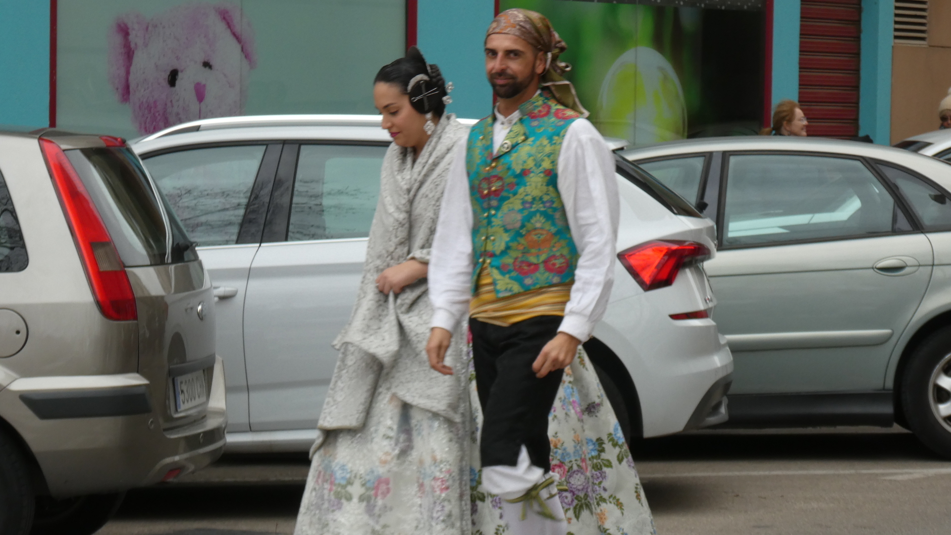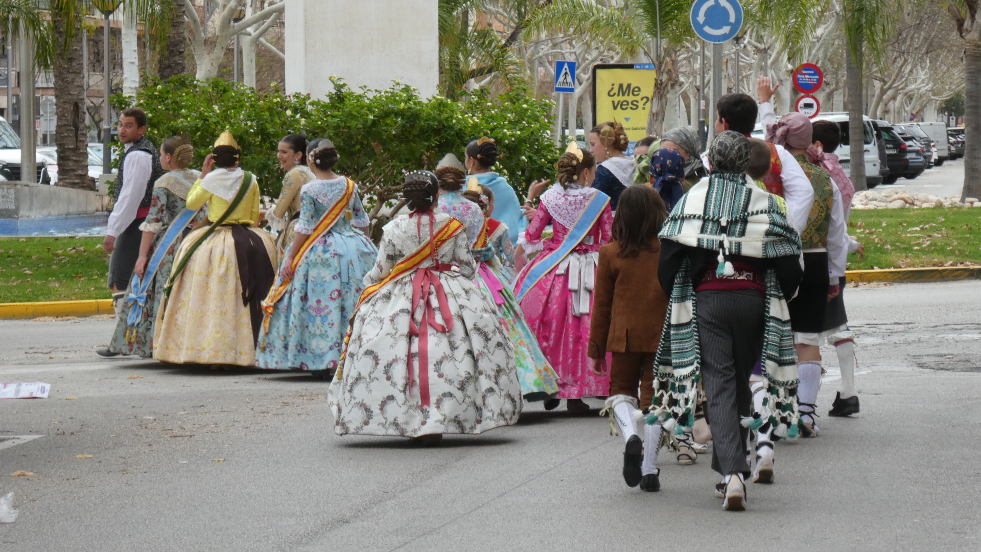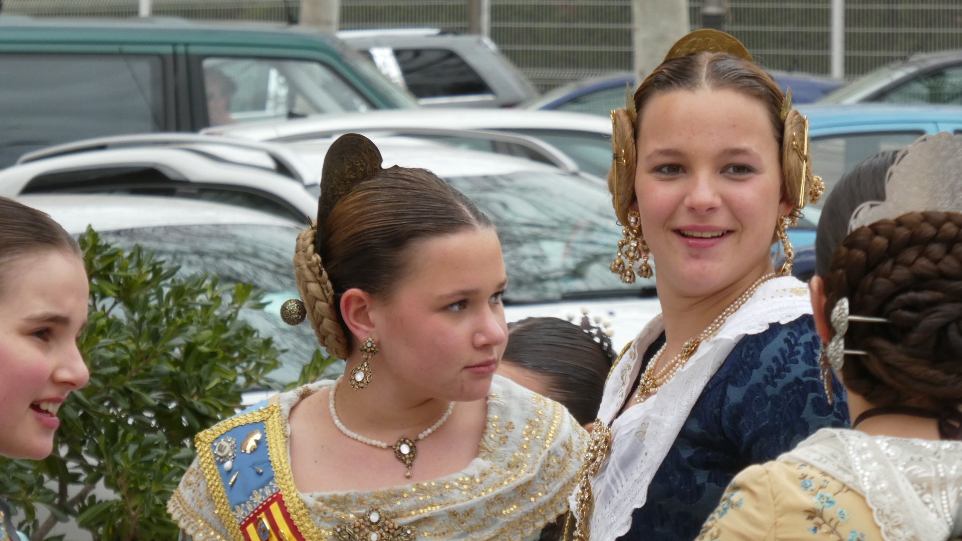 In Oliva, we were at a traffic light and were surprised to hear a parade approaching, with a band. This turned out to be a procession of people all dressed up in traditional costumes. There was a person carrying a banner at the head of the procession, but we missed that, and did not catch quite what the group was about. We spoke to some of them, but could only gather that this was some sort of fiesta. At any rate, they had great outfits, and we saw that all the women had taken great care with the traditional hair arrangement and ornaments, as well as with jewelry.