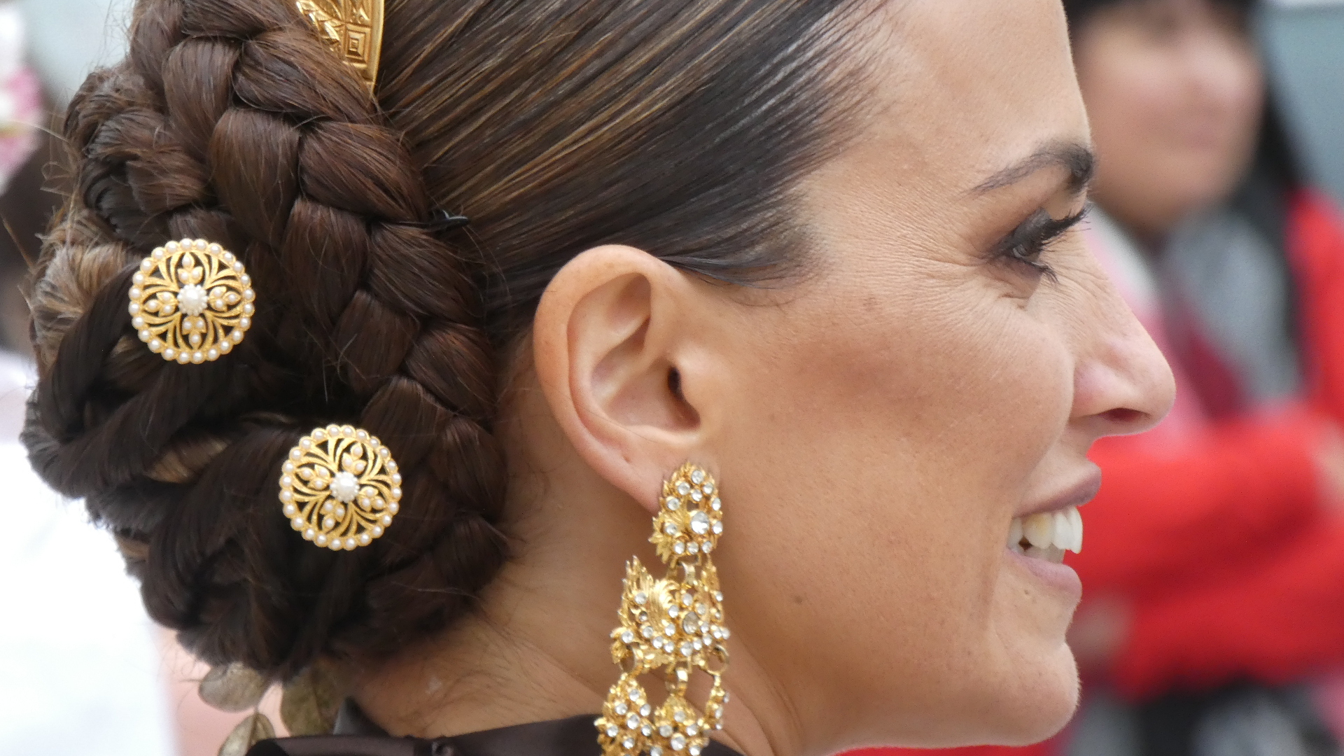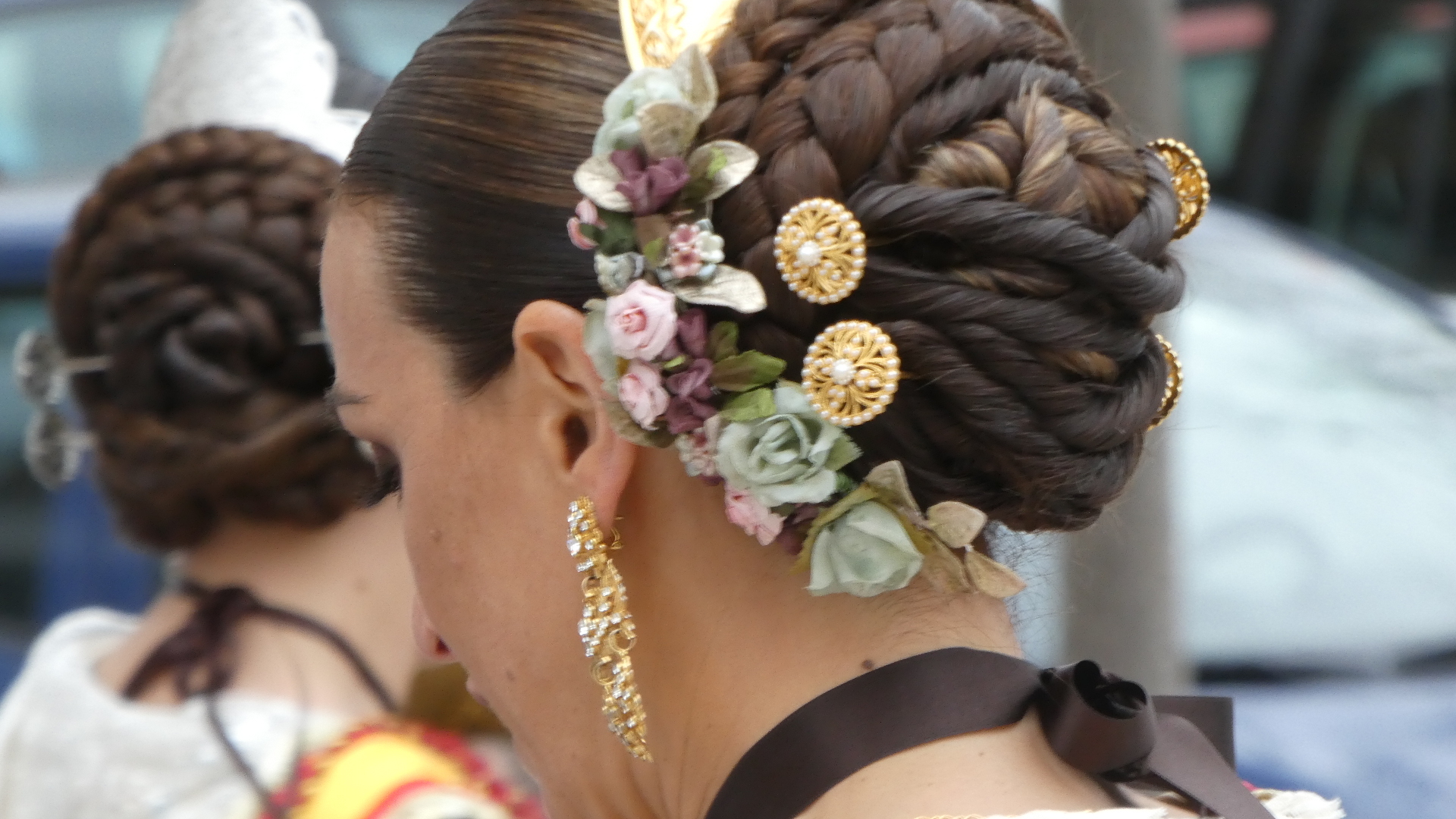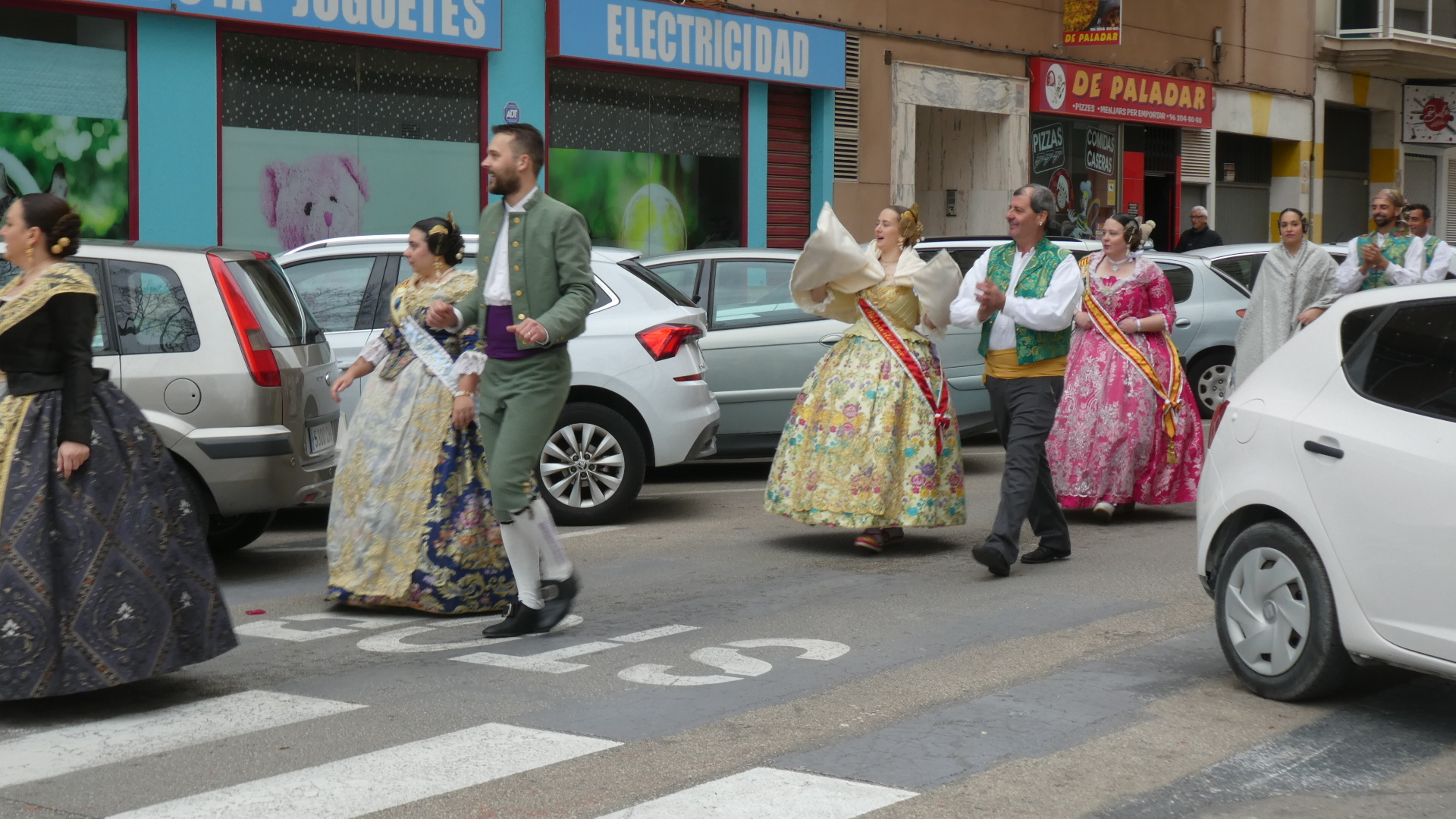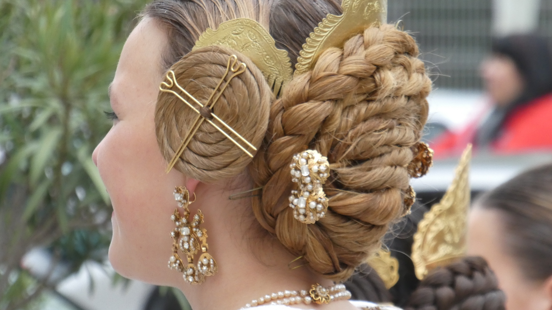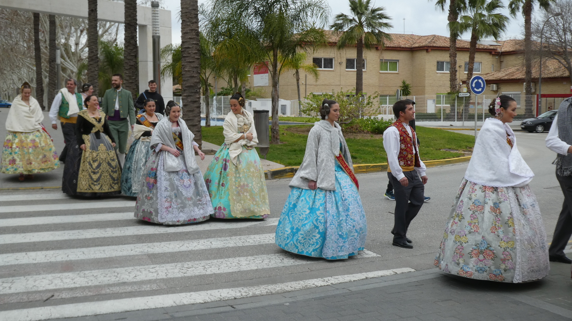 In Oliva, we were at a traffic light and were surprised to hear a parade approaching, with a band. This turned out to be a procession of people all dressed up in traditional costumes. There was a person carrying a banner at the head of the procession, but we missed that, and did not catch quite what the group was about. We spoke to some of them, but could only gather that this was some sort of fiesta. At any rate, they had great outfits, and we saw that all the women had taken great care with the traditional hair arrangement and ornaments, as well as with jewelry.