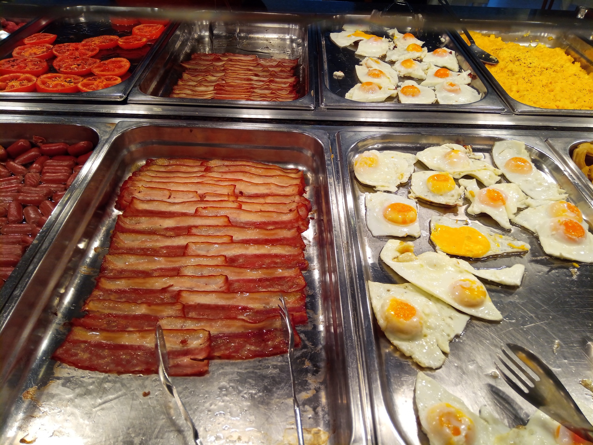 The actual breakfast on offer was very good, perhaps betraying a lot of British customers by having stewed tomatoes and little hot dogs. Something I liked was the fried, not scrambled eggs.