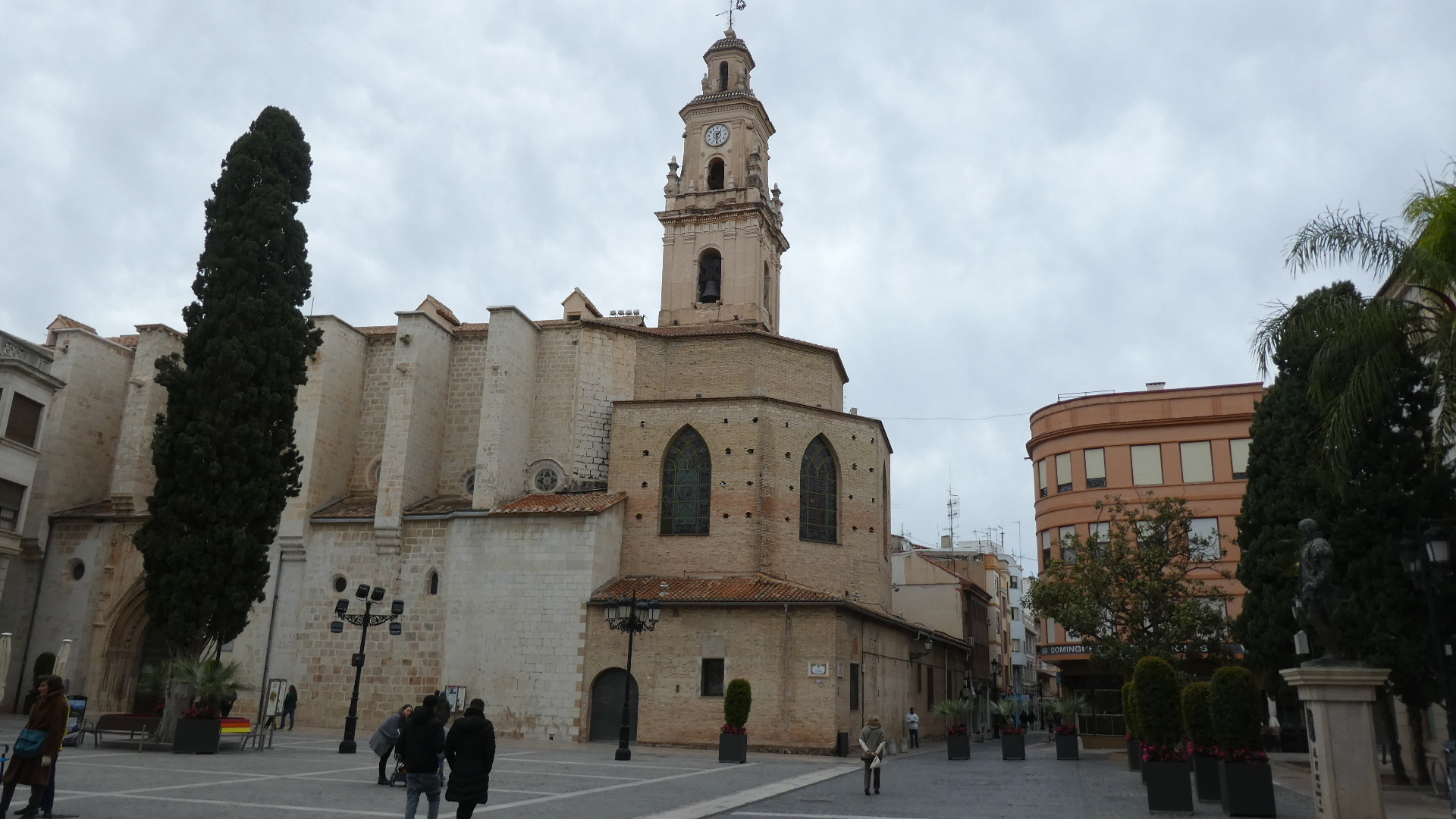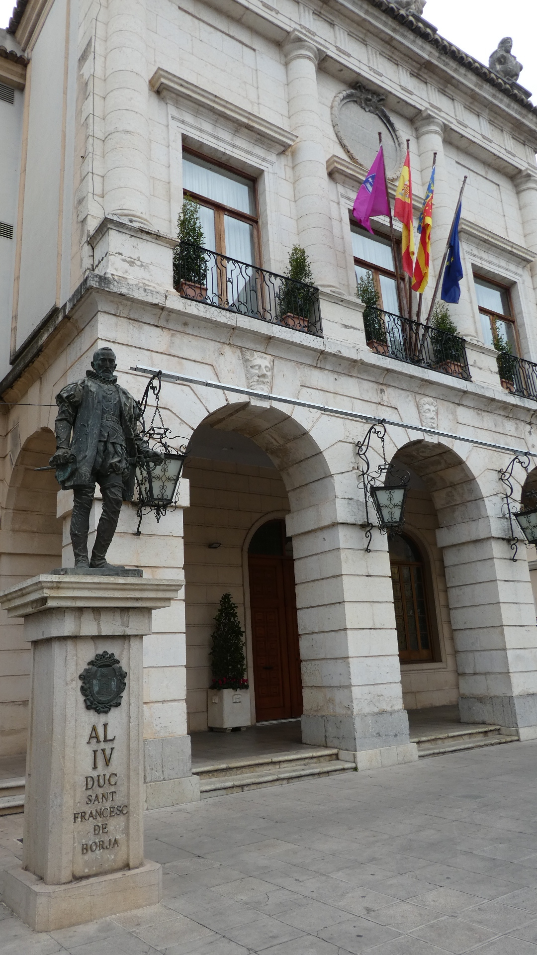 As is common with central squares in Europe (and Mexico), there is both a church and a town hall with frontage. Below a statue of a Borja duke stands before a restored ducal palace, now the city hall.