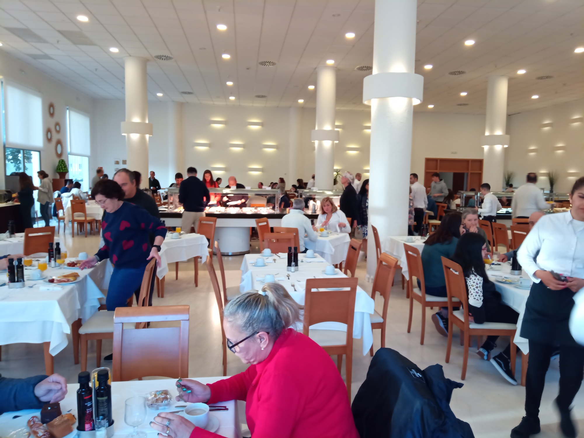 When it comes to rating breakfasts a lot of factors have been mentioned by Cycleblazers in the past. But something that is not often mentioned is the size and decor of the breakfast room, and the number and activity of the serving staff. These factors are even debatable. A classy room does not make us happy, because we are not classy people. And a lot of serving staff buzzing around is trouble, if you are trying to squirrel away some sandwiches for later. Today we had a large and classy room, and a crazy number of staff around, at least 8, but they were hard to count as they were constantly moving. The staff was popping up to pour juice for us, and any time they saw a stray plate, the would grab it and spirit it away. But it was OK, and I am eating my spare sandwich right now as I write this!