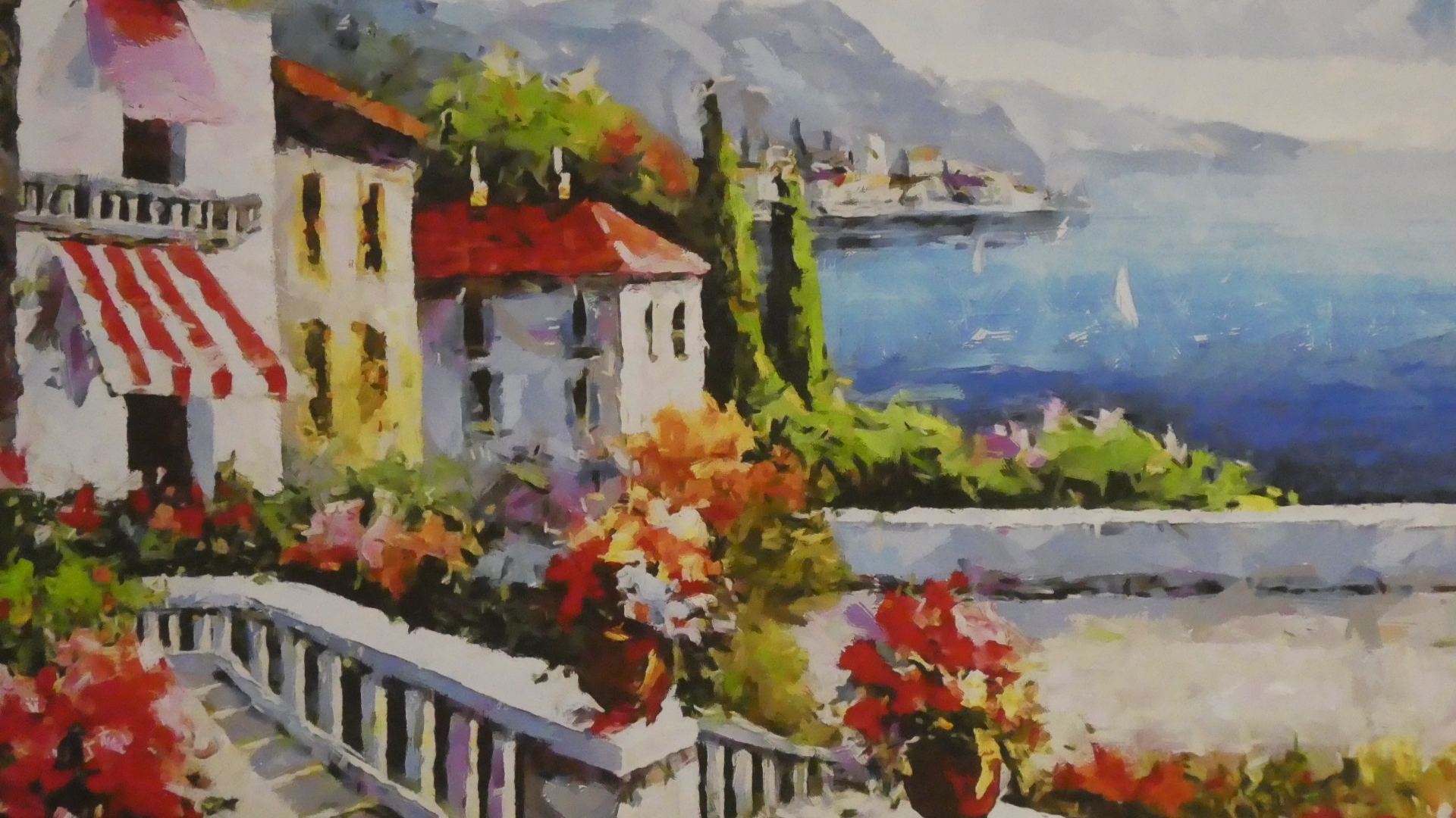 Lots of times in Europe, even in moderately priced hotels, I have noticed that the building materials are of far higher quality than what we find in our own house. This was the case last night, where the modest El Patio had great tiles on the floors, a fully tiled bathroom, and a super shower fixture and enclosure. One other thing was a rather nice painting on the wall. I copied that below. No way to take the shower fixture as well, unfortunately.