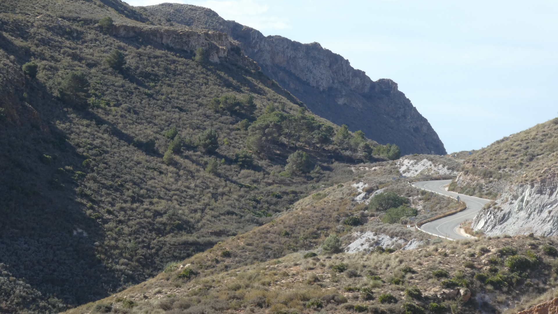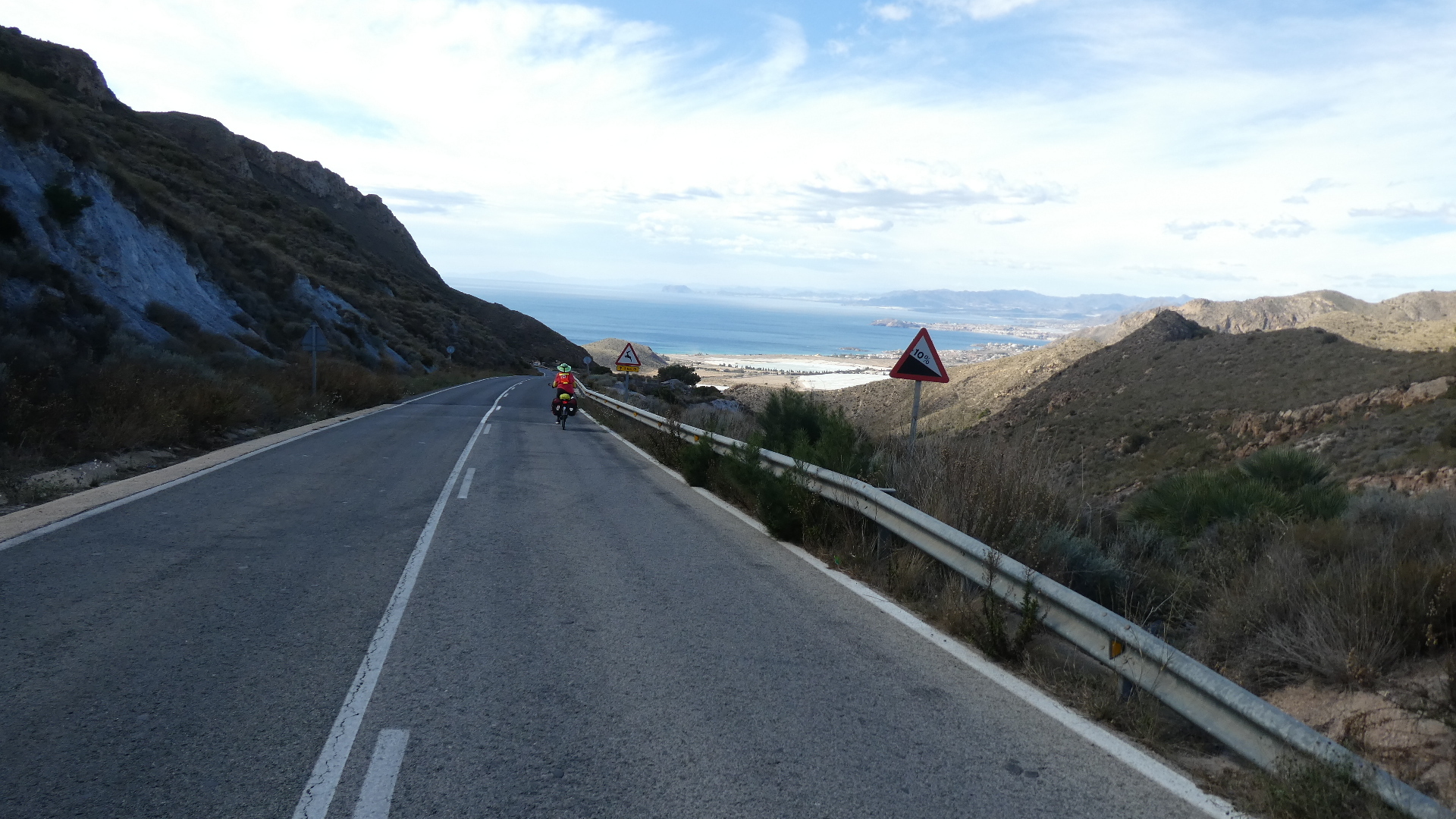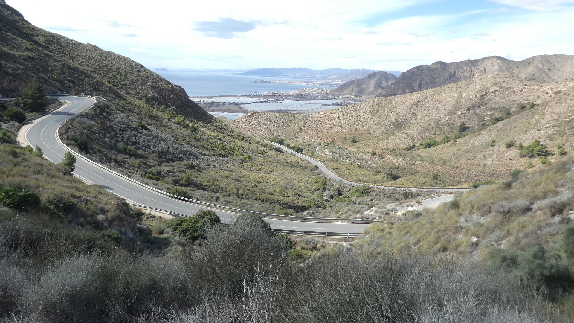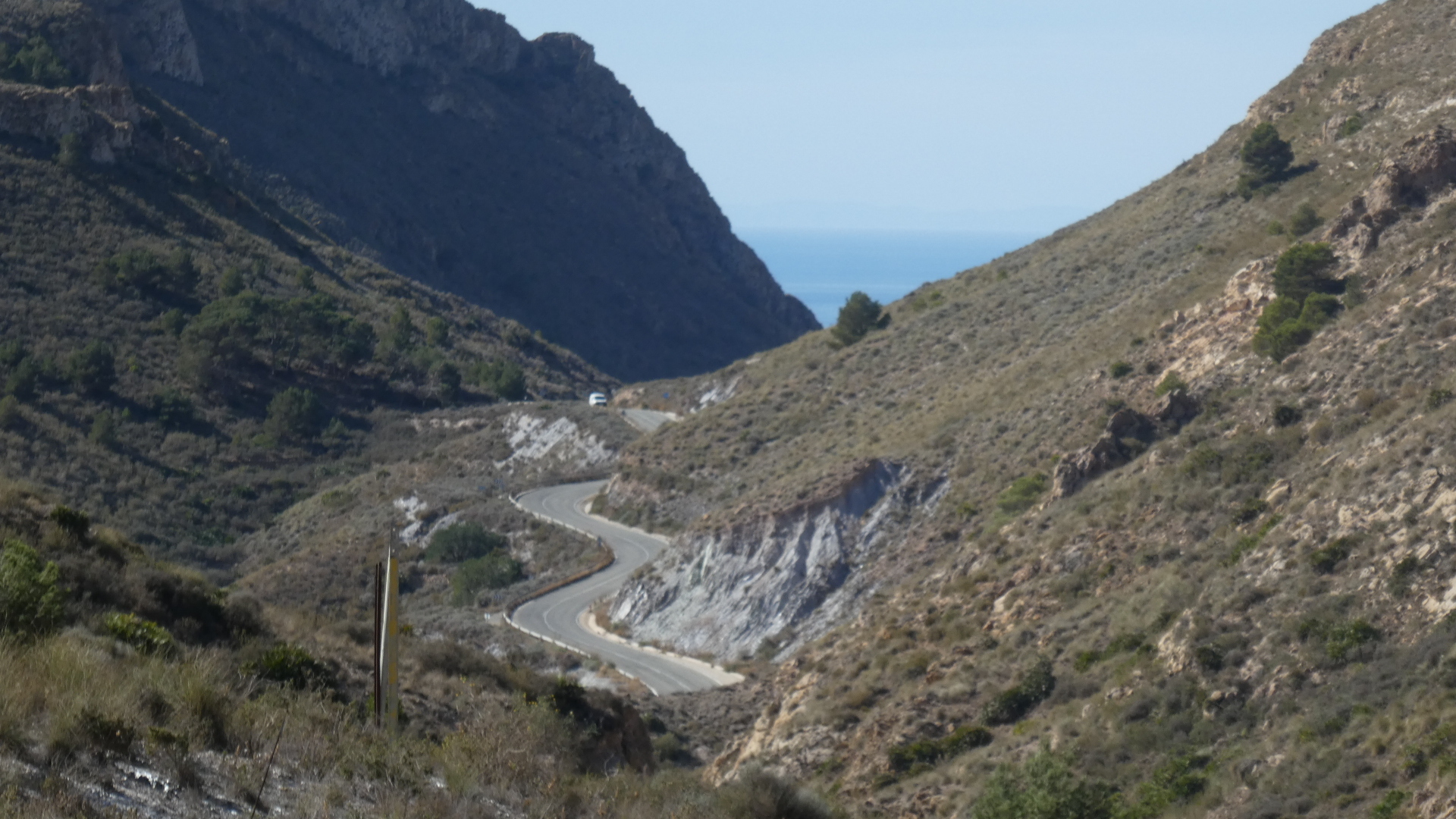 About half way down we came to a viewpoint. There, we answered some UQs from a couple from the UK. But it turned out the fellow had his own tale. The conversation starter was easy. He had been standing beside the back of his car, but he, or Mrs., opened the trunk and then we saw he could only walk with a walker. The tale was that two weeks ago he came off his bike, hitting sand in a roundabout, and sliding along his left side. There was an ambulance ride to Cartagena, and many x-rays. Apparently he is just severely bruised. For days, he could not sleep lying down, but is doing better now.