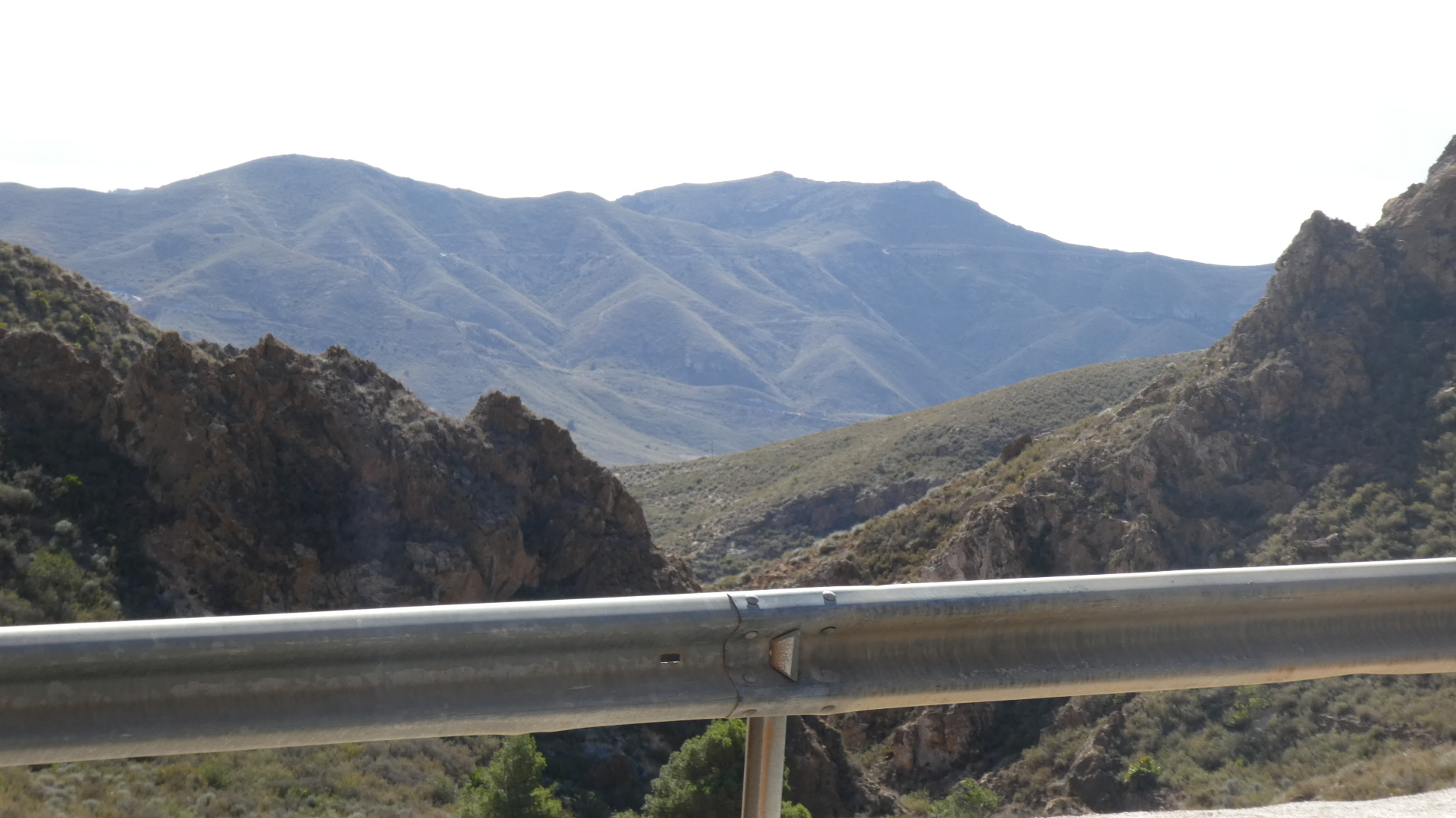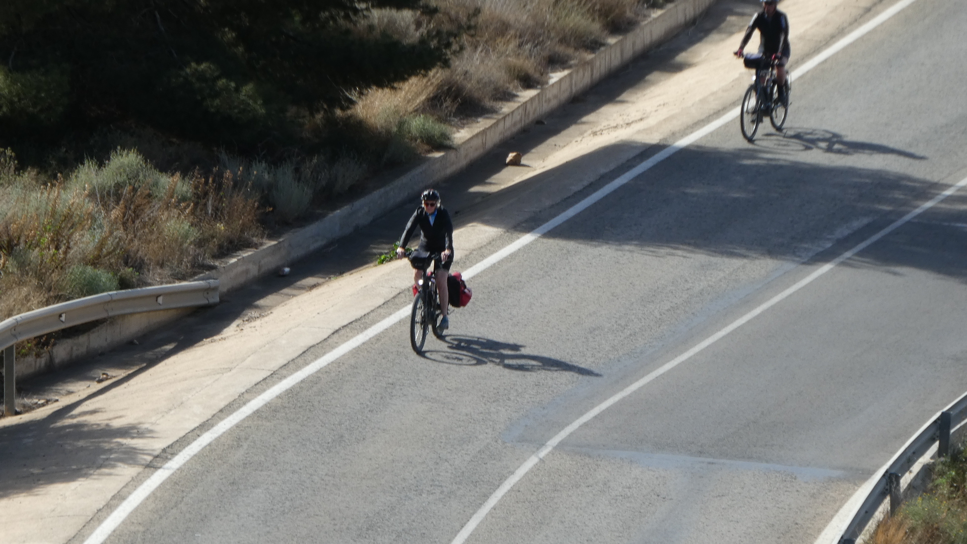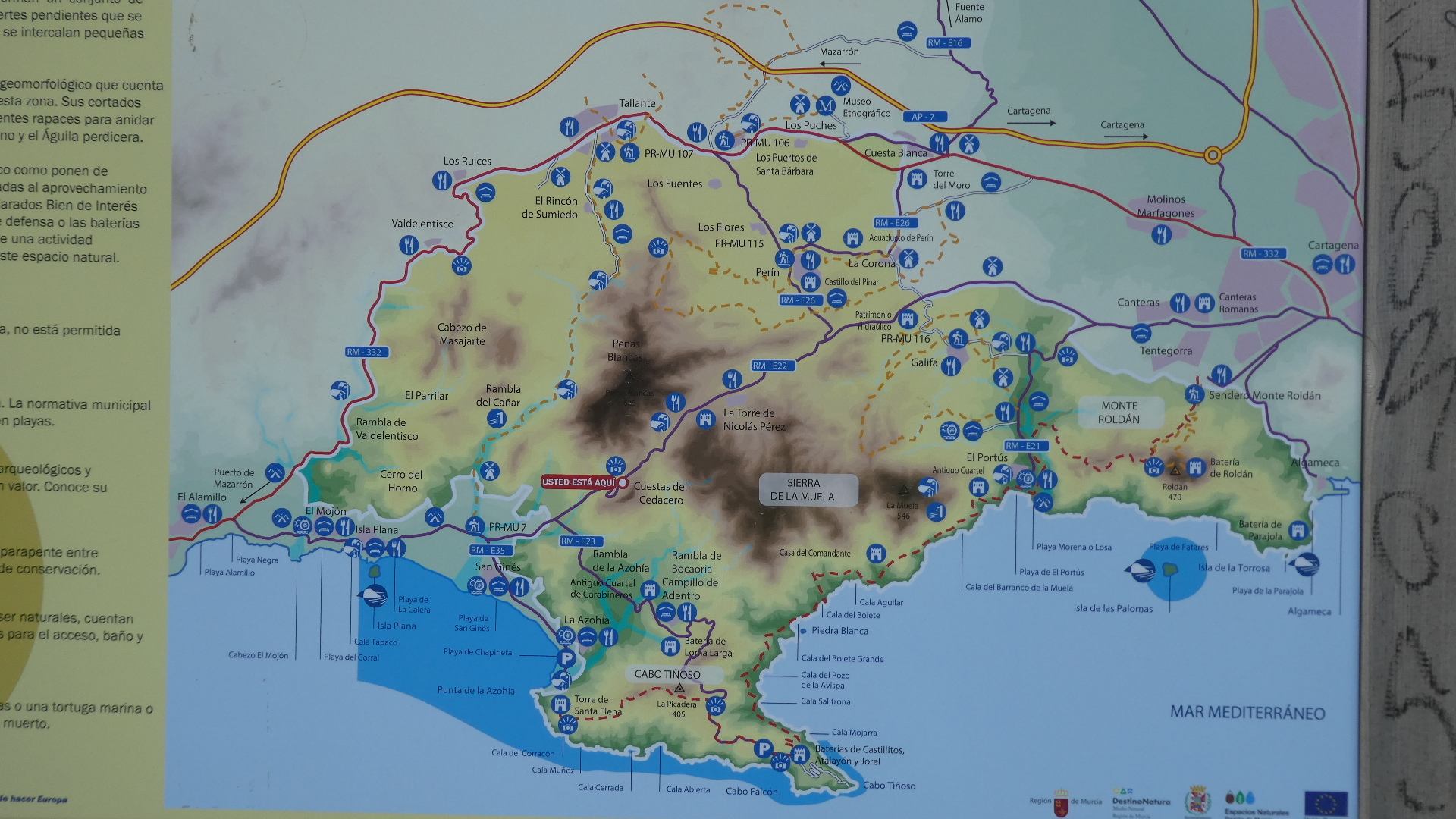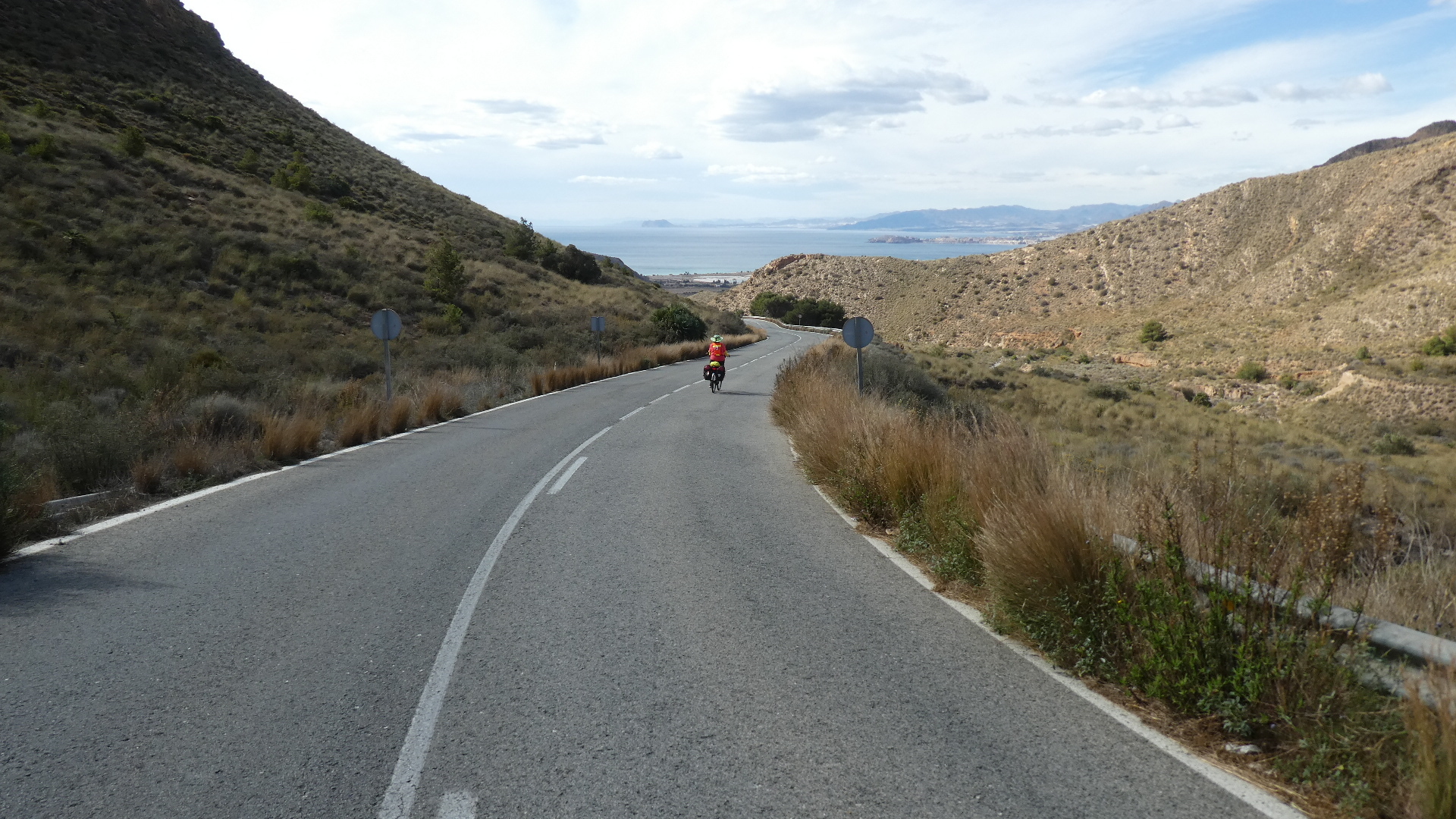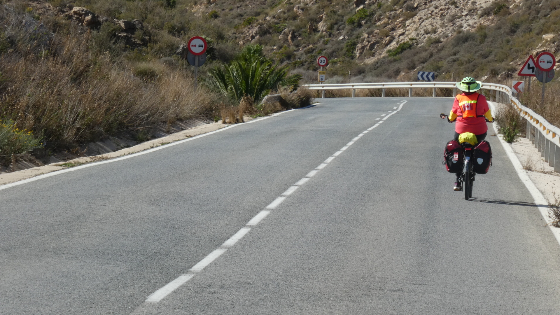 About half way down we came to a viewpoint. There, we answered some UQs from a couple from the UK. But it turned out the fellow had his own tale. The conversation starter was easy. He had been standing beside the back of his car, but he, or Mrs., opened the trunk and then we saw he could only walk with a walker. The tale was that two weeks ago he came off his bike, hitting sand in a roundabout, and sliding along his left side. There was an ambulance ride to Cartagena, and many x-rays. Apparently he is just severely bruised. For days, he could not sleep lying down, but is doing better now.