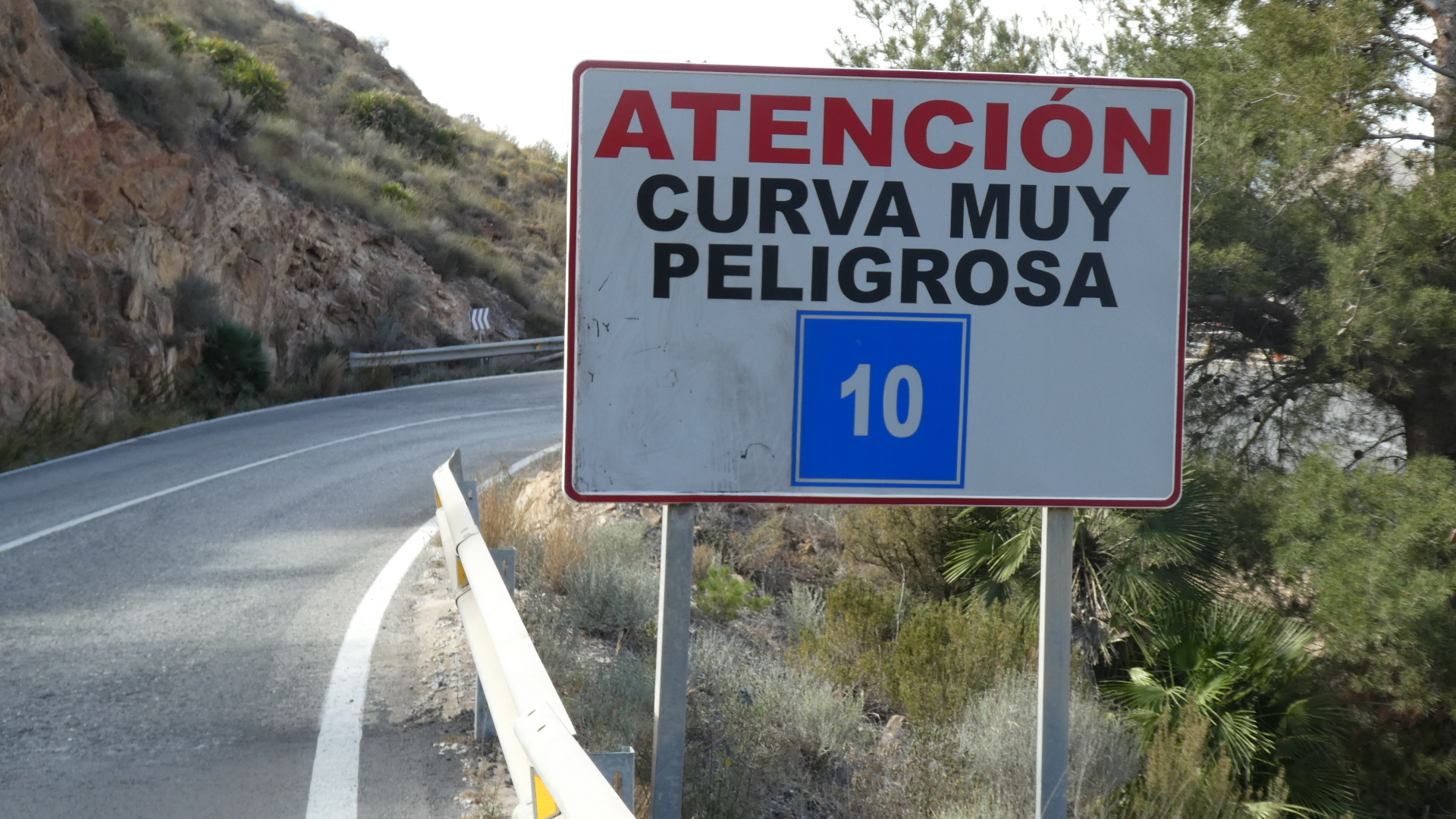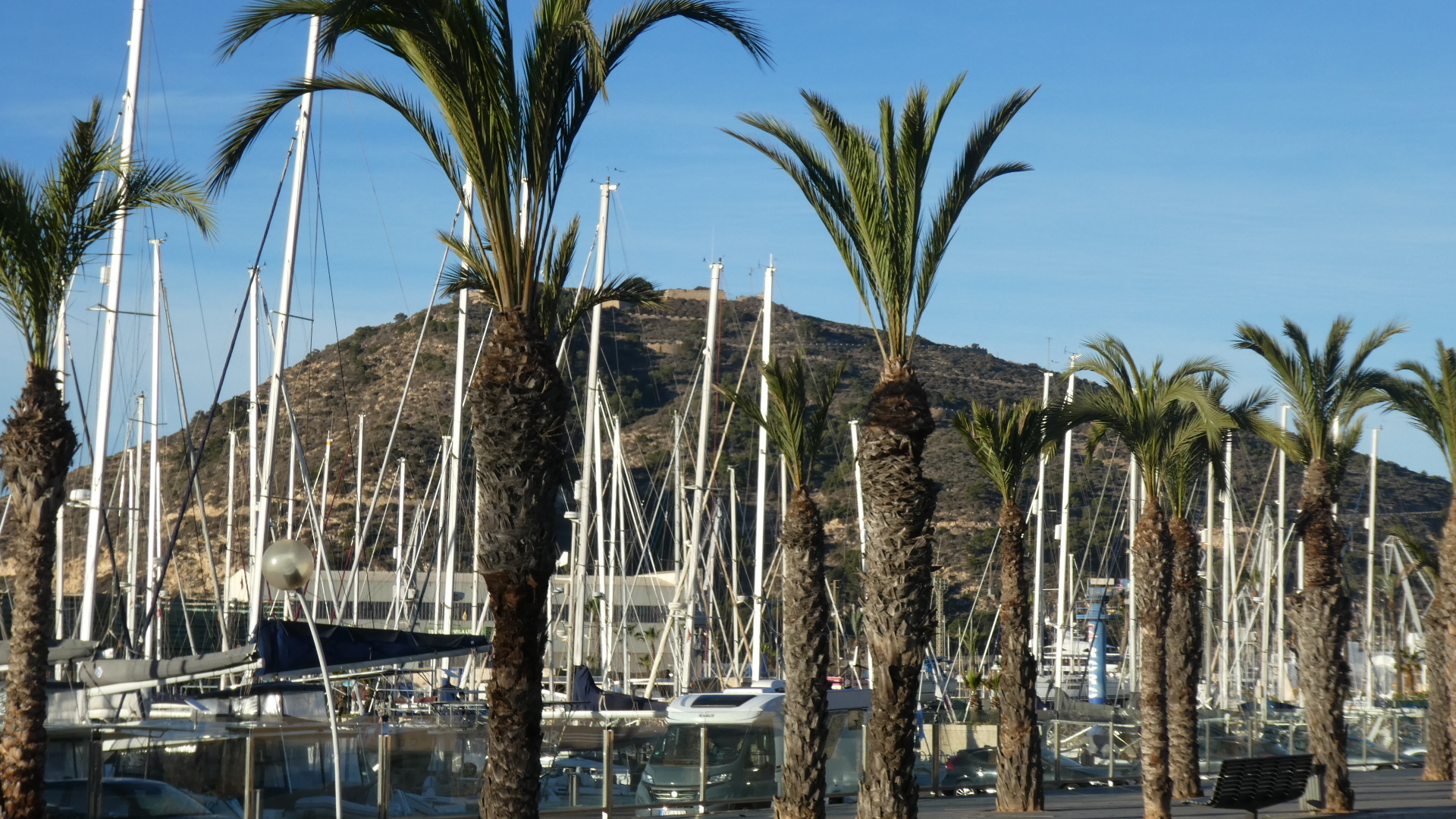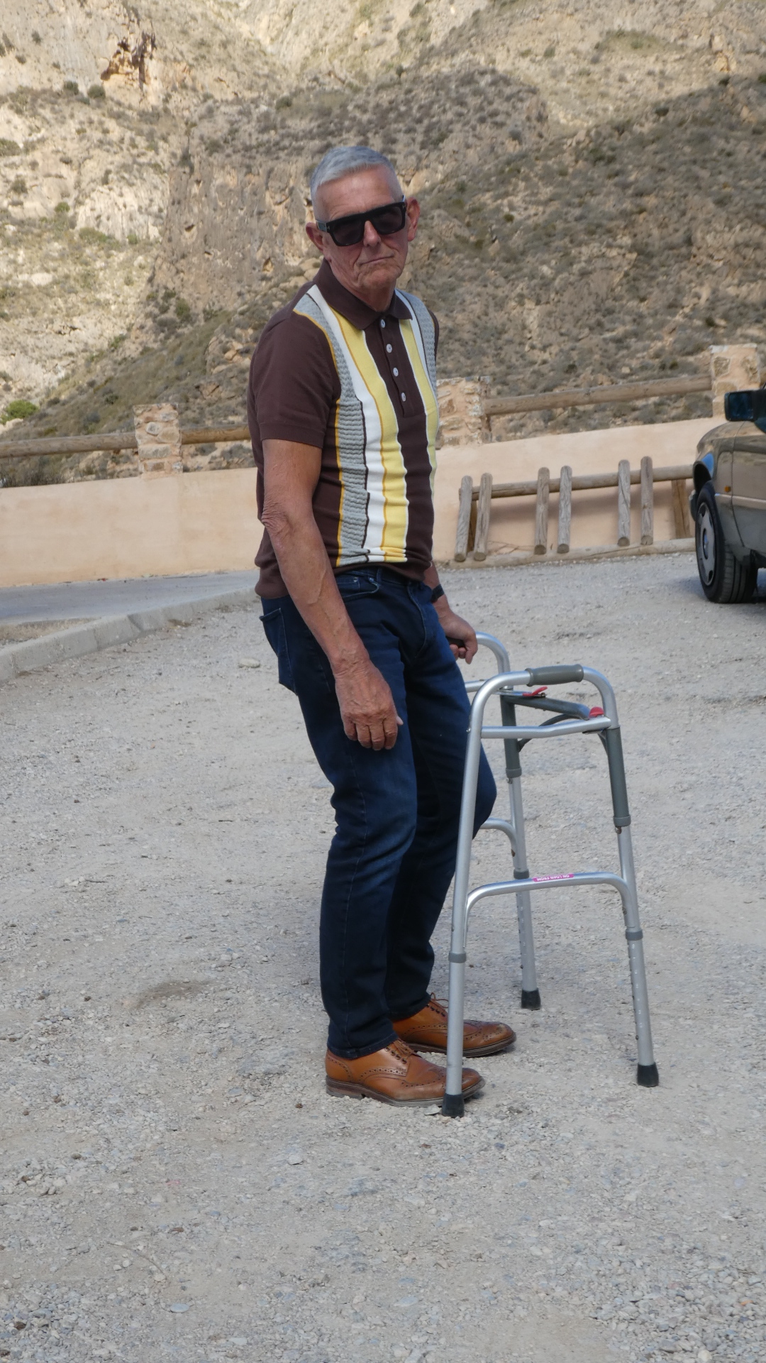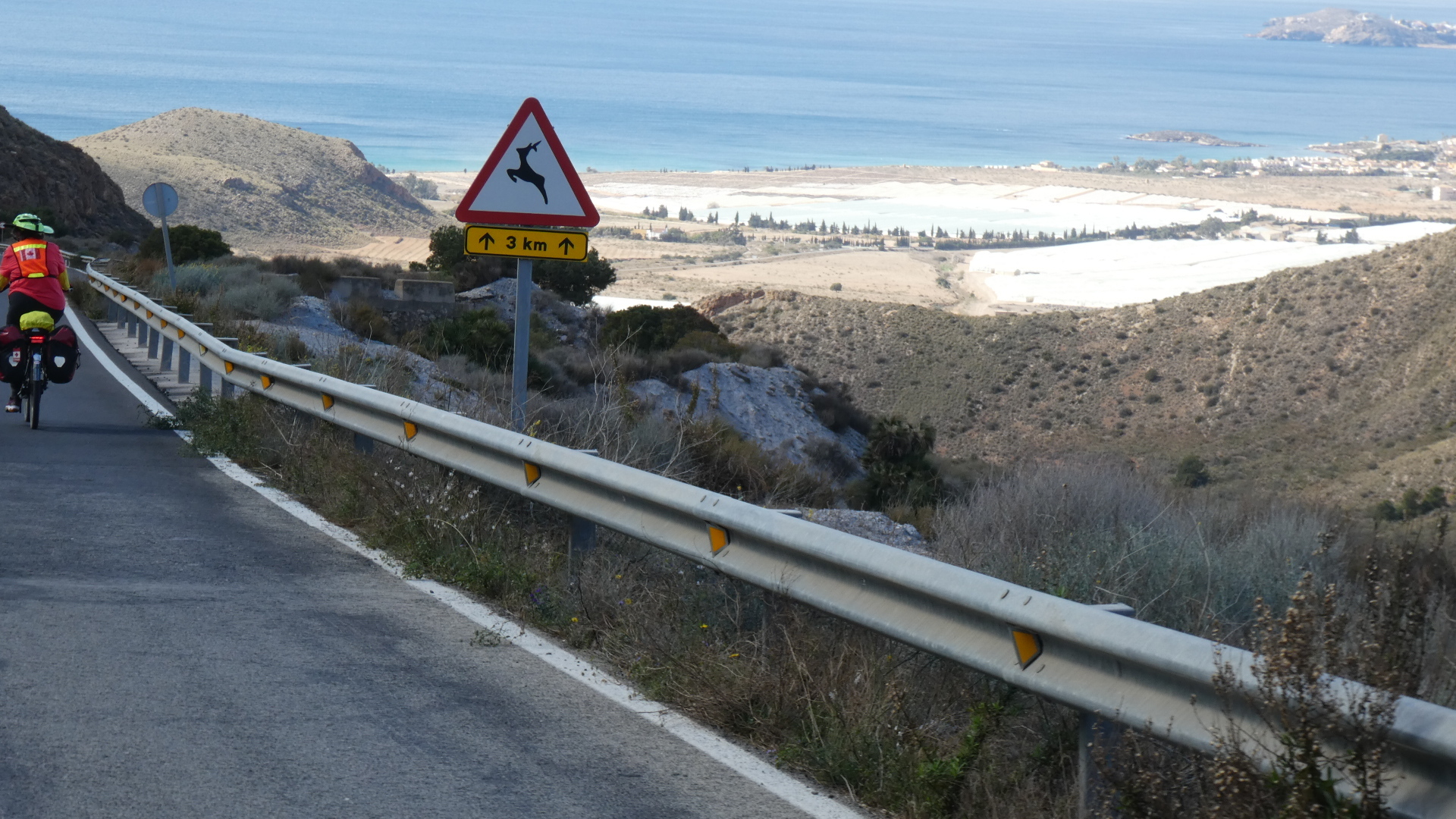 About half way down we came to a viewpoint. There, we answered some UQs from a couple from the UK. But it turned out the fellow had his own tale. The conversation starter was easy. He had been standing beside the back of his car, but he, or Mrs., opened the trunk and then we saw he could only walk with a walker. The tale was that two weeks ago he came off his bike, hitting sand in a roundabout, and sliding along his left side. There was an ambulance ride to Cartagena, and many x-rays. Apparently he is just severely bruised. For days, he could not sleep lying down, but is doing better now.