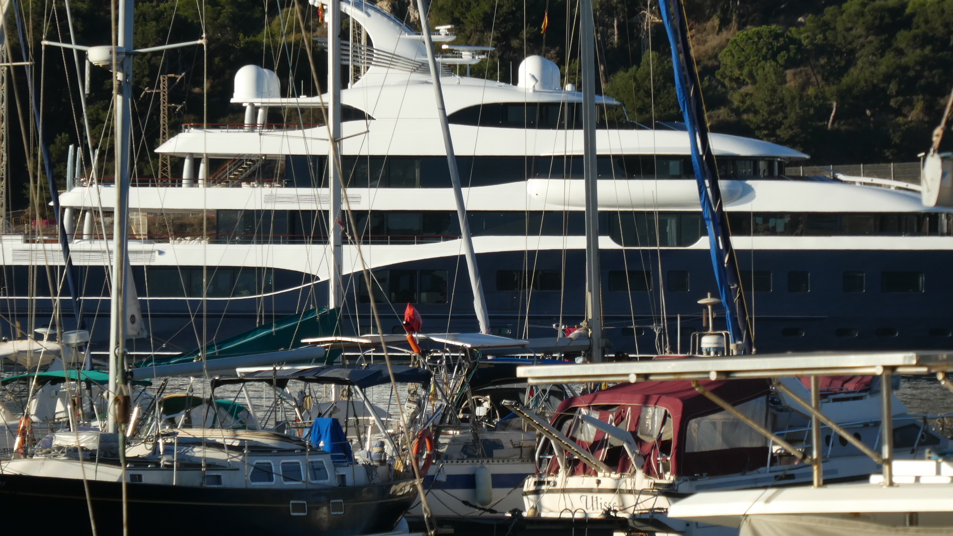 Instead we saw some picturesque boats and palms, a traditionally styled sailboat, and something of a luxury yacht in the distance.