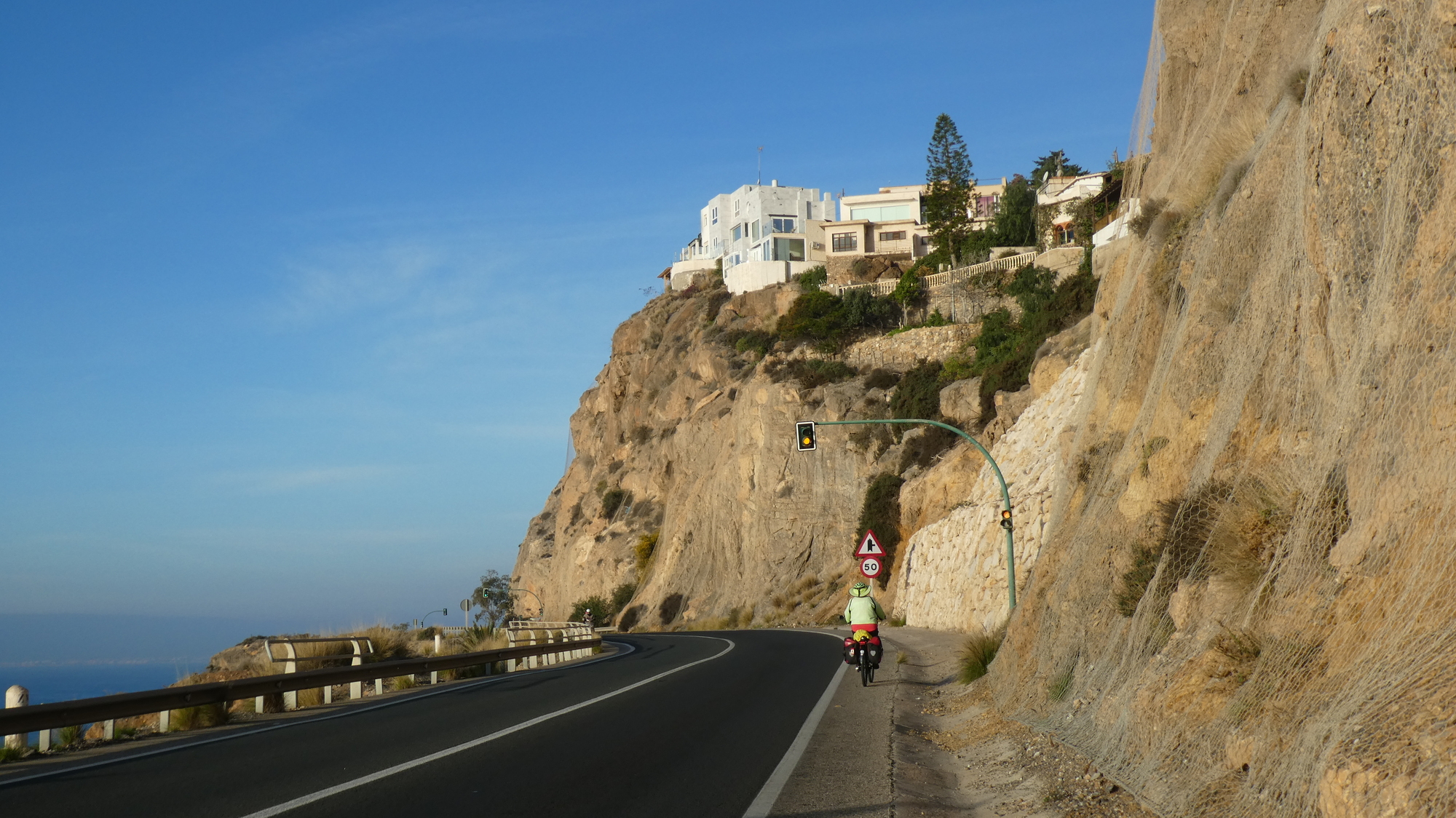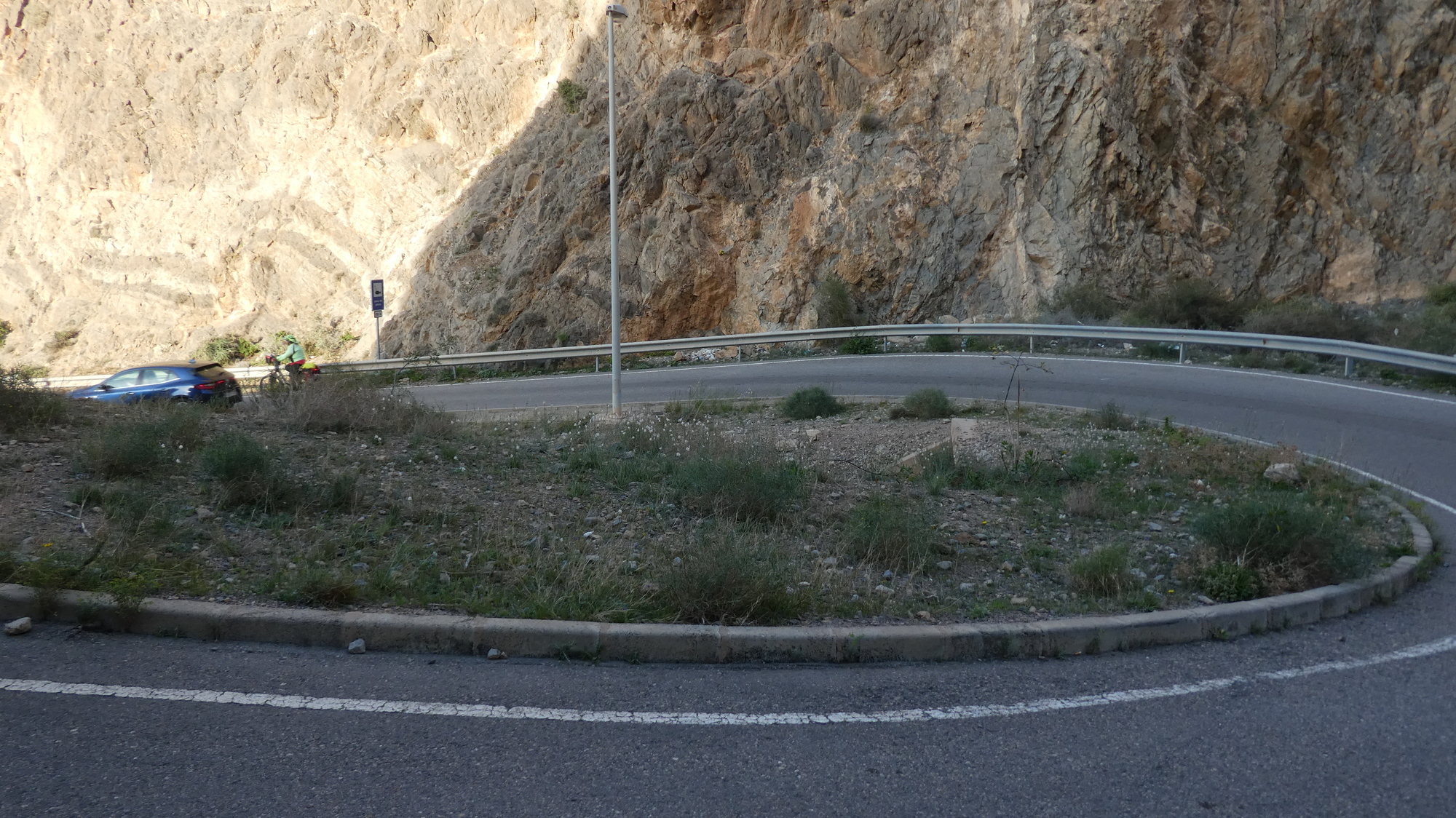 Our bike route out of town ended at the municipal boundary, but there we realized that that west end of town was a spectacular landscape of towering sandy cliffs and headlands. The roads went about dealing with this with a series of tunnels, switchbacks, and cliff hugging curves. We were glad to be going the direction that put us against the cliff and not hanging in space. There was a bit of a shoulder, but it still did take concentration to stay on target and not wander into traffic on one side, or the ditch or cliff on the other. In due course, we could also look down on the town of Aqua Dulce. Our route was through Aqua Dulce, so we had to spot the not so obvious turn, that then took us down from the cliffs to the town.