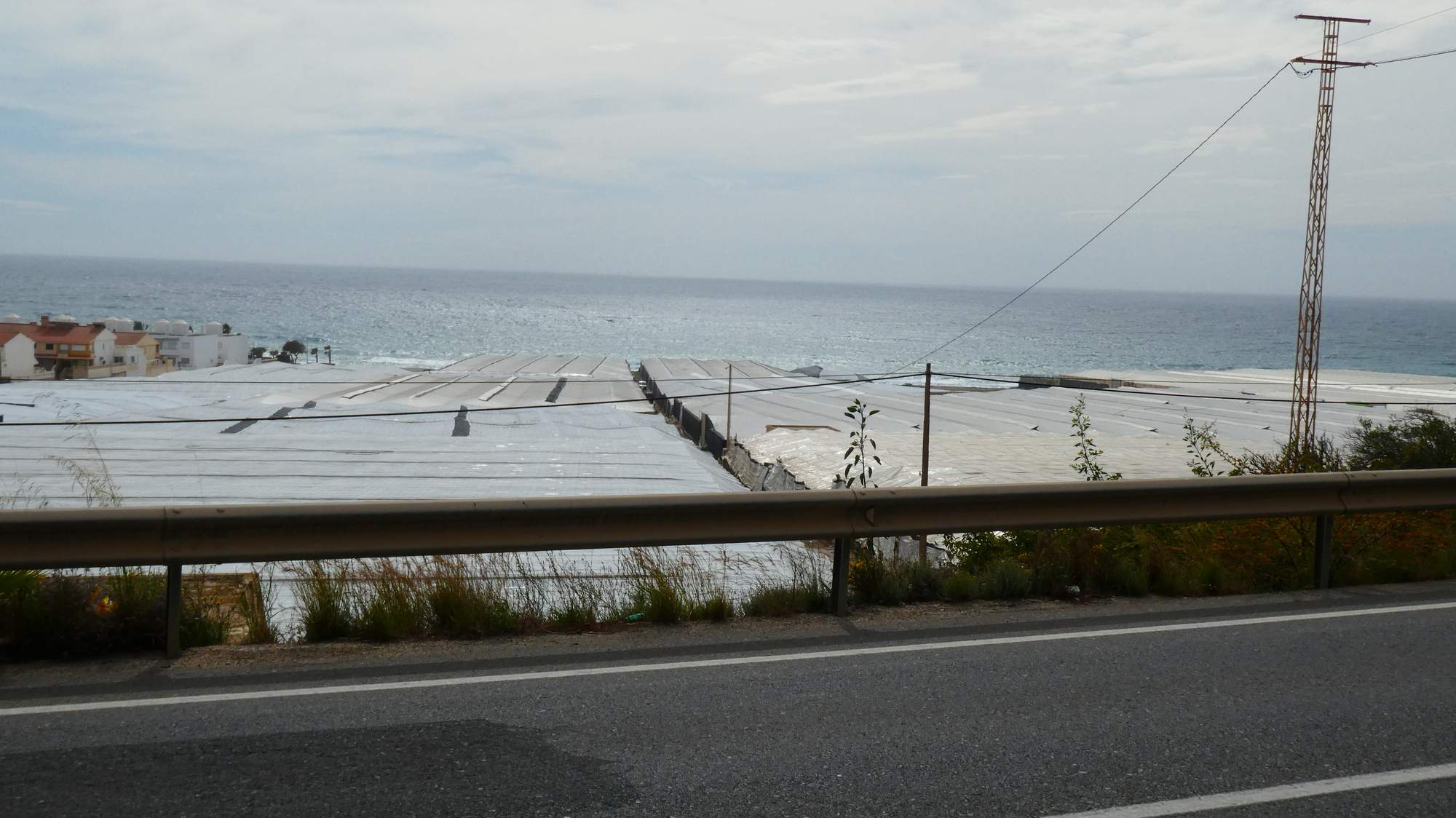 With greenhouses from mountains (north) to the sea (south), we thought we would pass beyond them as we headed west. But no, were among them all the way to Adra, our stop for the night. Something else going on was a super strong headwind, and randomly angled gusts (up to 54 kph, according to the weather network), that buffeted us and made riding unpleasant.