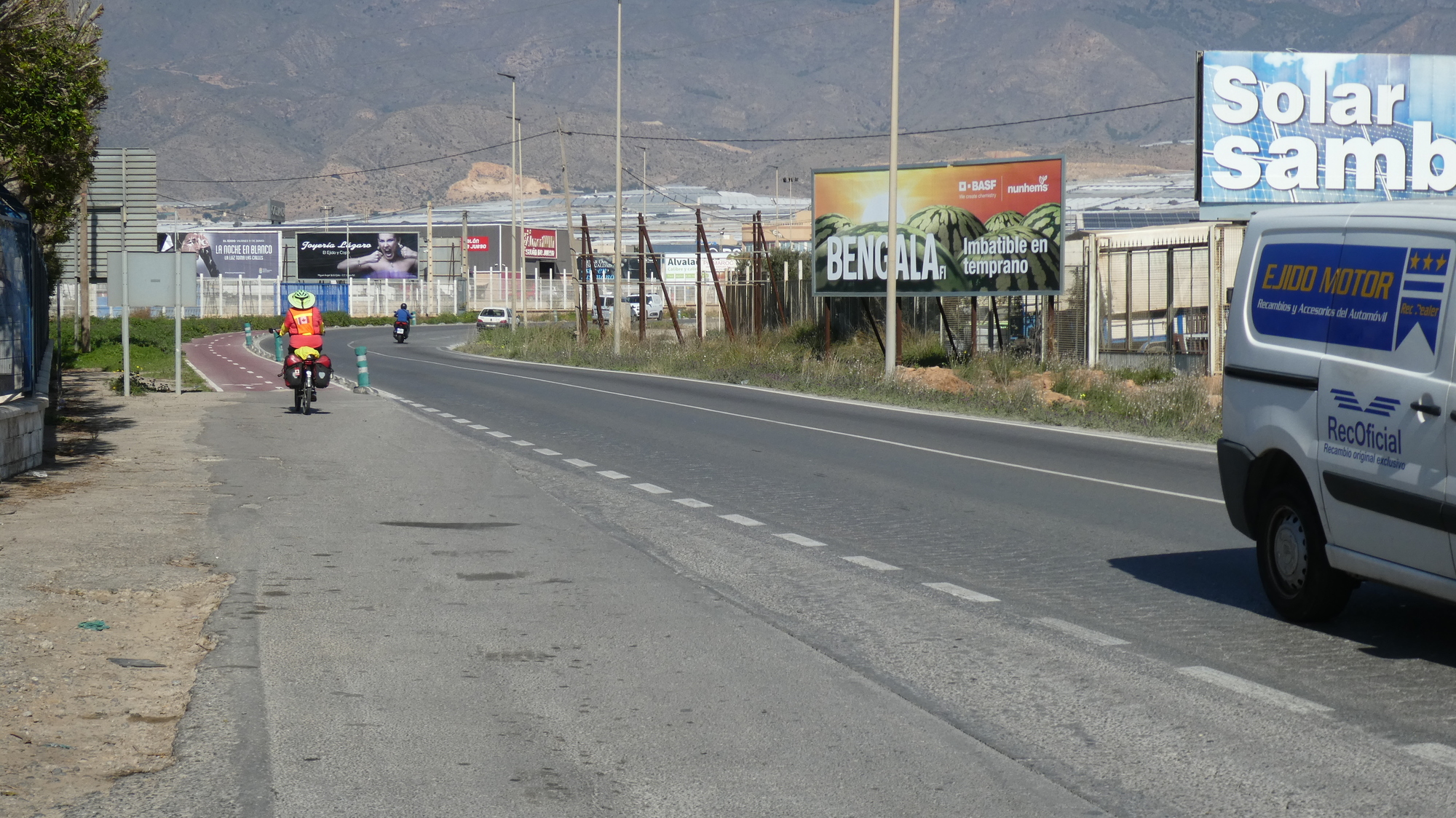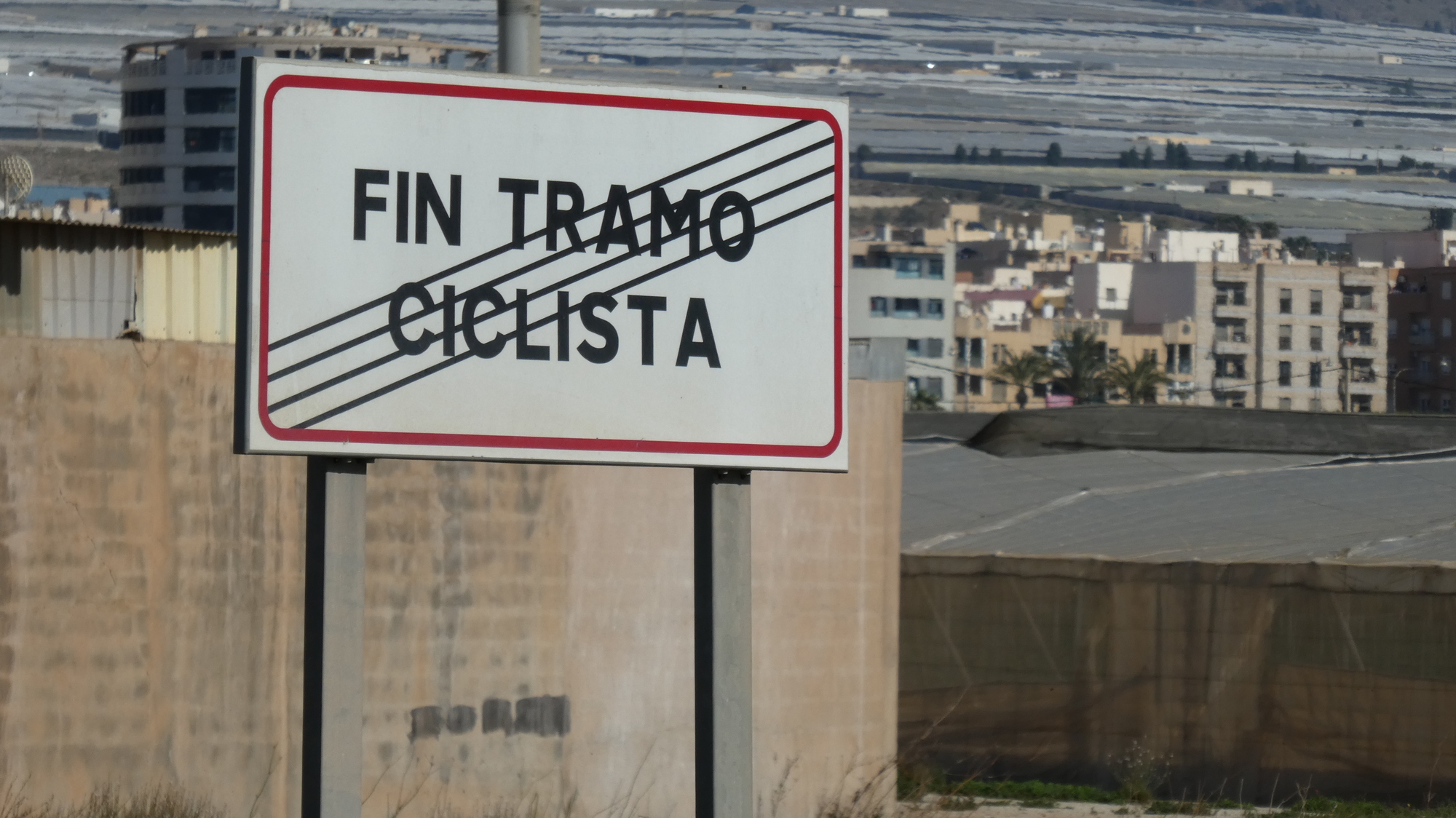 There was a temporary break in the greenhouses as we came to El Ejido, an area of very heavy traffic. There were some bike lanes to help, but also not. When we came to the sign below I asked Dodie if she knew what it meant. She did, and replied "It means we're screwed" (Actually - "end of bike lane").