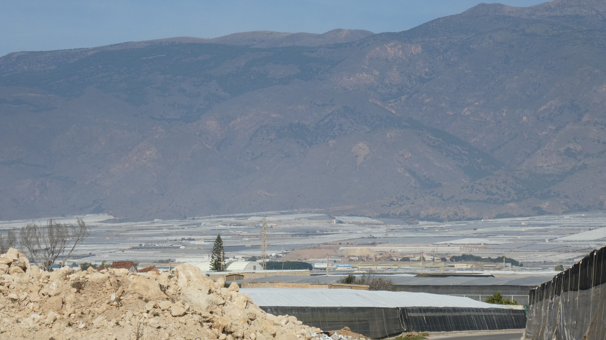 Here on the beach beyond Aguadulce, we can end the tale of the beauty of Almeria, and its cliffs, ad begin to describe the amazing phenomenon of dusty greenhouses, covering almost all the land surface from the distant mountains, to the sea. These are the same style of greenhouse that we have been passing for some days - totally sealed up and enclosed, so that you can only barely see at times their contents. Surprisingly, their contents are very good looking tomatoes, peppers, and eggplant. However, with such a concentrated form of agriculture, the plants must be living on liquid fertiliser, and you have to wonder about their nutritional content.