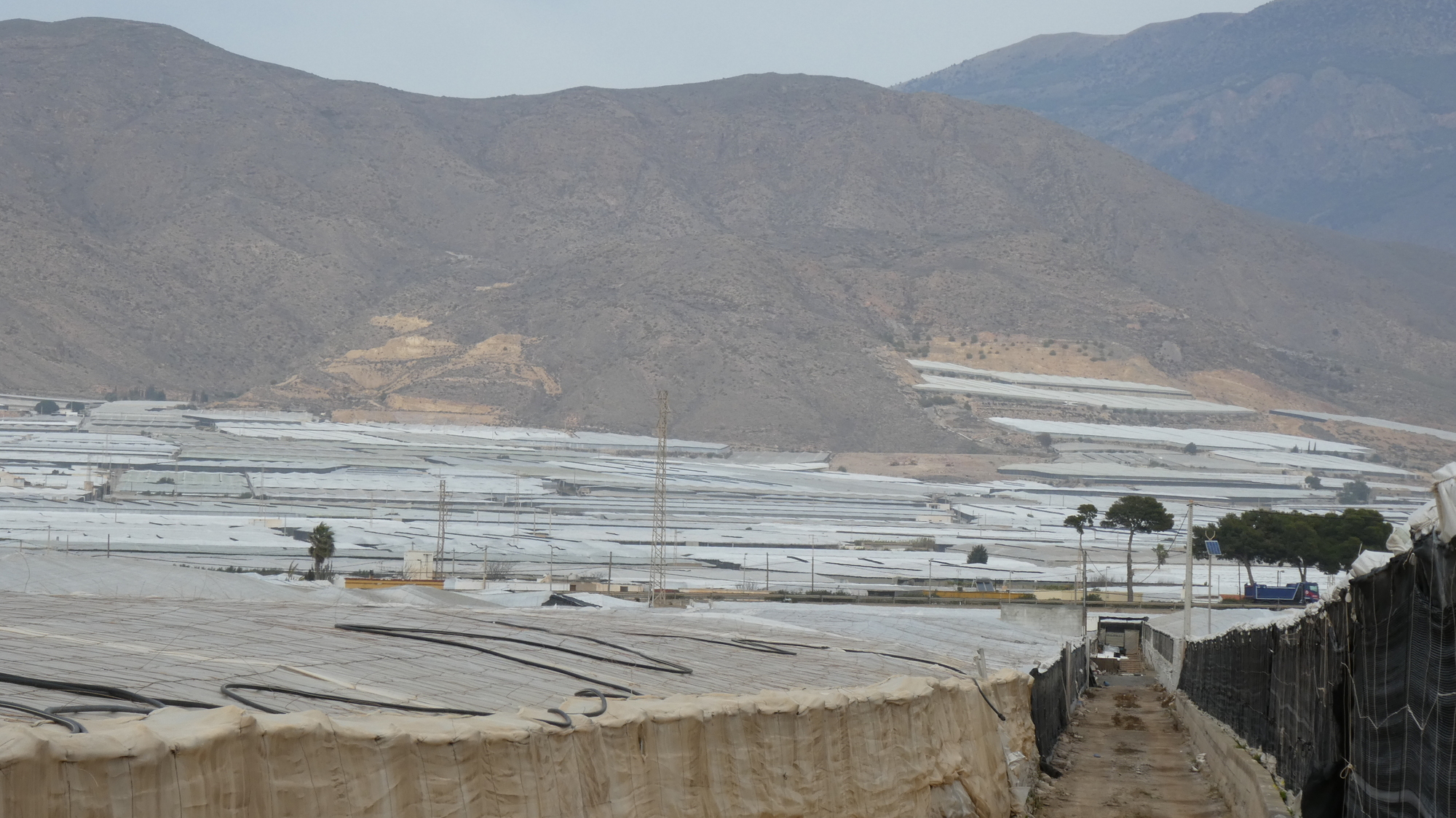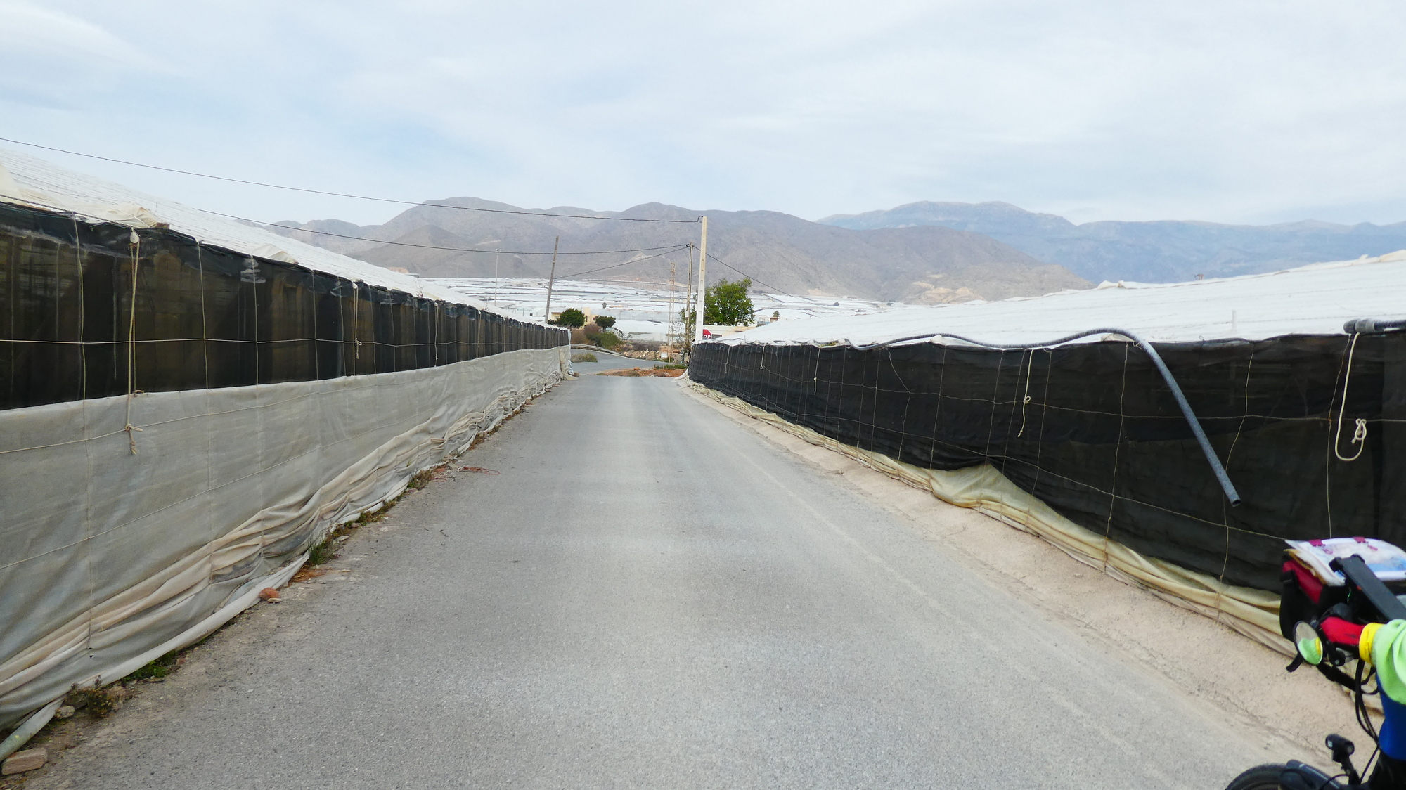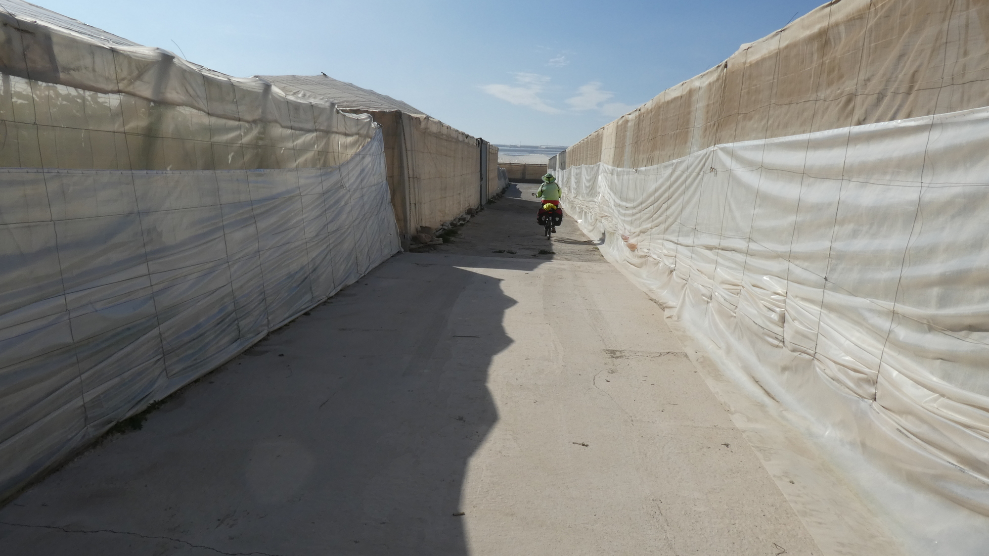 Through the photos below, we follow through about 30 km of wall to wall greenhouse. For a lot of the time, only the GPS had any idea of where we were in the maze of them. Had we gotten lost, we would have had to subsist on tomatoes!