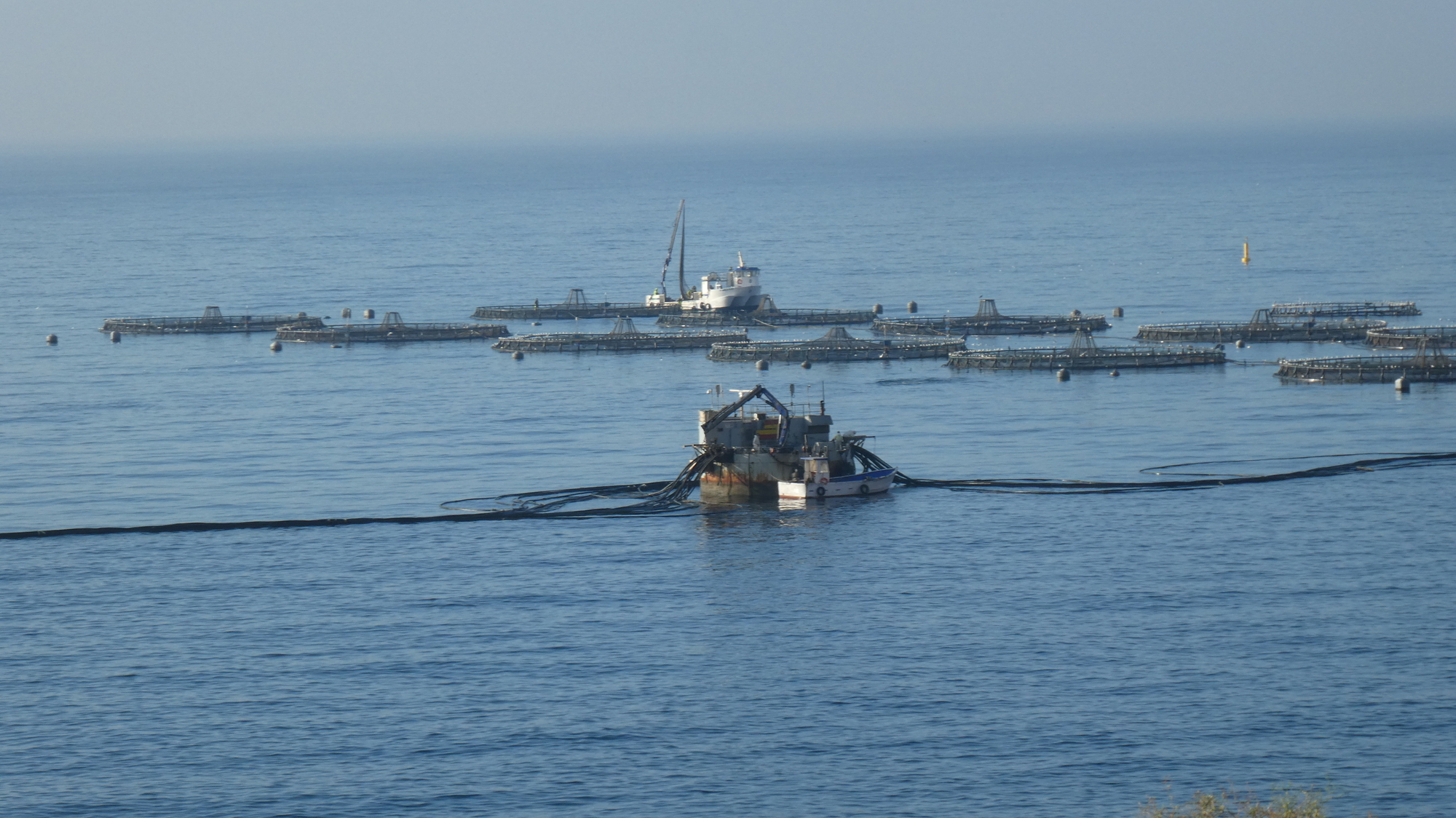 From our height we could look down to the sea, and to wonder about these structures. They must be fish farms.