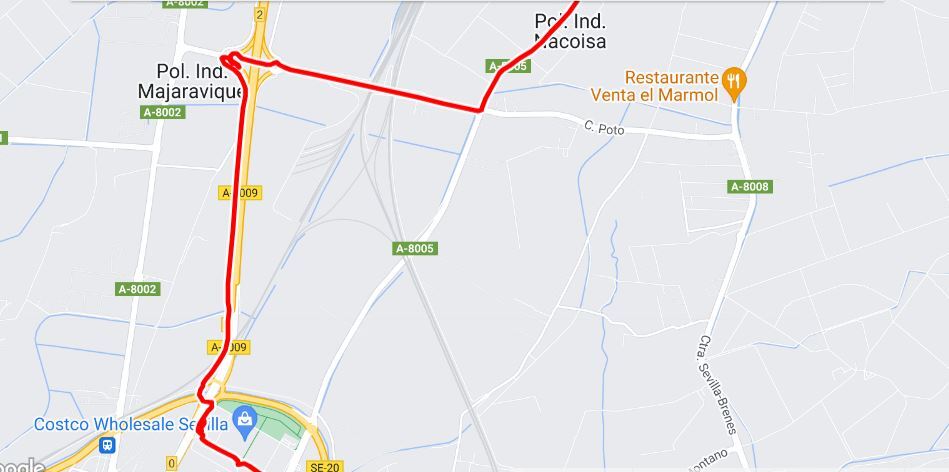 Our road out of Los Rosales, A-8005, got busier the closer we got to Sevilla. It became really a bug - noisy, dangerous. Things got more complicated when we came to what in France we would have treated as a routine "route barrée", which we normally would just blow right through. But something about the situation - being pummeled by the traffic, or not speaking the language, caused us to obey the signs. We don't know if the road would really have been impassable, but as you can see from the map below, the detour just routed us straight into trouble, by trying to put us on the Autovia.