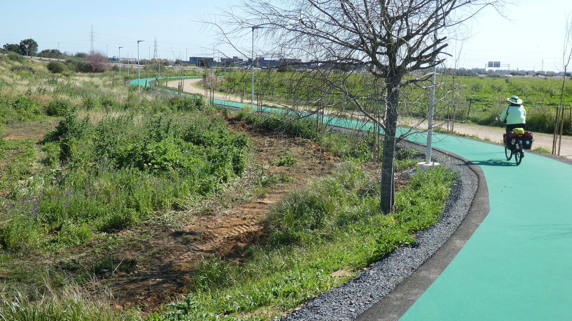 When we got to the big road, we thought we were really screwed, until we spied a bike way, down a hill and over some barriers, so we could not reach it. We then walked our bikes backwards on the Autovia access ramp, until we could get to the bike way. Imagine our dismay to find the bike way also barree!