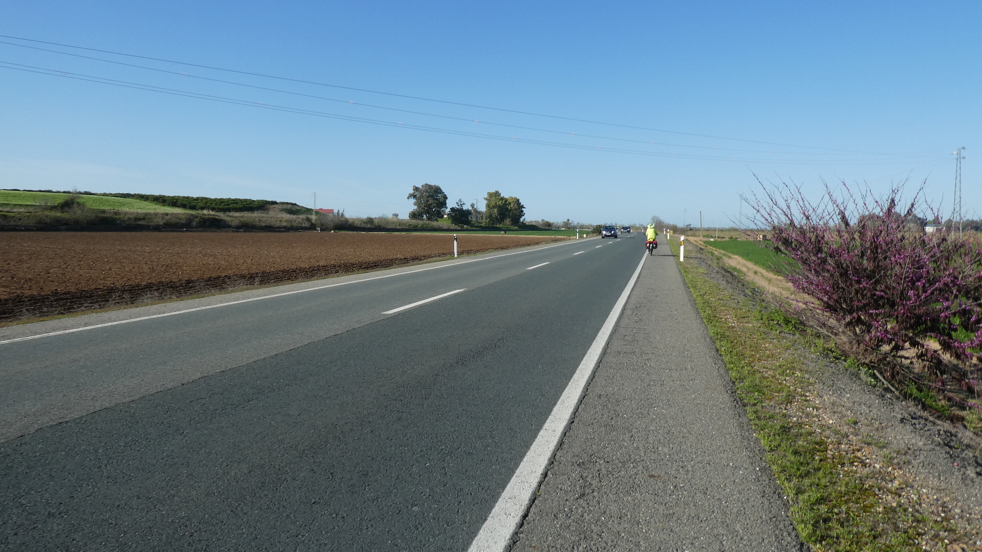 Meanwhile, either my flat repair had mostly failed or I had a new micro leak, because my tire grew soft after 30 km, and then needed pumping every 5 or 10 km thereafter. The complicating part is that Dodie's tire now got in the act, and also required pumping every 5 or 10 km. As long as pumping sort of worked, we were not about to launch any real repairs, preferring to hope for light, warmth, and water when we would reach our hotel on Sevilla.