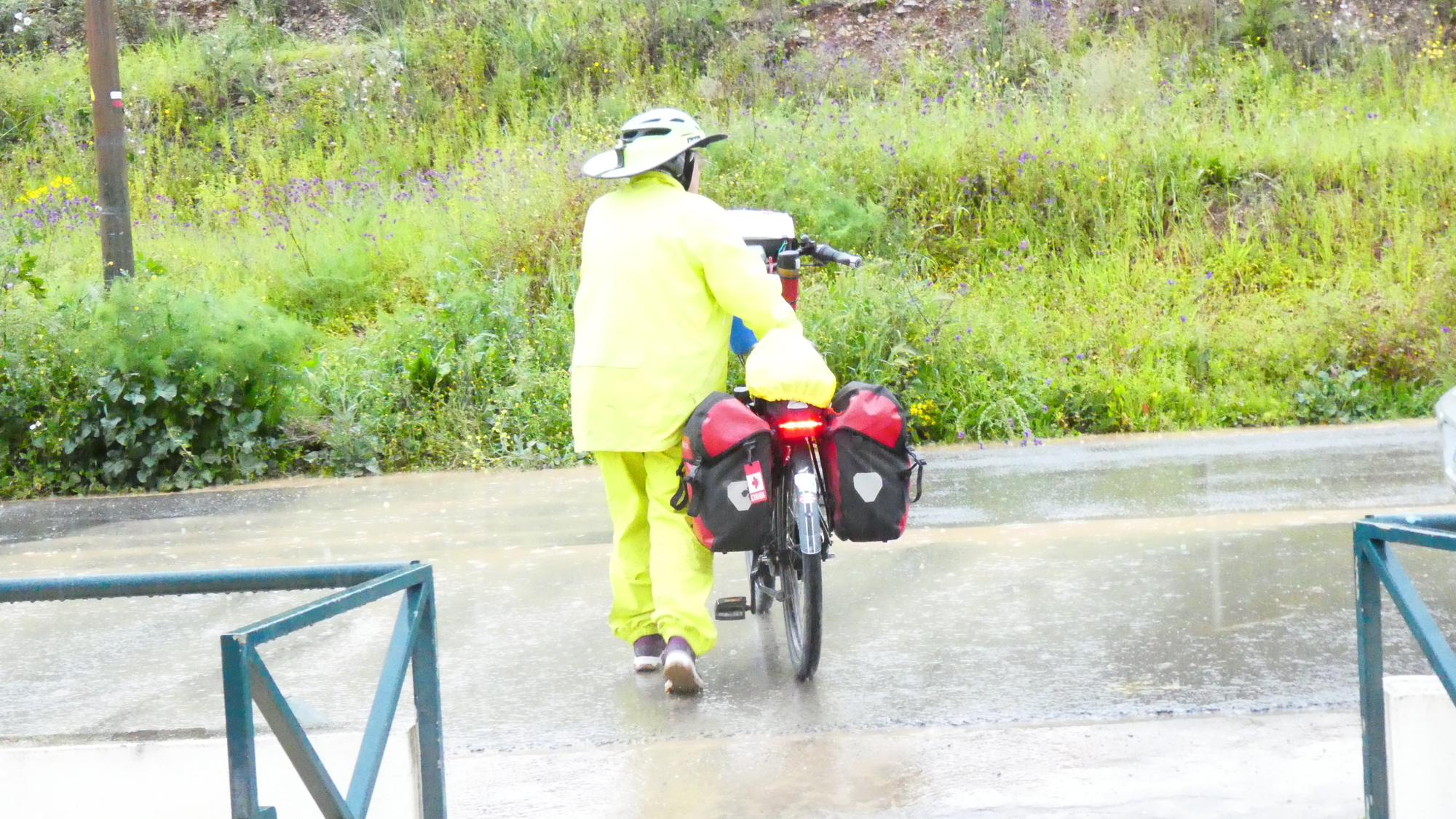 Bolstered as much as possible by our "buffet breakfast", if that what it was, we completed loading the bikes in reception. Only thing, it was pouring rain, and the forecast was for it to continue for three hours. Since we are who we are, we would not have waited even a half hour. Rather we suited up with our full rain gear, and blasted off into the deluge.