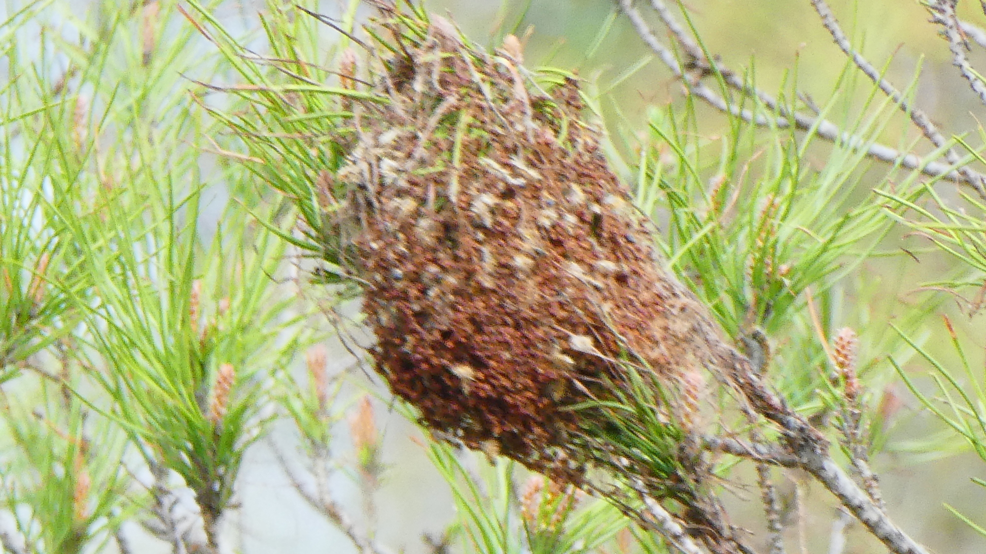 Although cycling by at high speed, as we do!, I was noticing something in the pines that seemed strange. At first I thought it was giant pine cones, but no. Birds' nests? wasp colonies? wood galls? hard to say, especially if you are too lazy to stop and look. Finally all I did was to snap one of them while passing. So with similar lethargy, I now toss this image out, to see if anyone knows what it is!