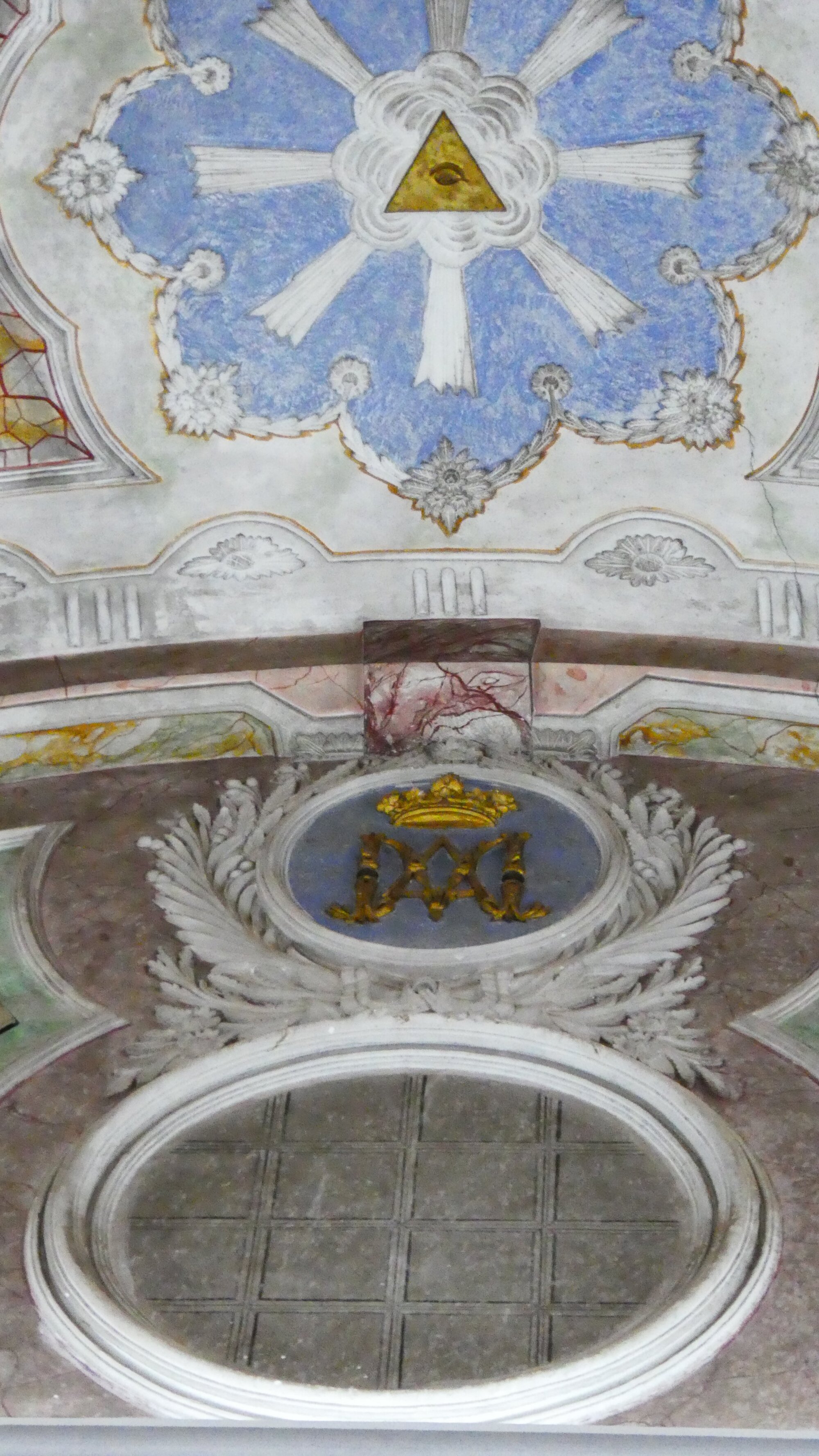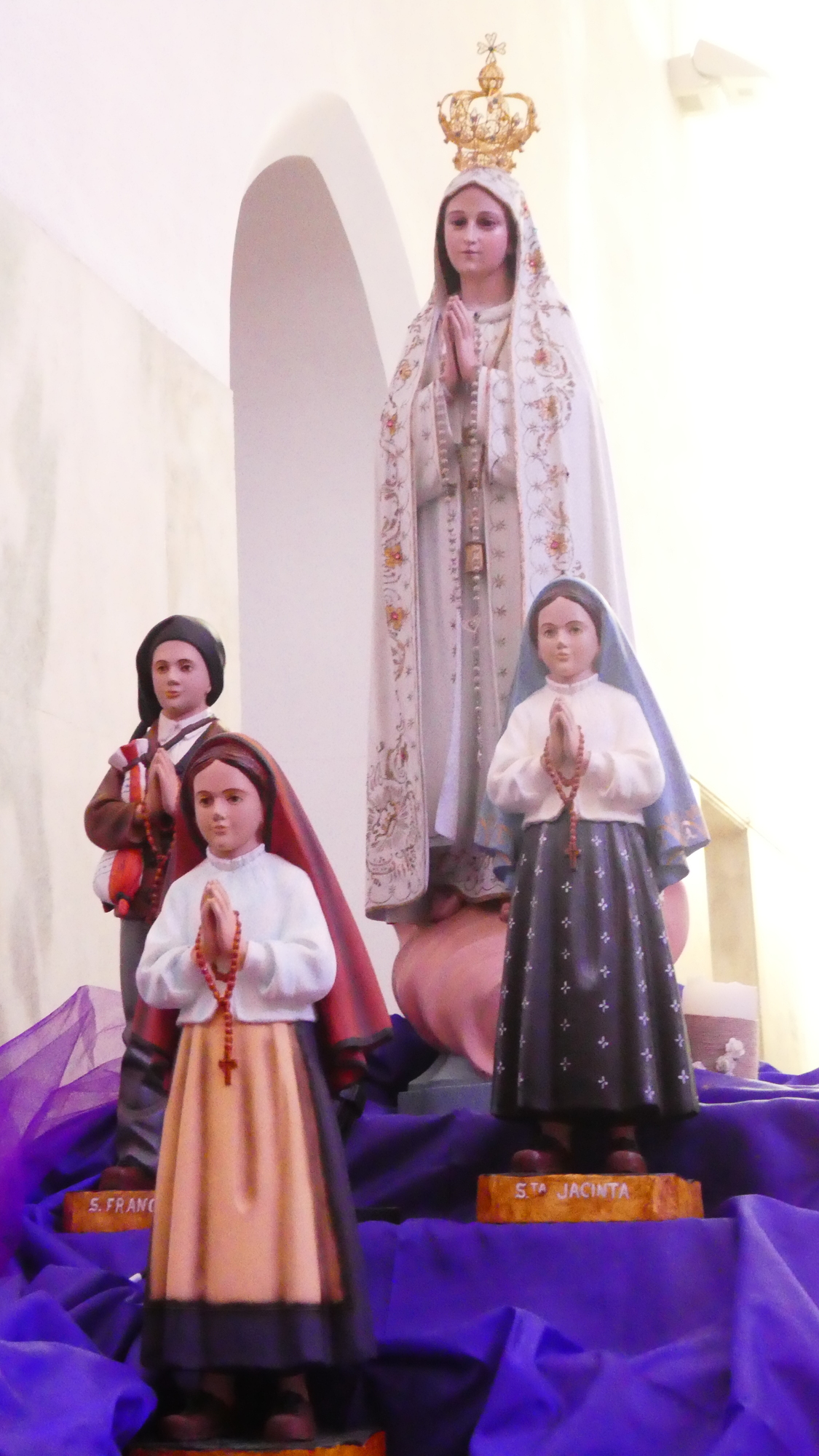 FLASH: Dodie has figured this out! The three figures are the three children from Fatima, two girls and a boy (Jacinta, Lucia, and Francisco), that saw the Virgin on multiple occasions in 1917. The appearances were on the 13th of each month for six months. At each appearance, the Virgin gave tips for world peace, and prophesies. The final one featured the Miracle of the Sun, where the sun jumped around and even flew closer to the earth. Fatima is on our route! We'll give more coverage of all this from there.