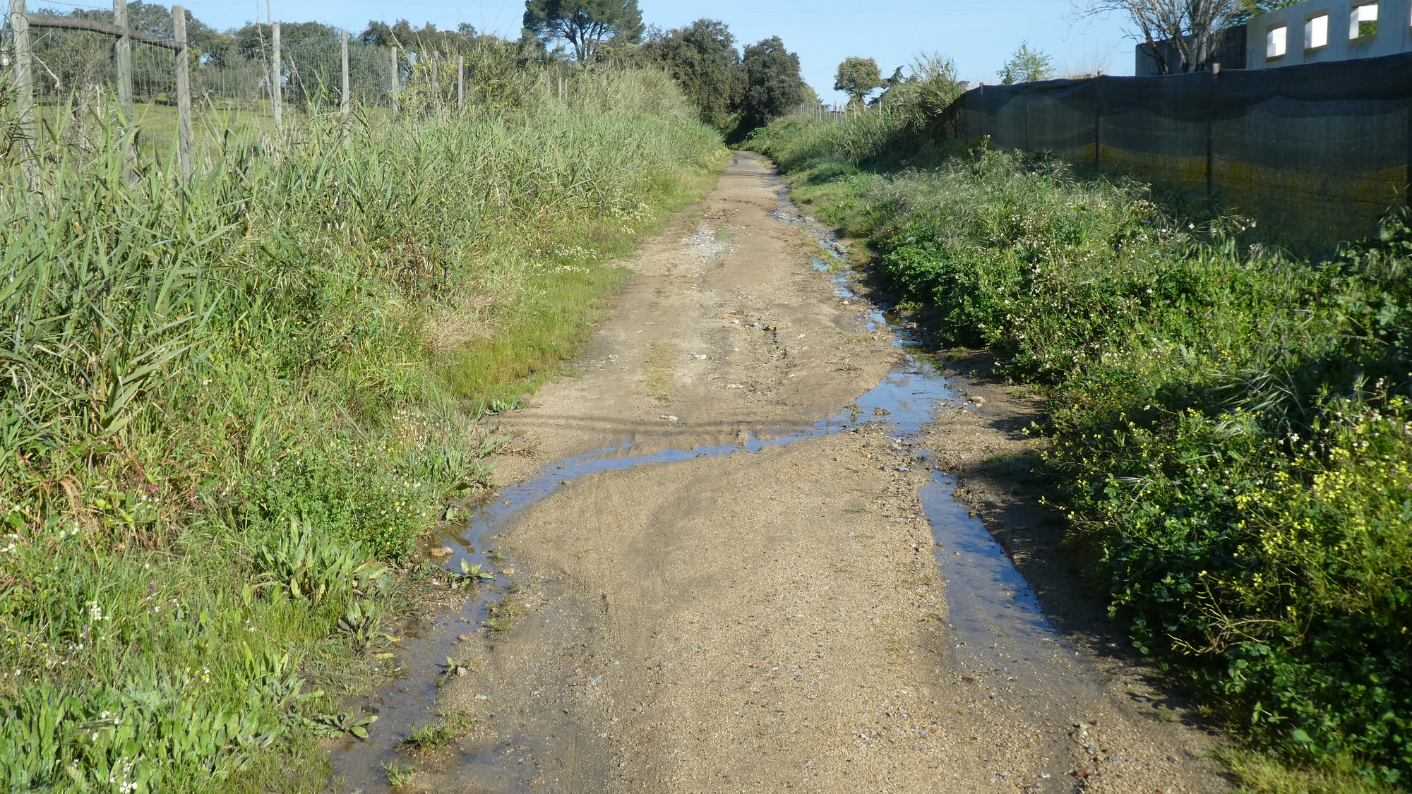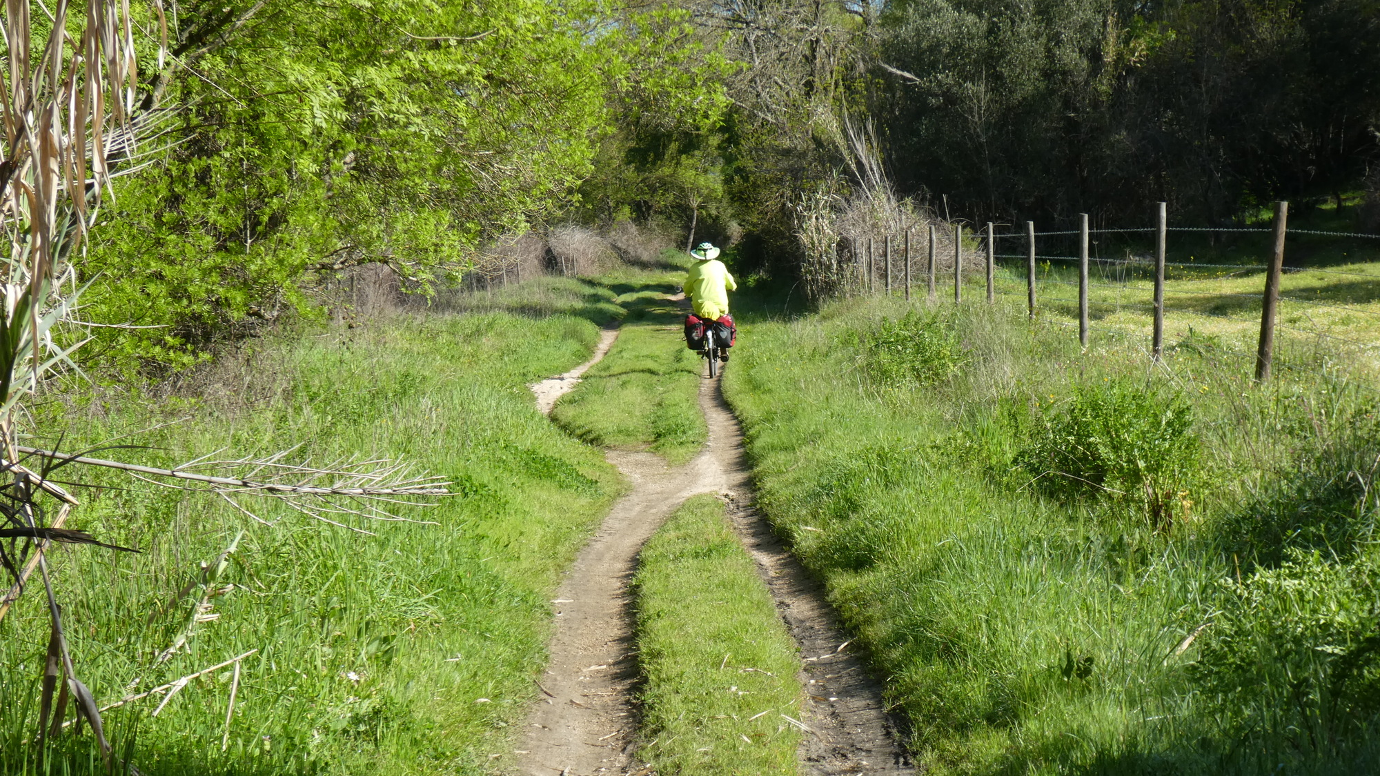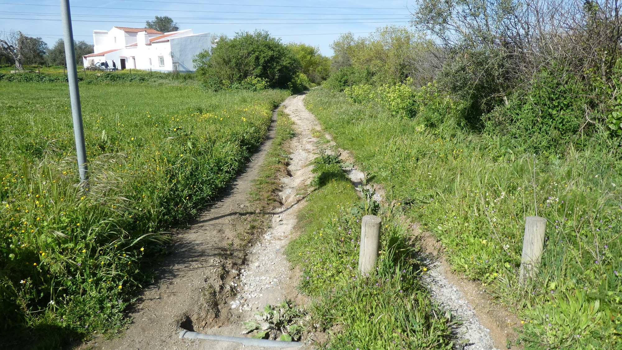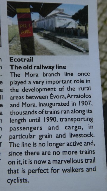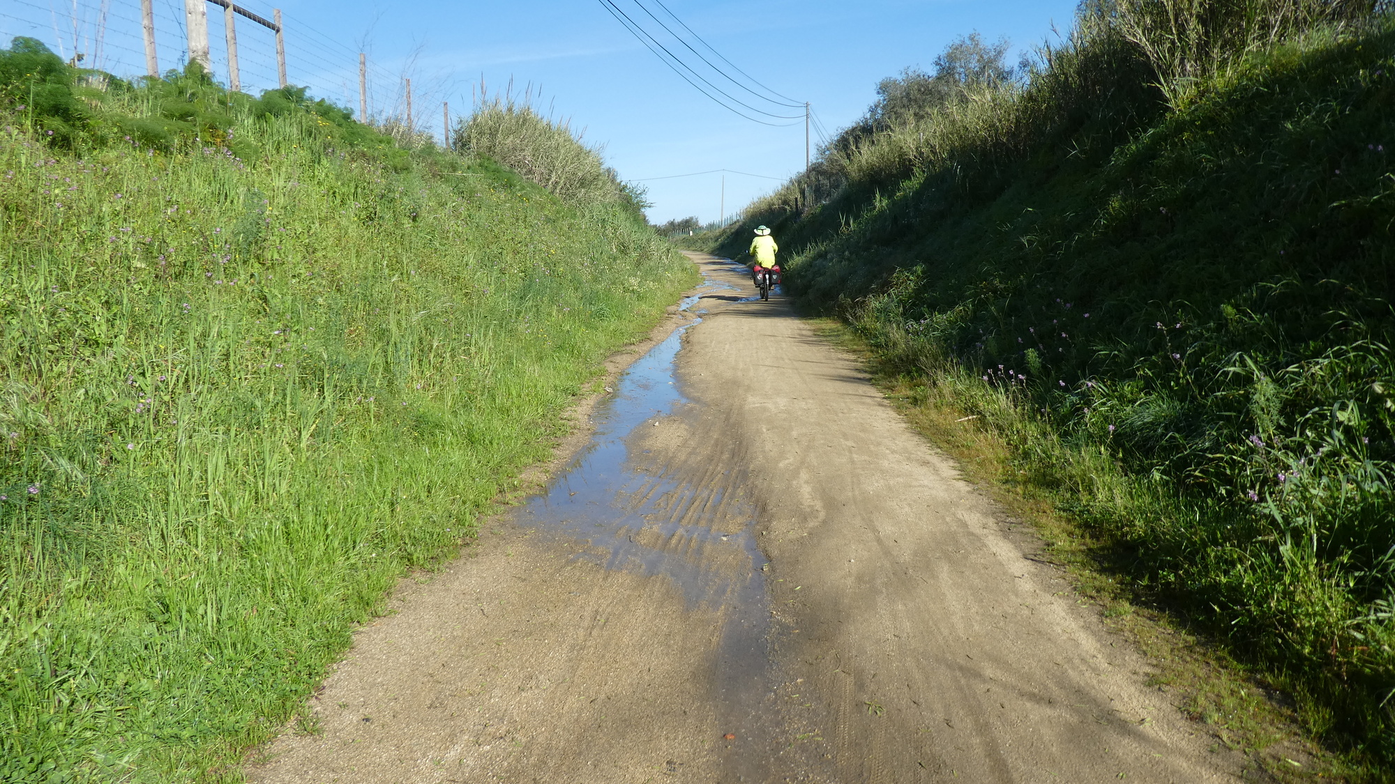 Given the traffic around, our decision to start off on a rail trail looked good. The "EcoPista" runs from Evora up to at least Arraiolos, so it should have been good. It turned out to be great, but only as a well crafted Grampie trap. As with such traps, the beginning is well paved and a real joy. Then we degrade the surface, move to single track, throw on some sand, and bingo! they're trapped. This time there was a special zinger. The single track passed under a highway with a tunnel that was filled with water. I took the risk of falling entirely into the water, by riding, while Dodie just accepted soaked feet. As usual with such traps, we made for the first paved road as soon as possible. For a time that road actually paralleled the track, before we left the track well behind.
