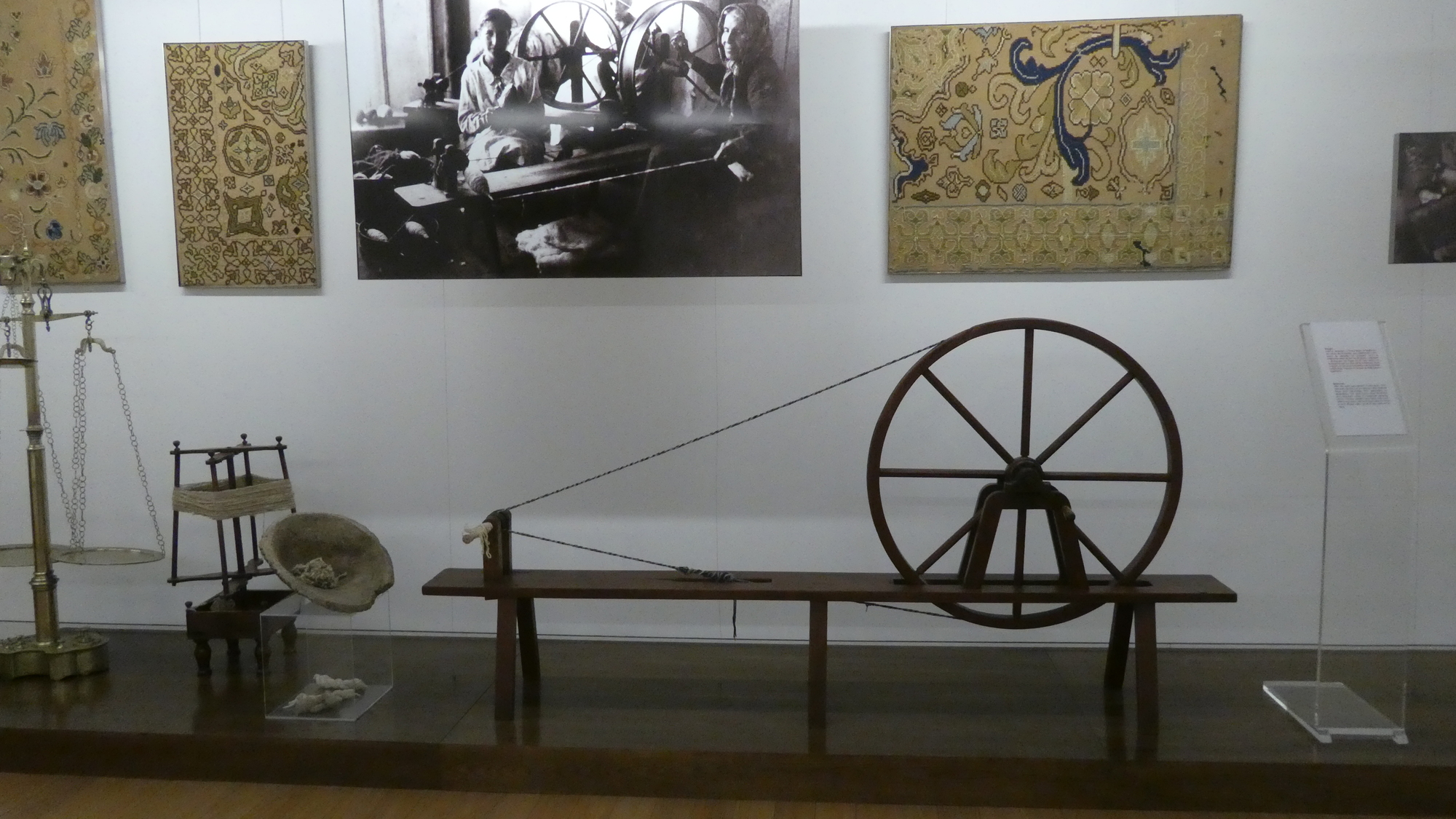 Now that we have seen both ends of the square, a look to one side reveals the carpet museum. We usually do not feel we have time for museums, but since this was also described as the Tourist Information, we went in to get a Camino stamp, at least, and so got drawn in. The museum covered the carpet designs and materials, how the village did the production, the use f local dyestuffs, the sheep and wool processing, the stitching techniques, and so forth. It was a little lost on me, but Dodie is an expert knitter, cross stitcher, and spinner, and it sure was not lost on her.