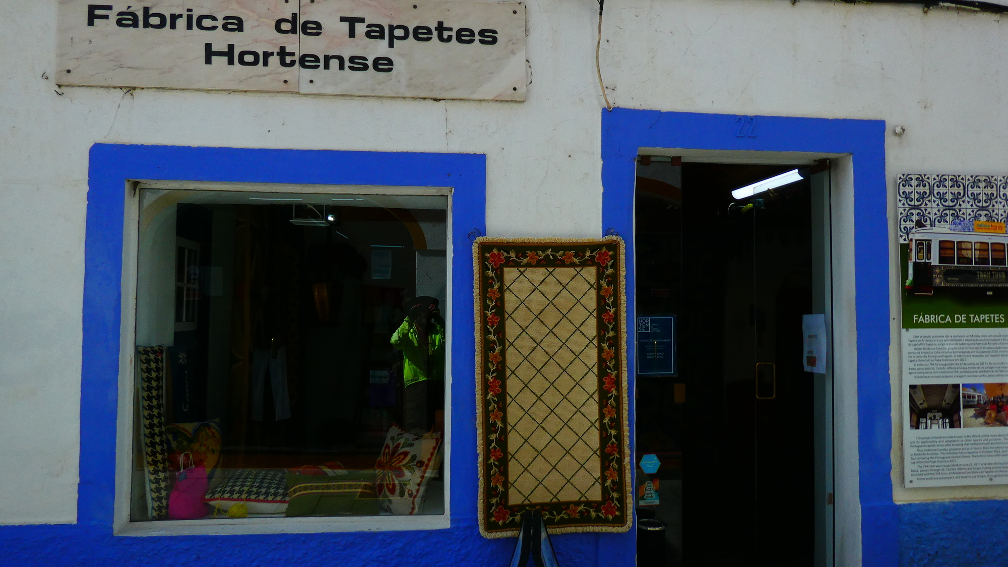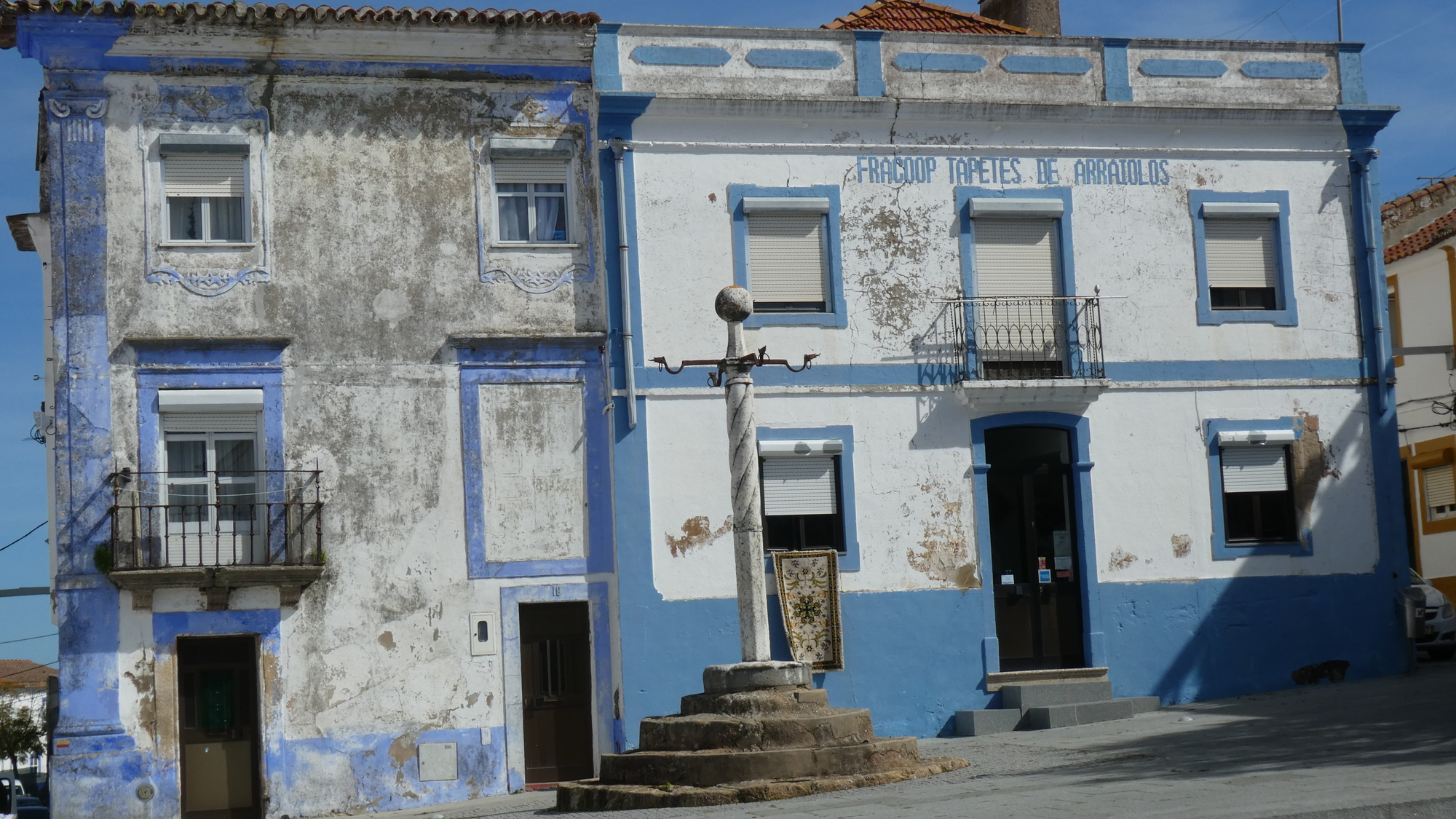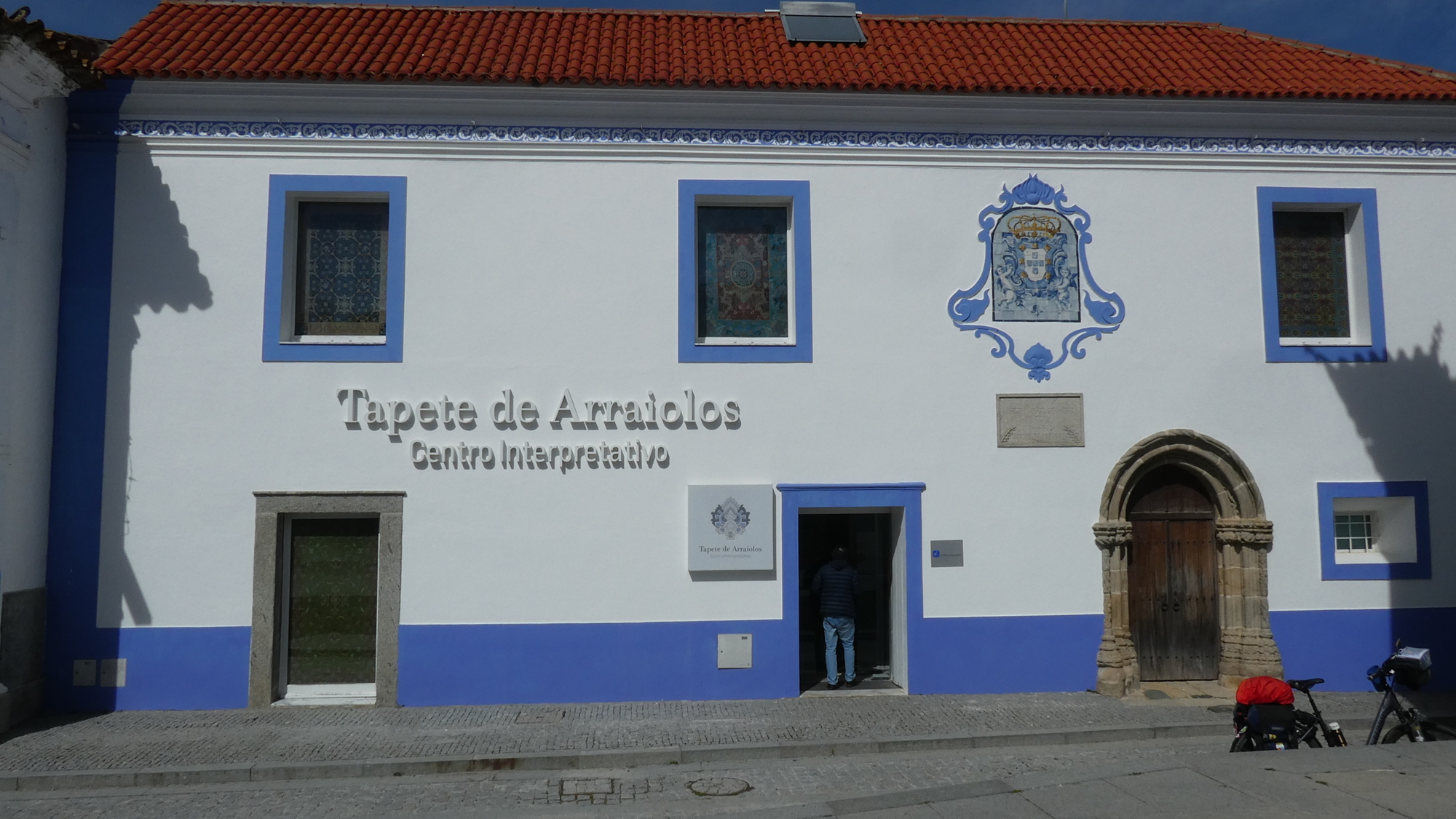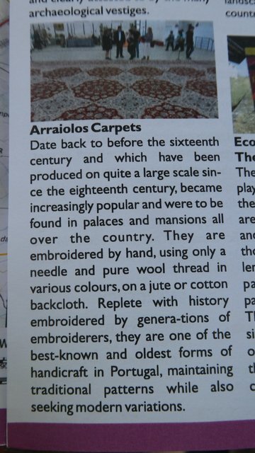 Our route took us through the main square of the town. Despite Dodie having read a little bit, we were unaware of the great thing we were about to discover. This ranks as one of those Grampies' lucky breaks, and here is the thing: In 1496 Portugal's Muslims were expelled from the country, unless they would convert to Christianity. At the time, Lisbon had a Muslim rug making industry, rooted in designs and methods from Morocco. Also the town of Arraiolo had the facility to do dying. The Lisbon Muslims migrated to here (a religiously more tolerant area), and kick started a rug industry that last until the 19th century, when it declined. But it had a renaissance in the 20th century, and remains famous today. All this according to a pamphlet we picked up at a recently opened museum and interpretation centre, located in the central square.