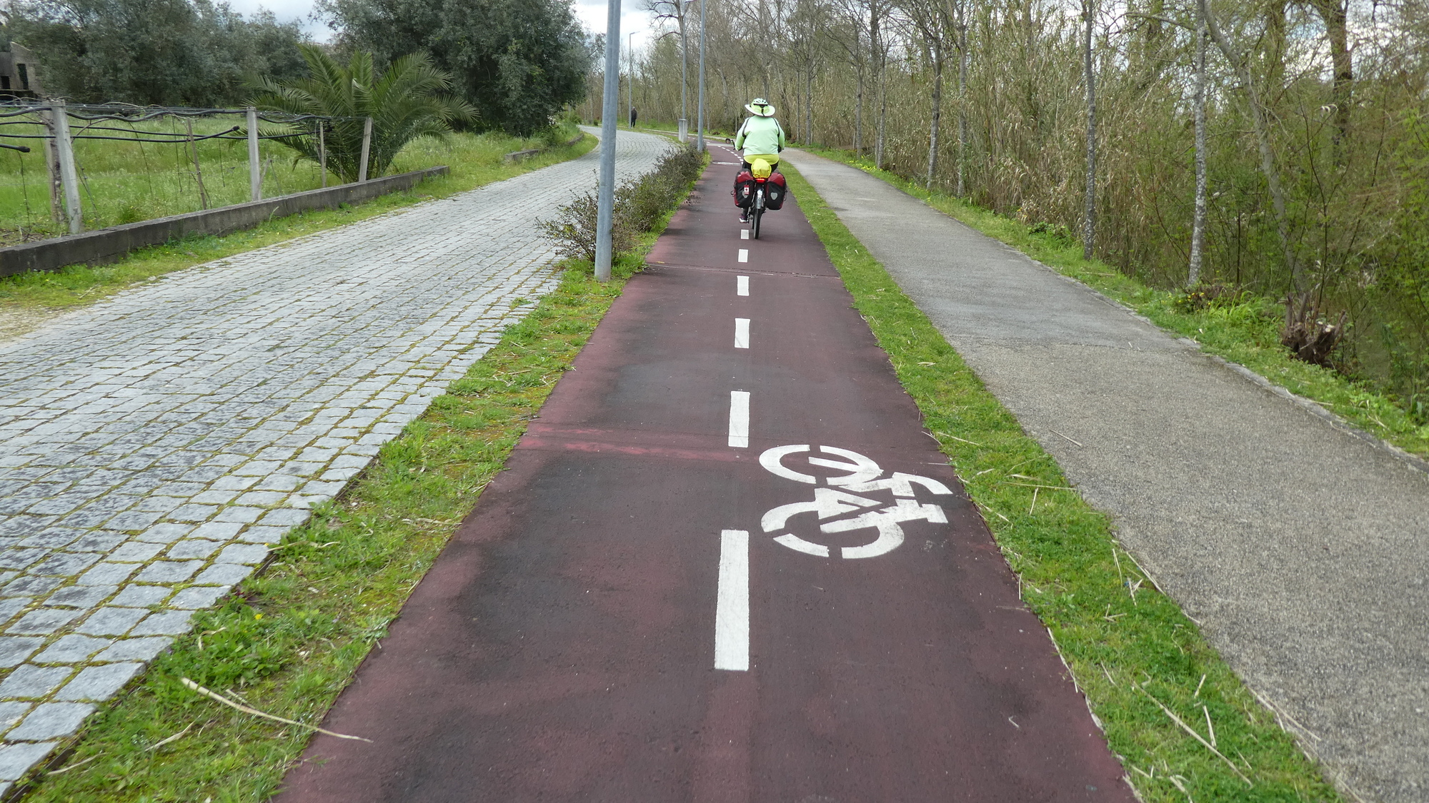 Closer to town, some landscape architect changed the bike path surface to pavers. But these were poorly installed, and the surface had developed longitudinal cracks. I got to watch Dodie's bike go skittering way off course on one of these, but was glad that she kept her balance.